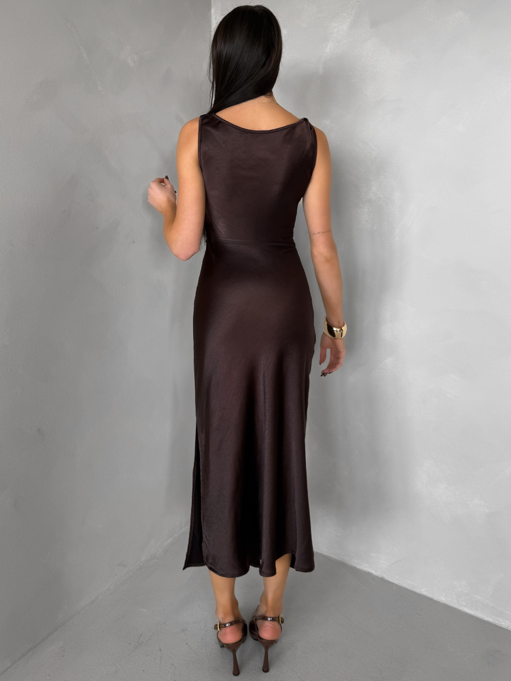 Tmavo hnedé saténové midi šaty ZERALA so sponou