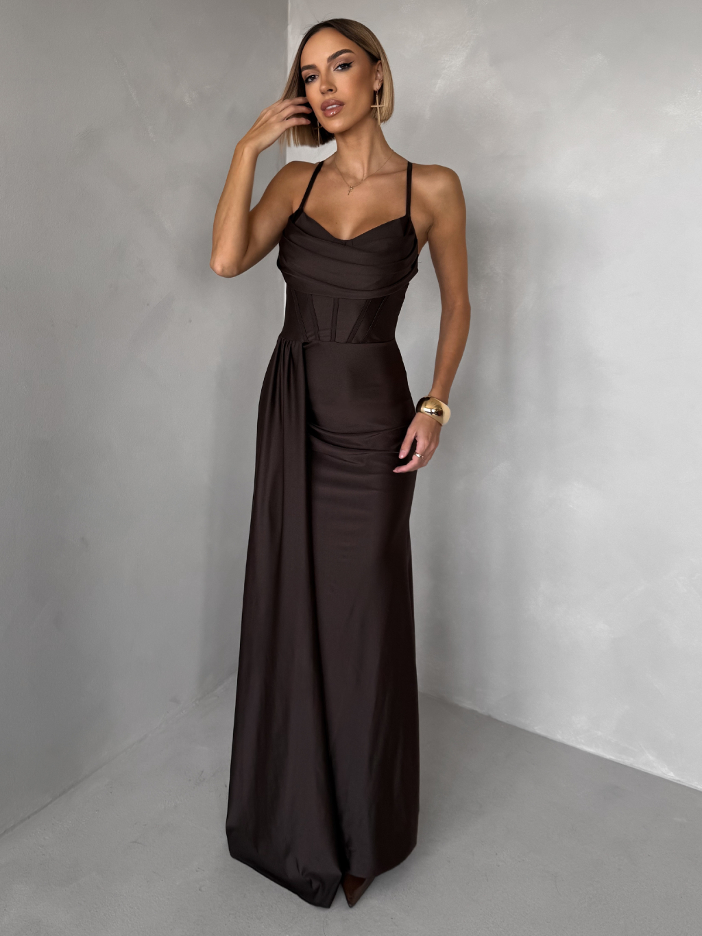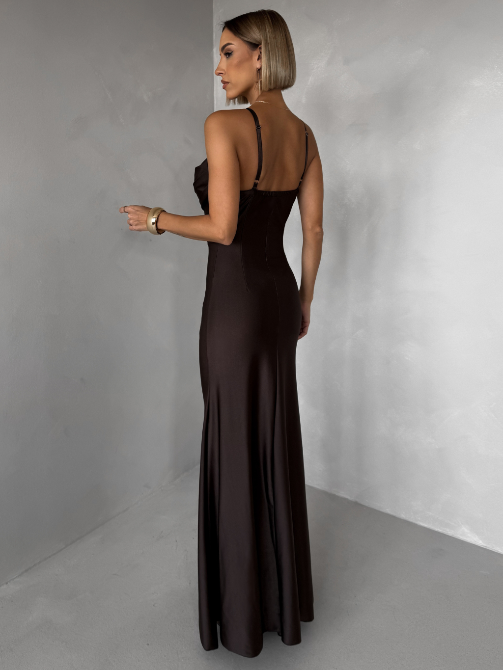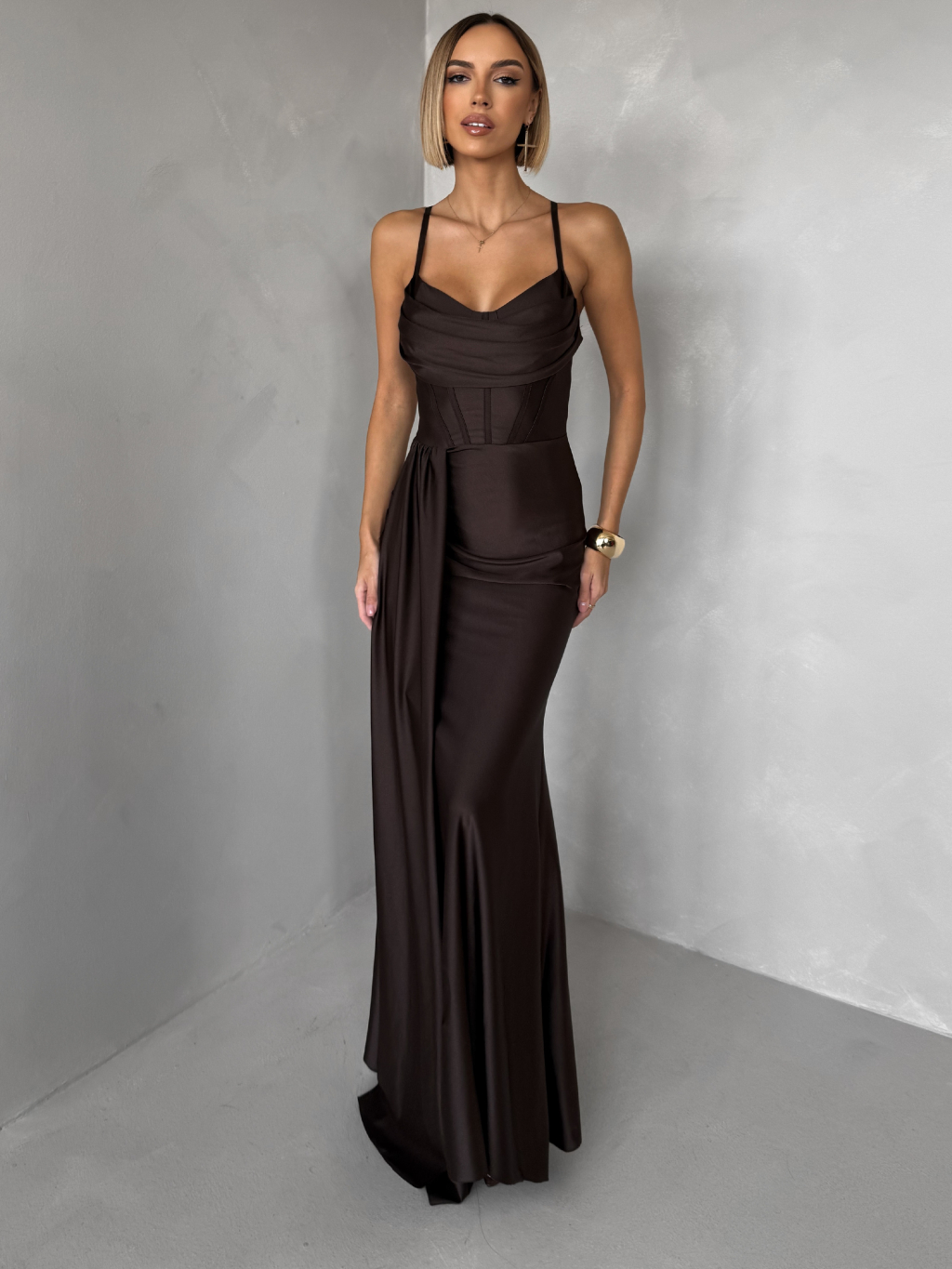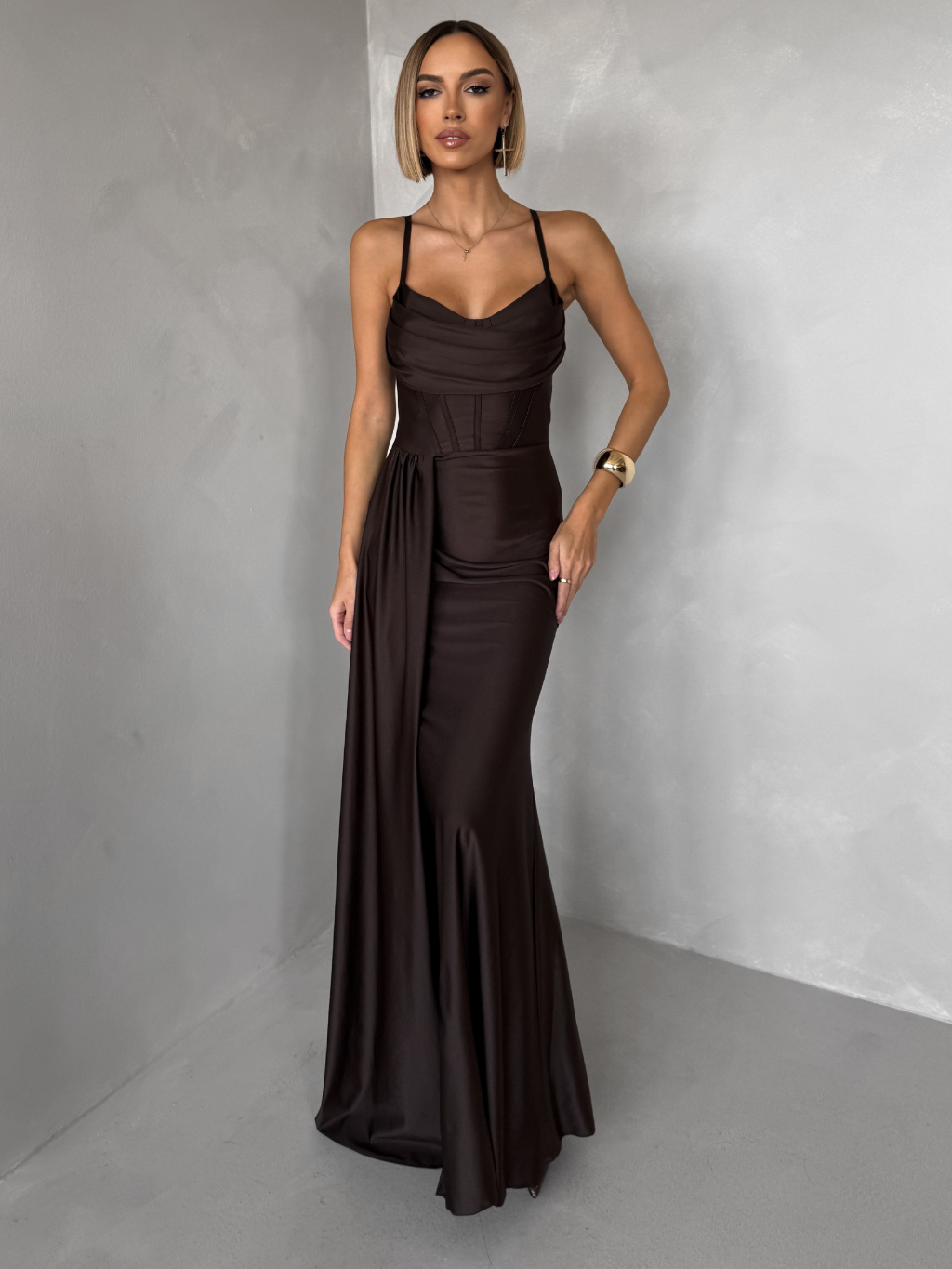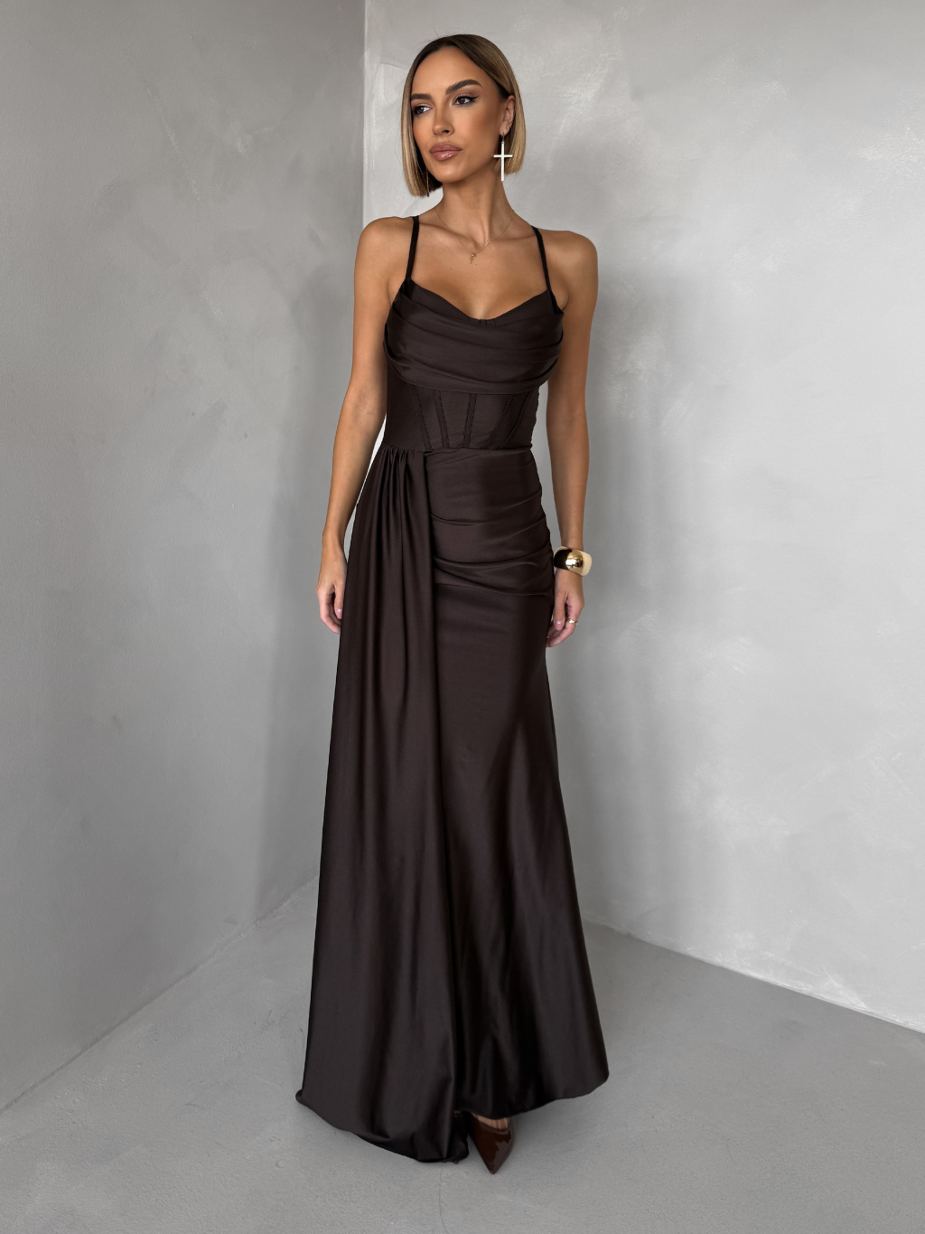 Tmavo hnedé spoločenské dlhé šaty SATIN