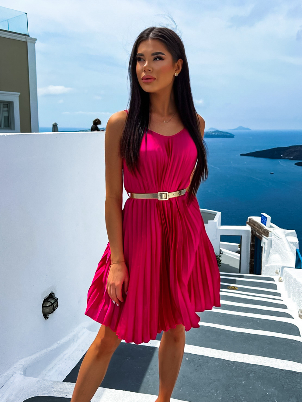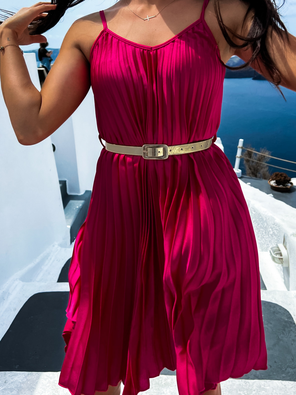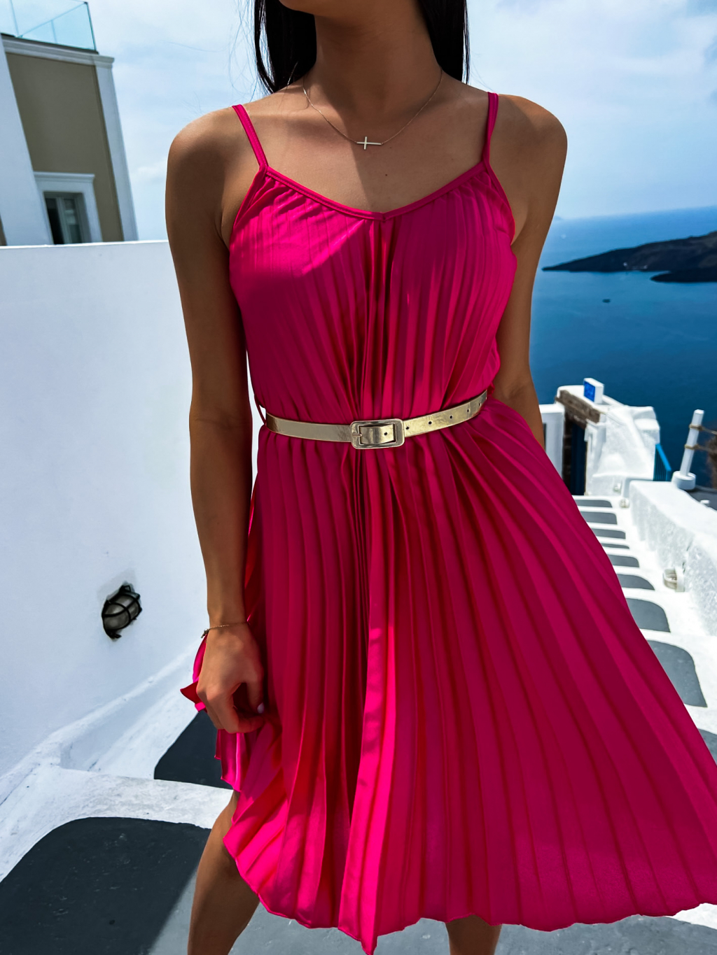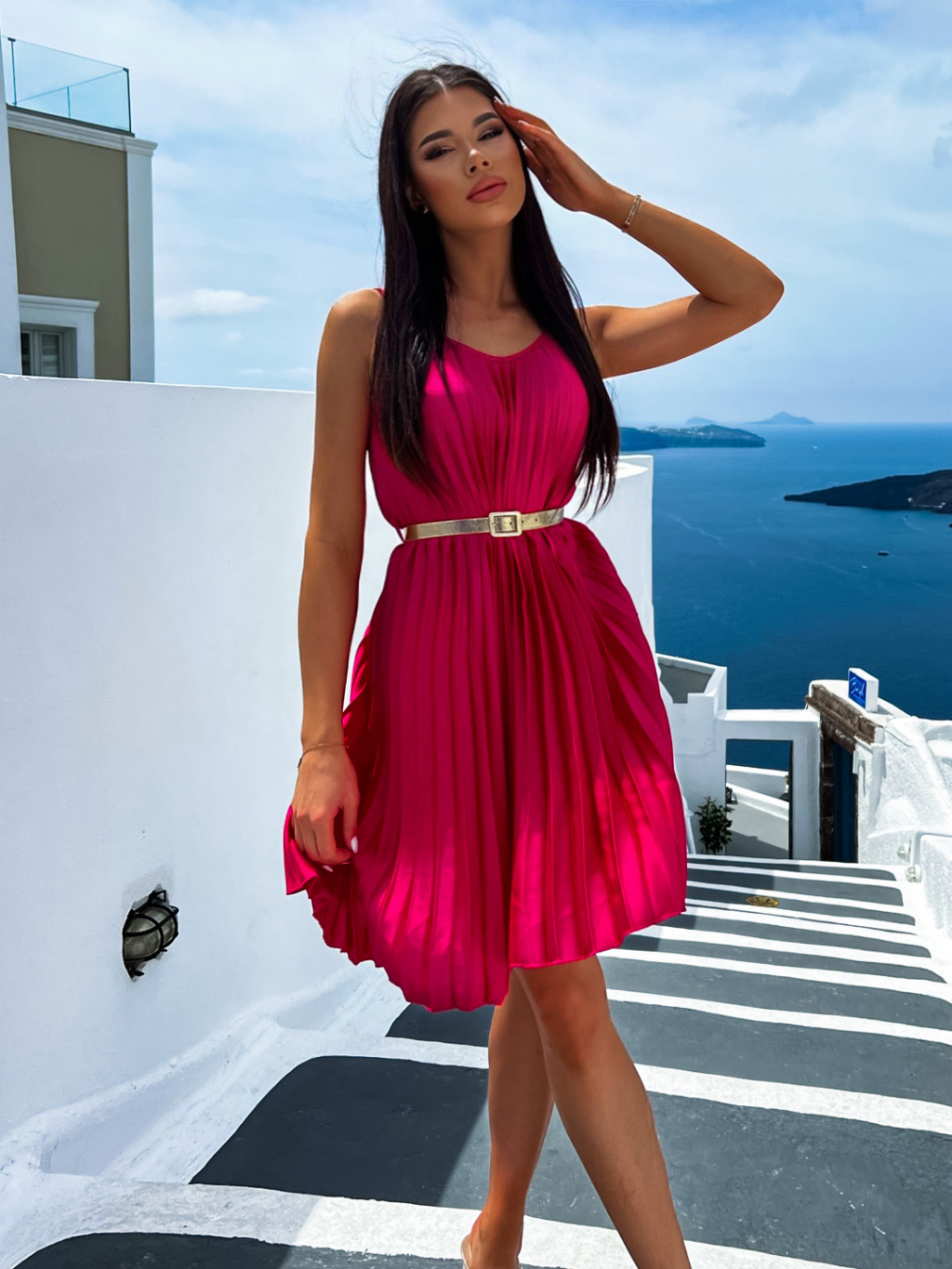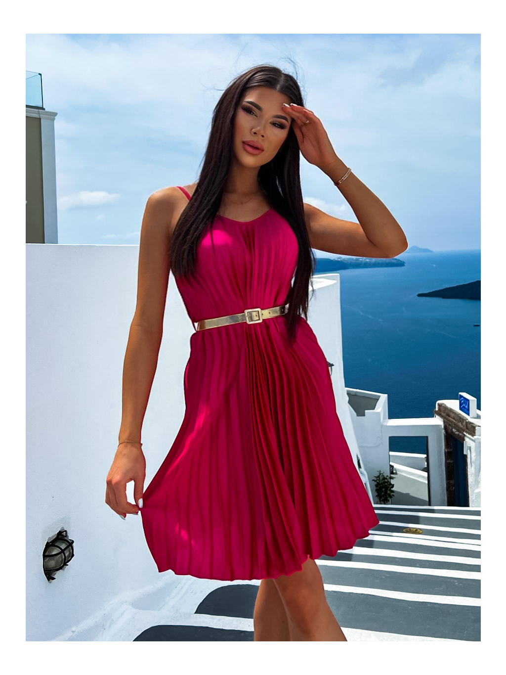Tmavo ružové lesklé plisované šaty CLAURA so zlatým opaskom