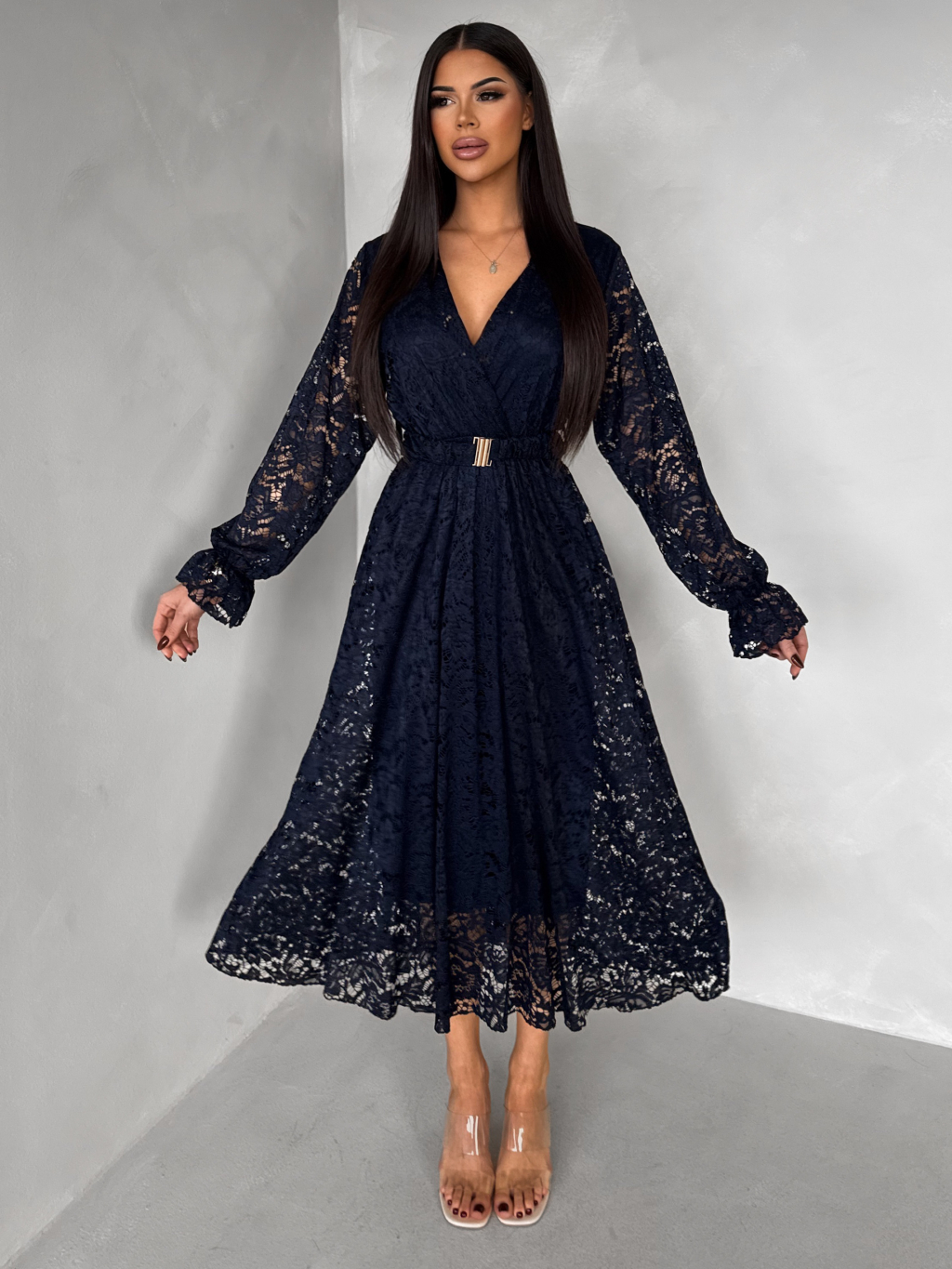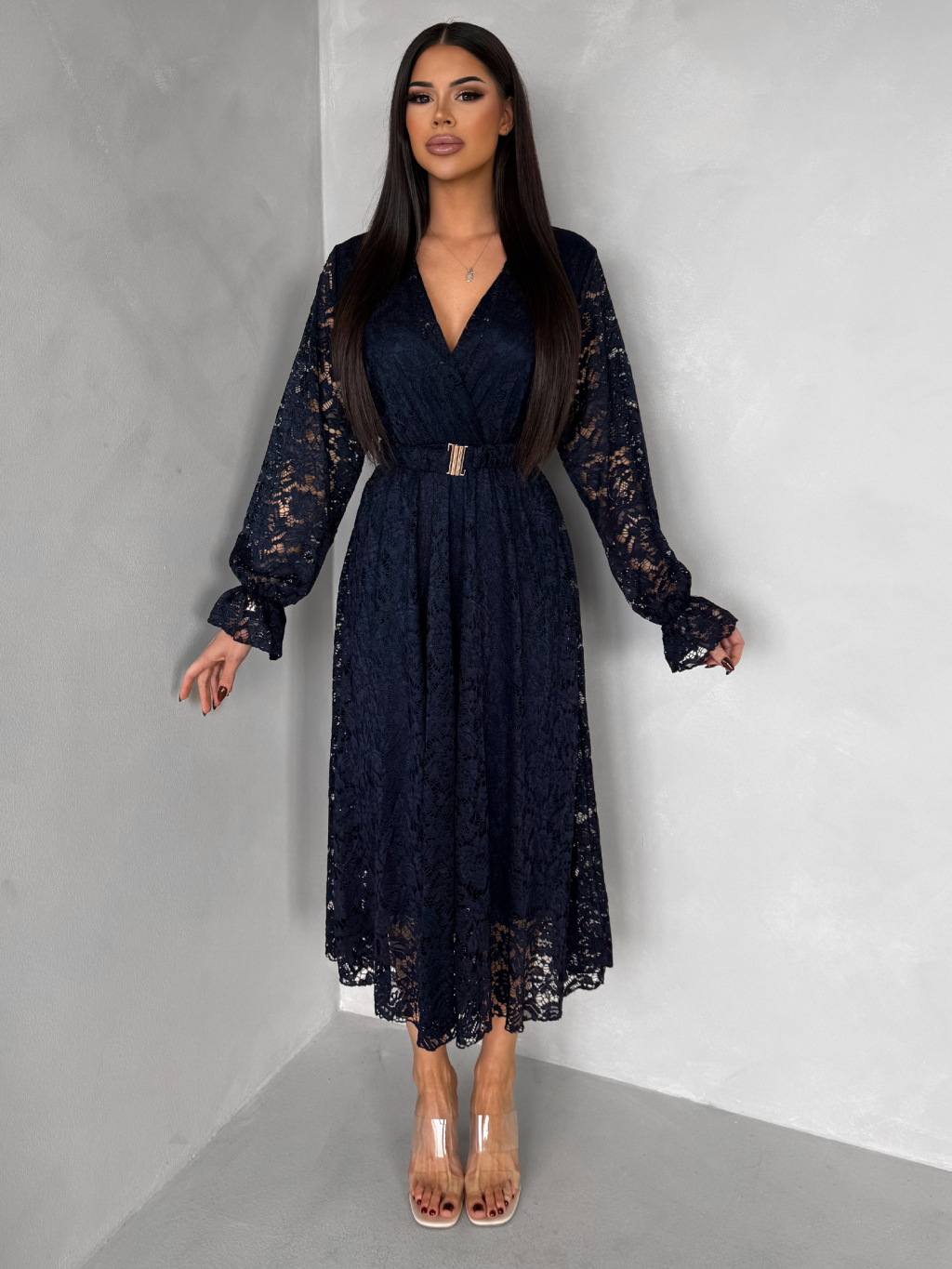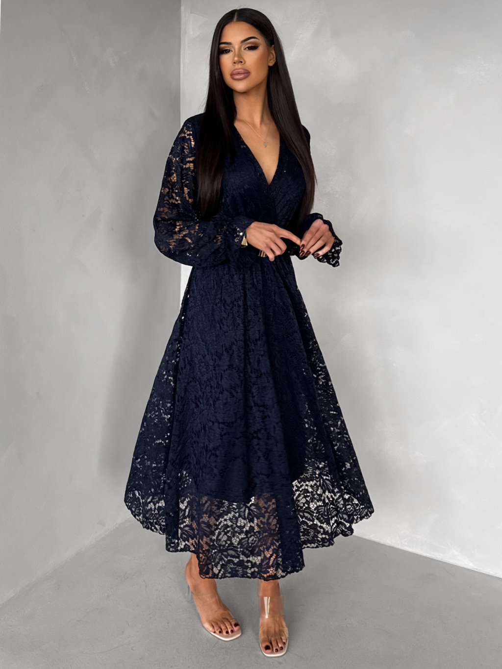 Tmavomodré krajkové spoločenské midi šaty LIRONDE