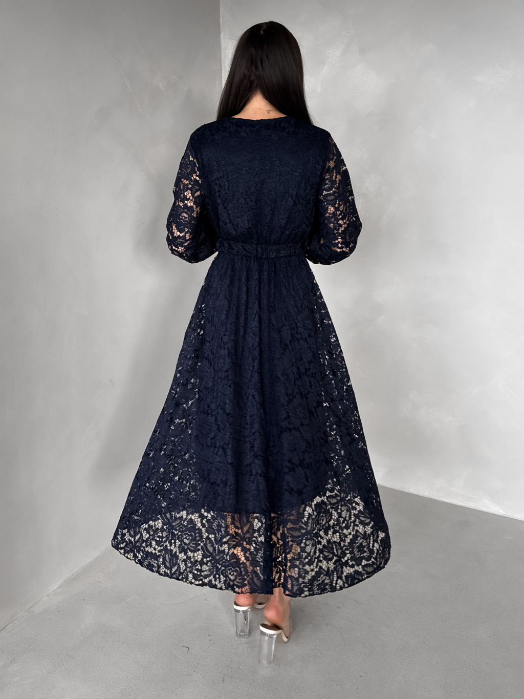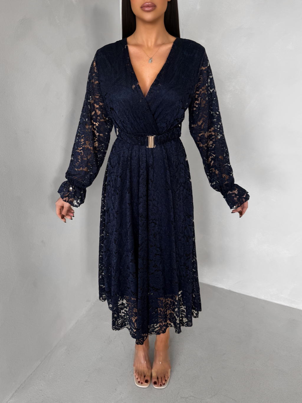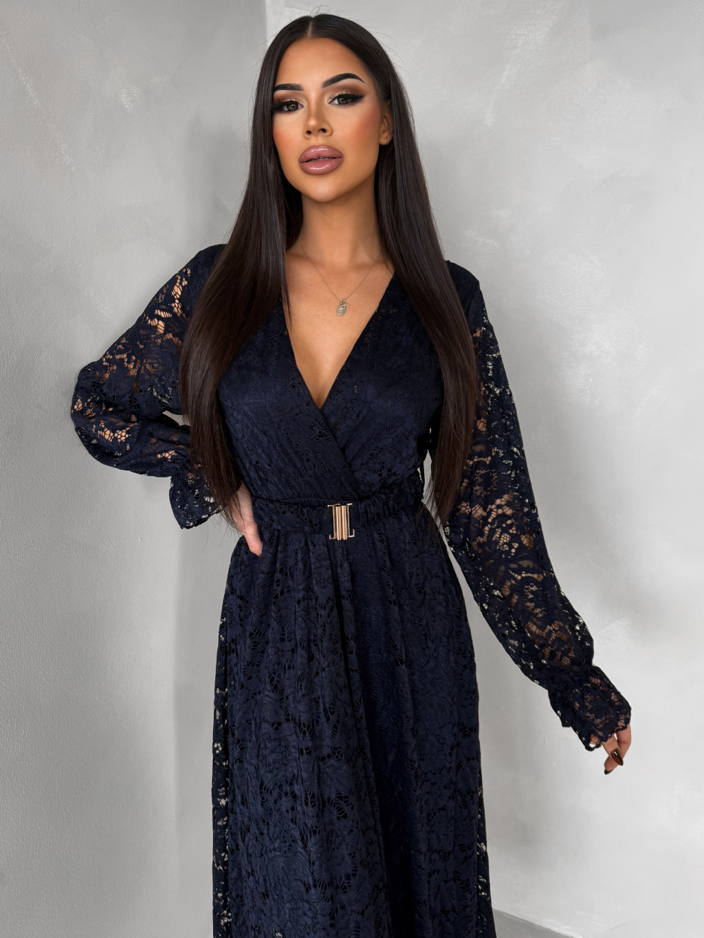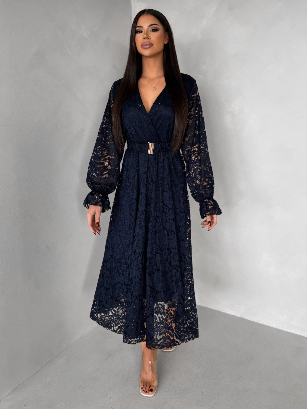 Tmavomodré krajkové spoločenské midi šaty LIRONDE