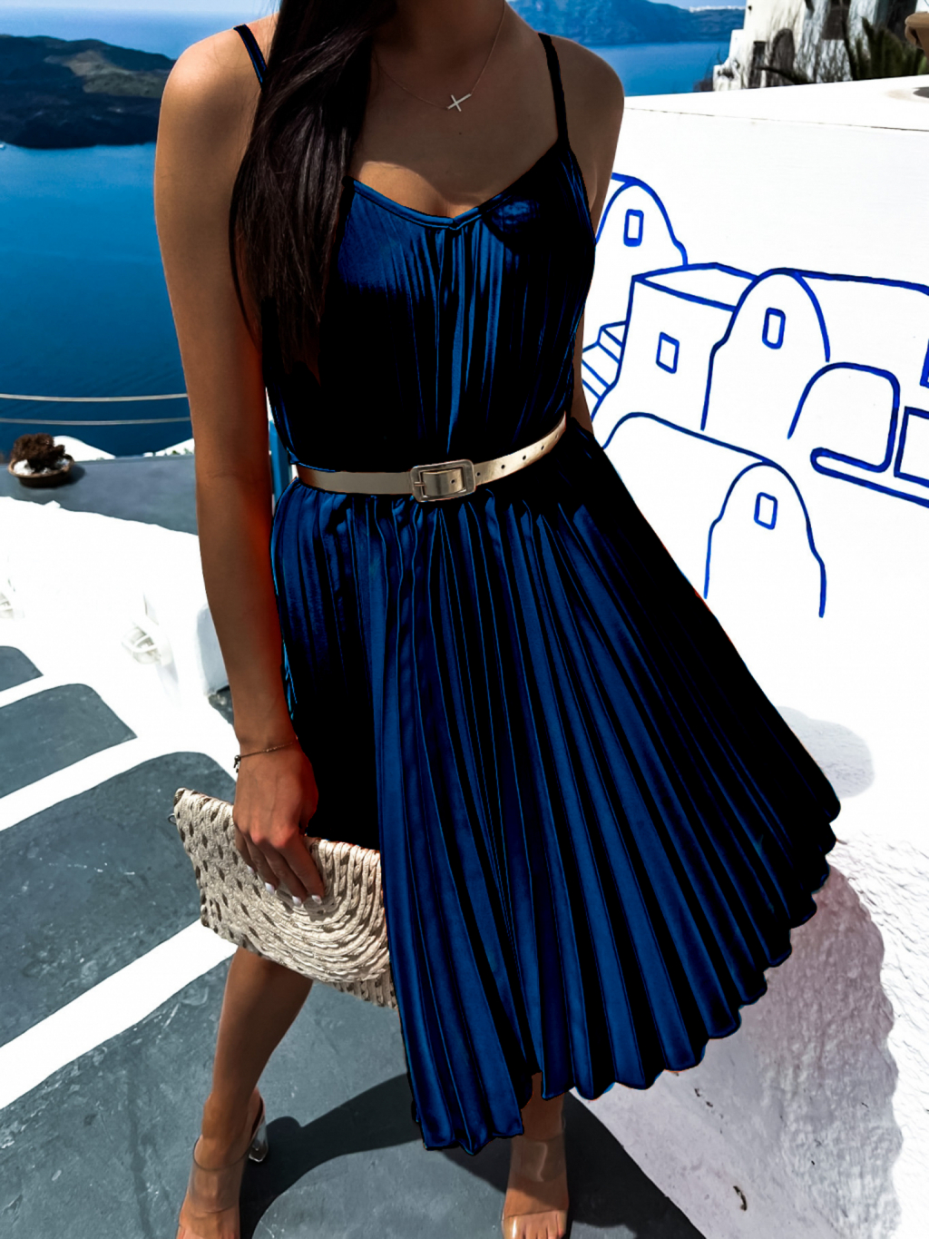Tmavomodré lesklé plisované šaty CLAURA so zlatým pásikom