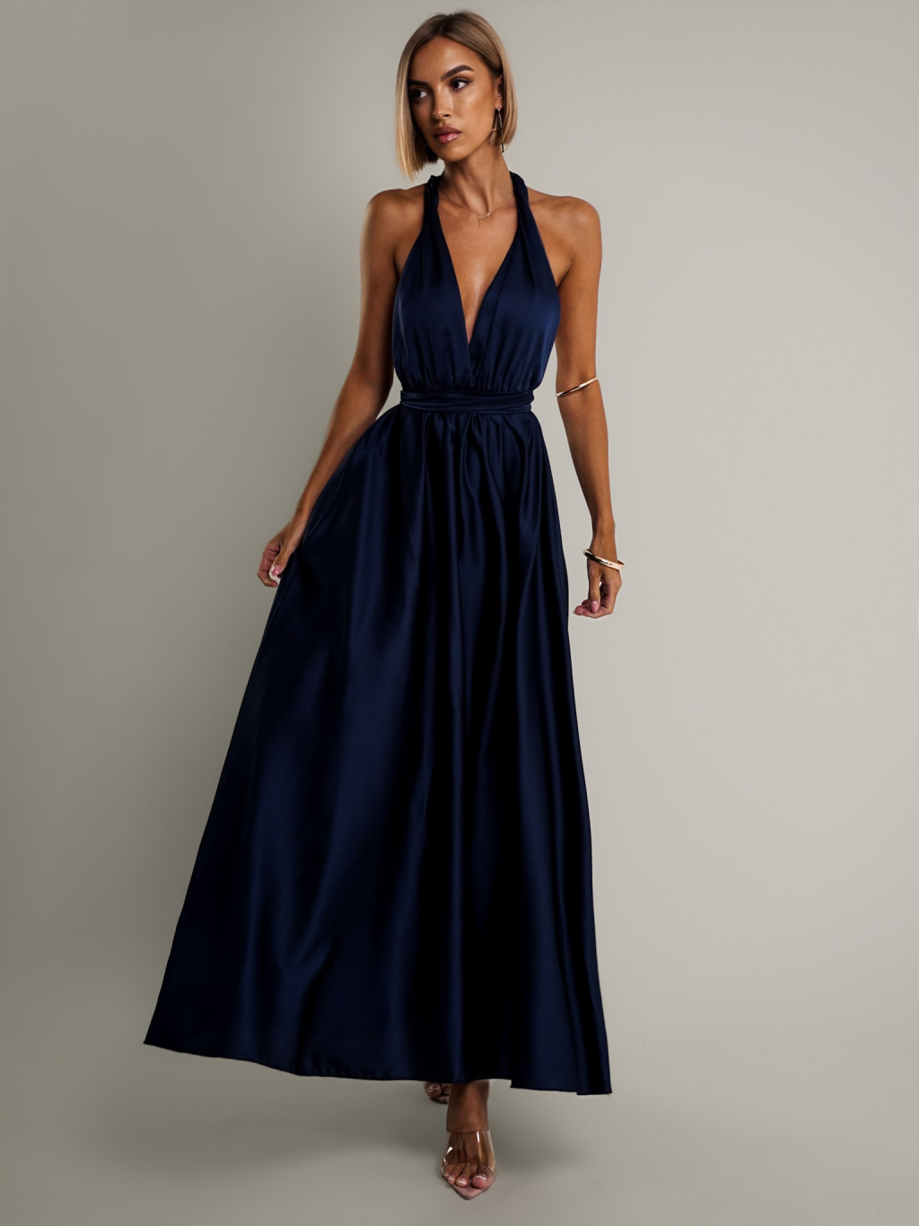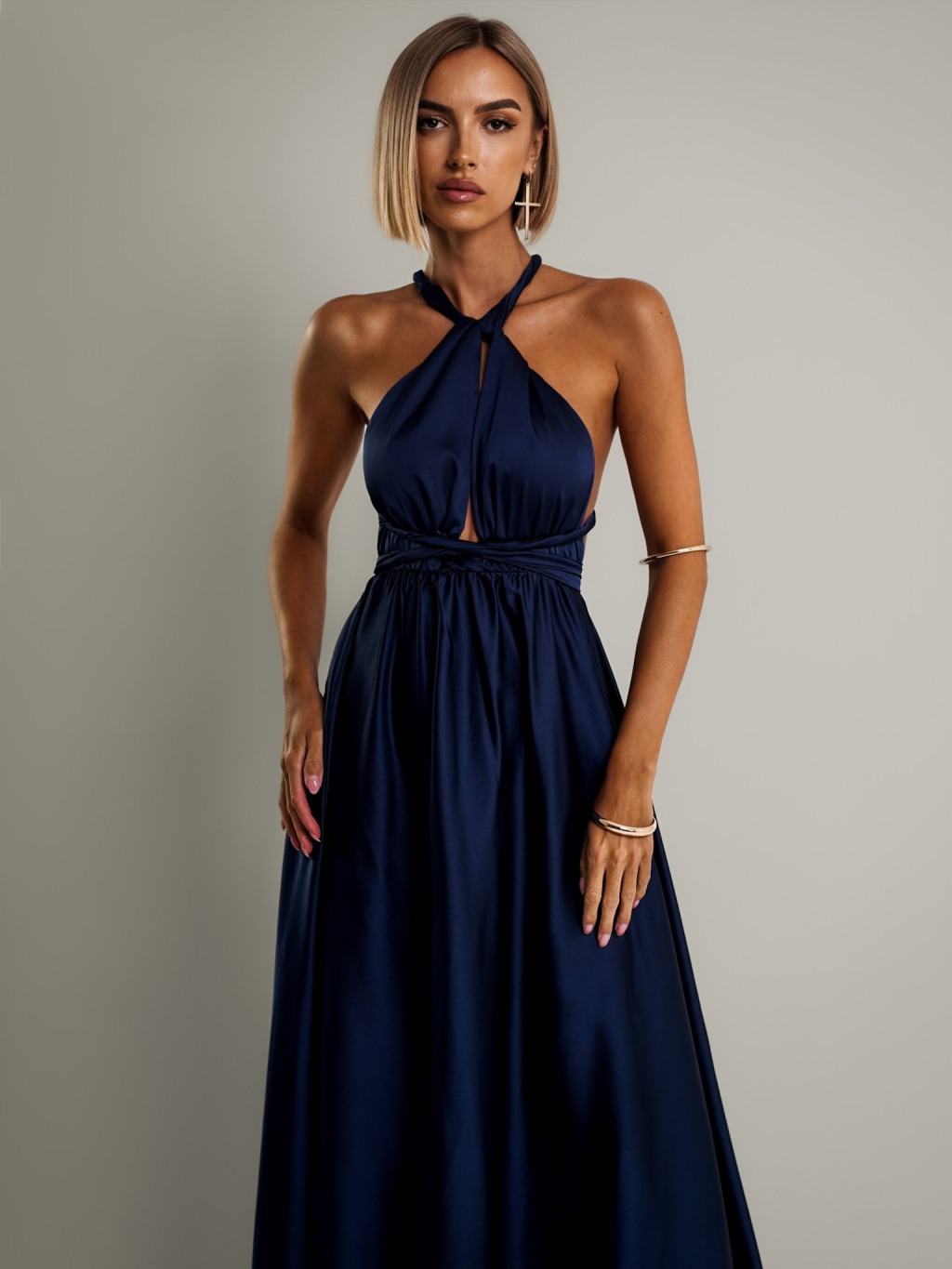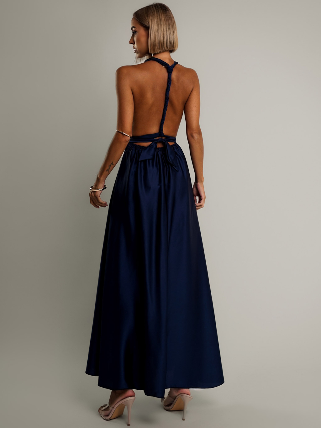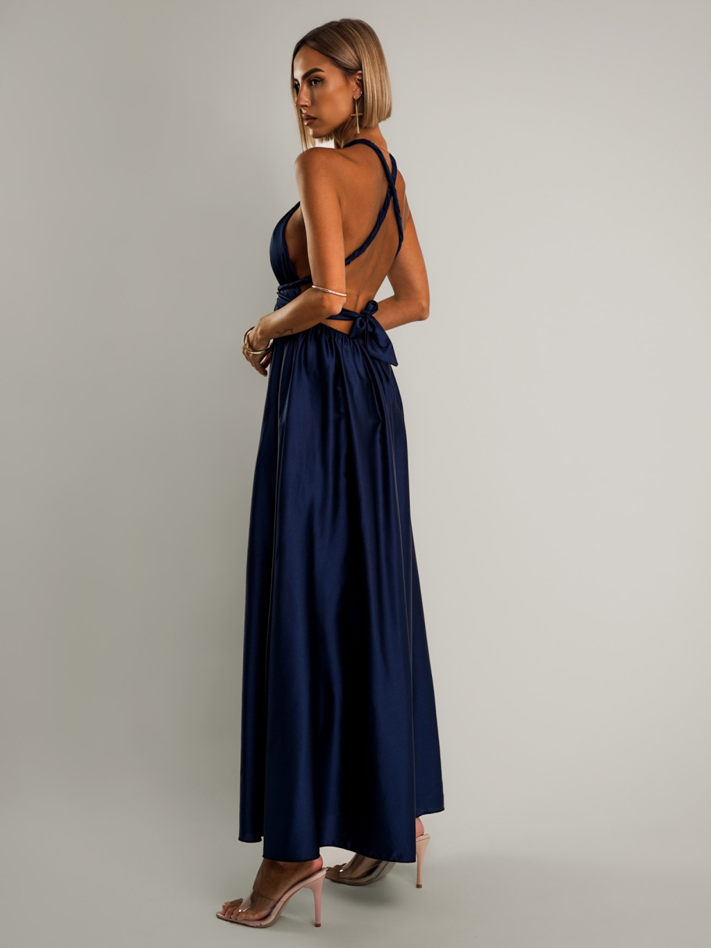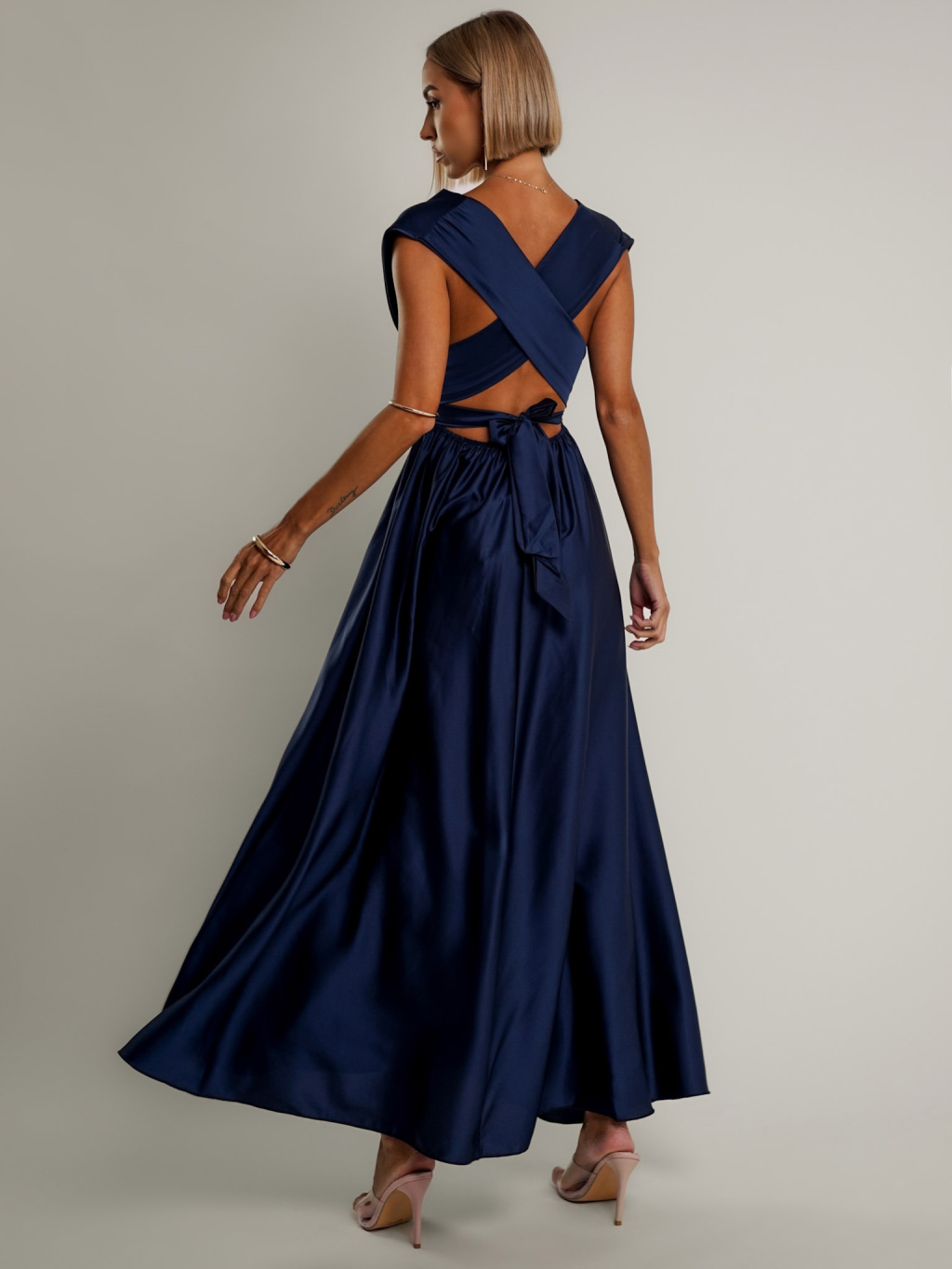 Tmavomodré saténové šaty VALERDY s variabilným viazaním / bez rázporku