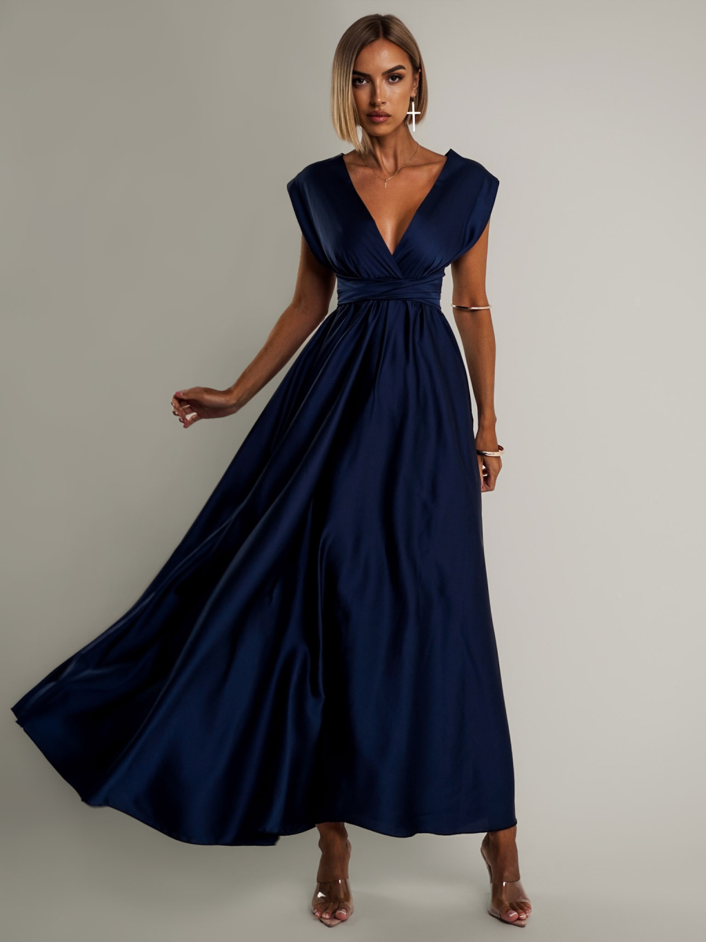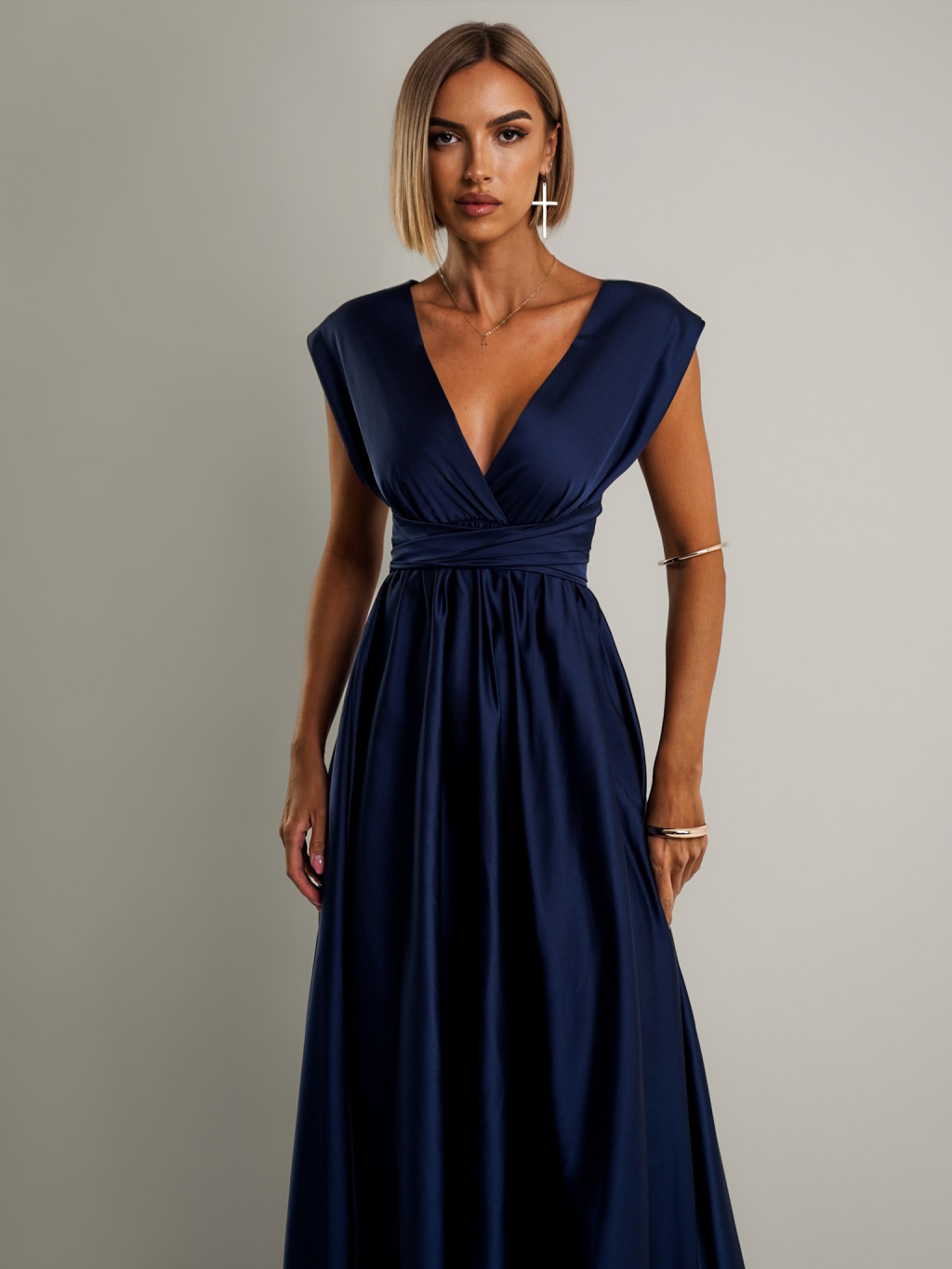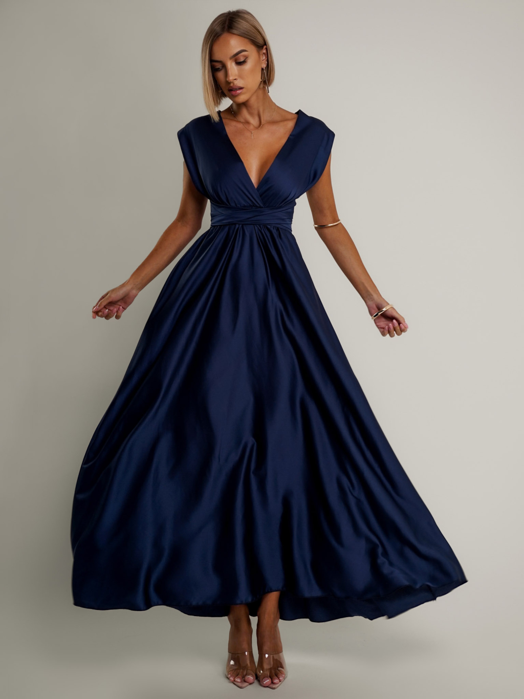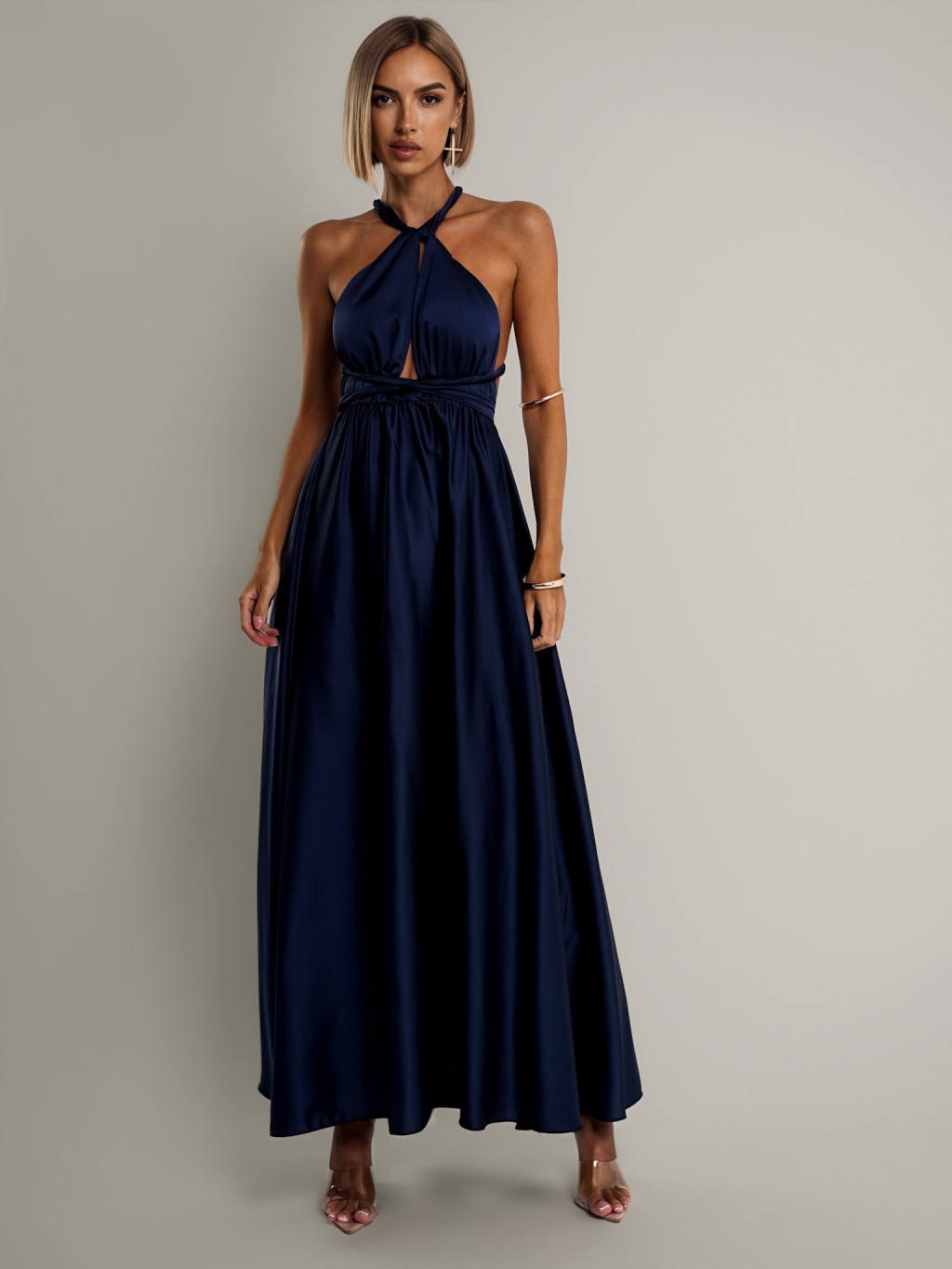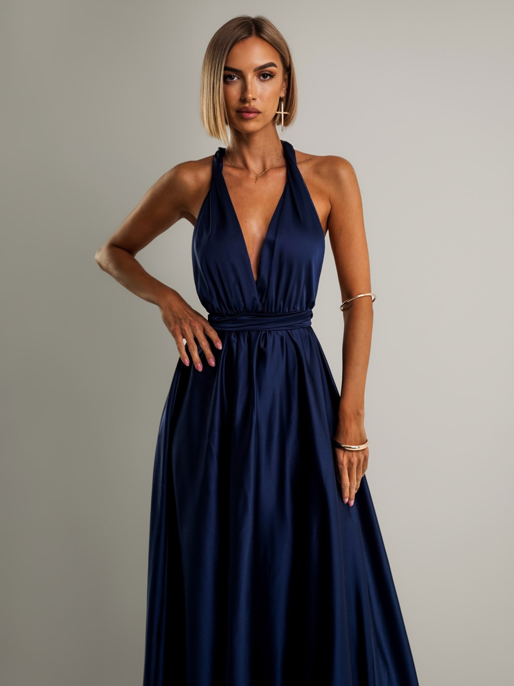 Tmavomodré saténové šaty VALERDY s variabilným viazaním / bez rázporku