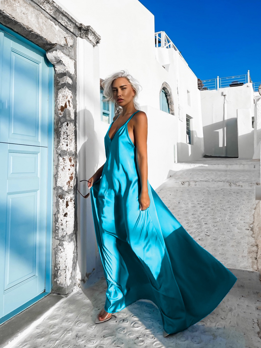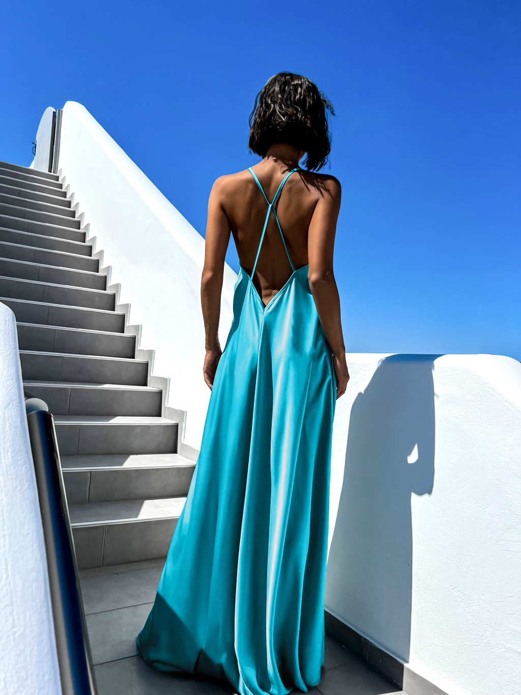 Tyrkysové dlhé lesklé šaty HAYLEY