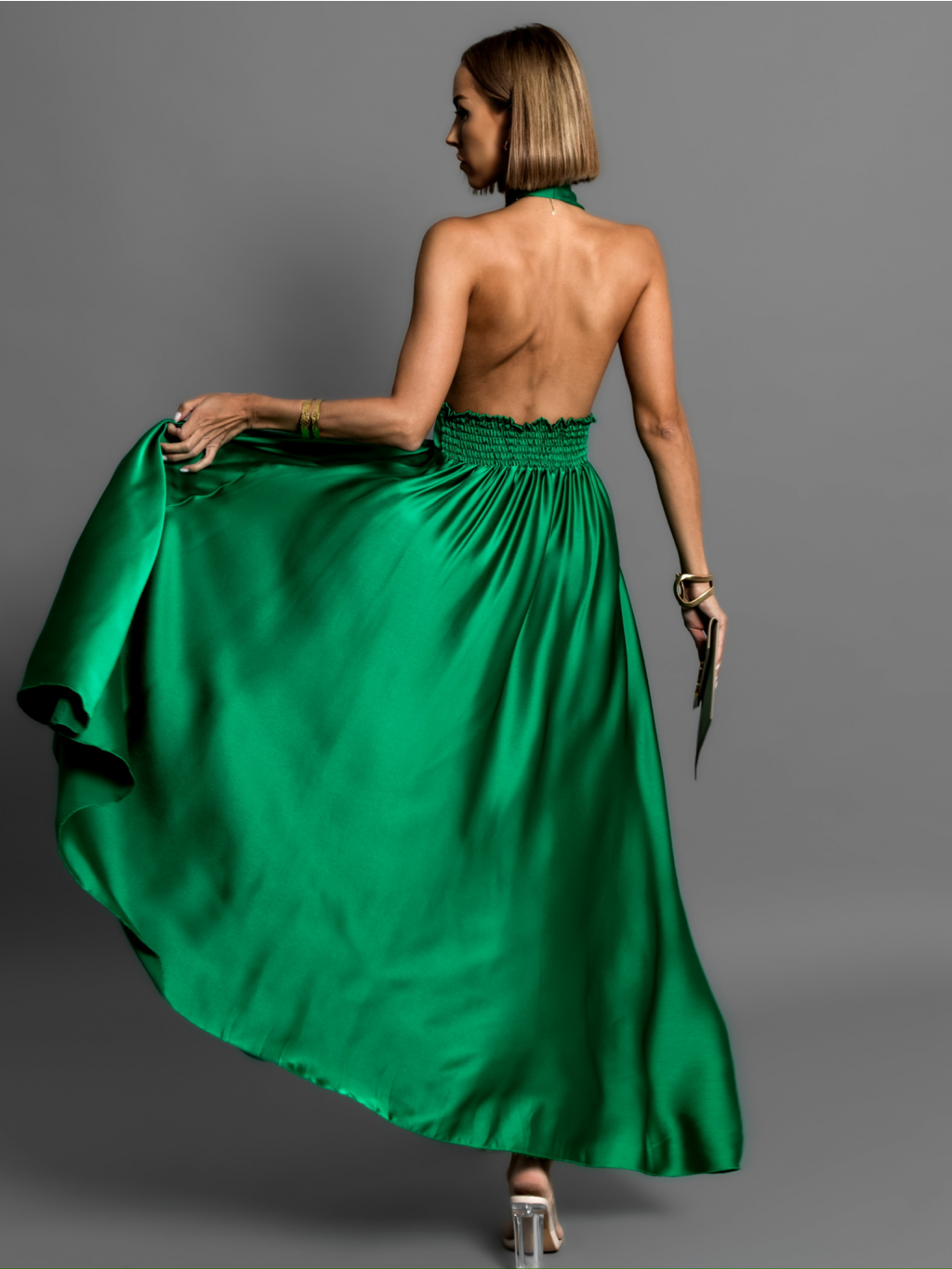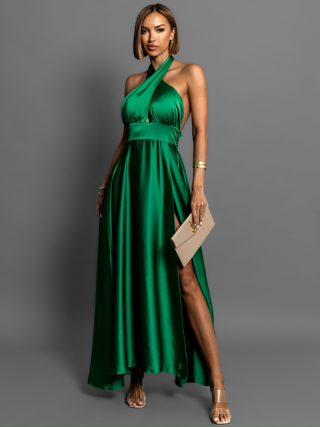 Zelené dlhé elegantné lesklé šaty TARRISA s rázporkom