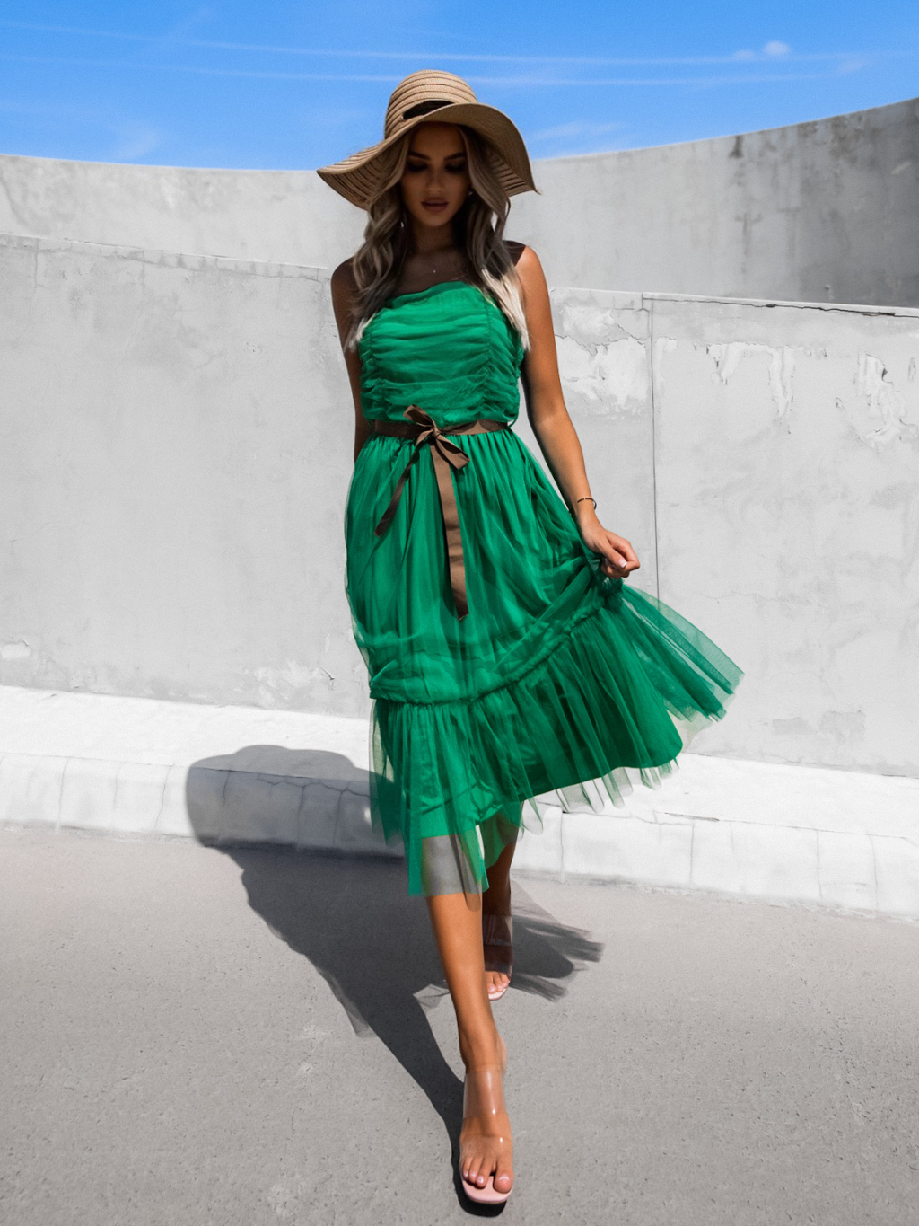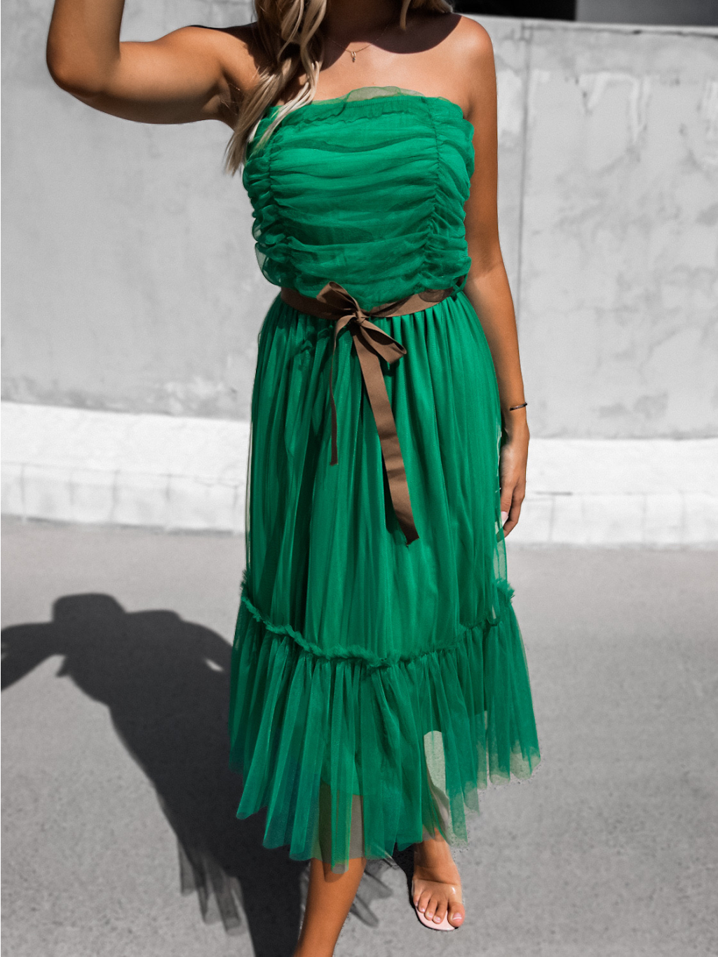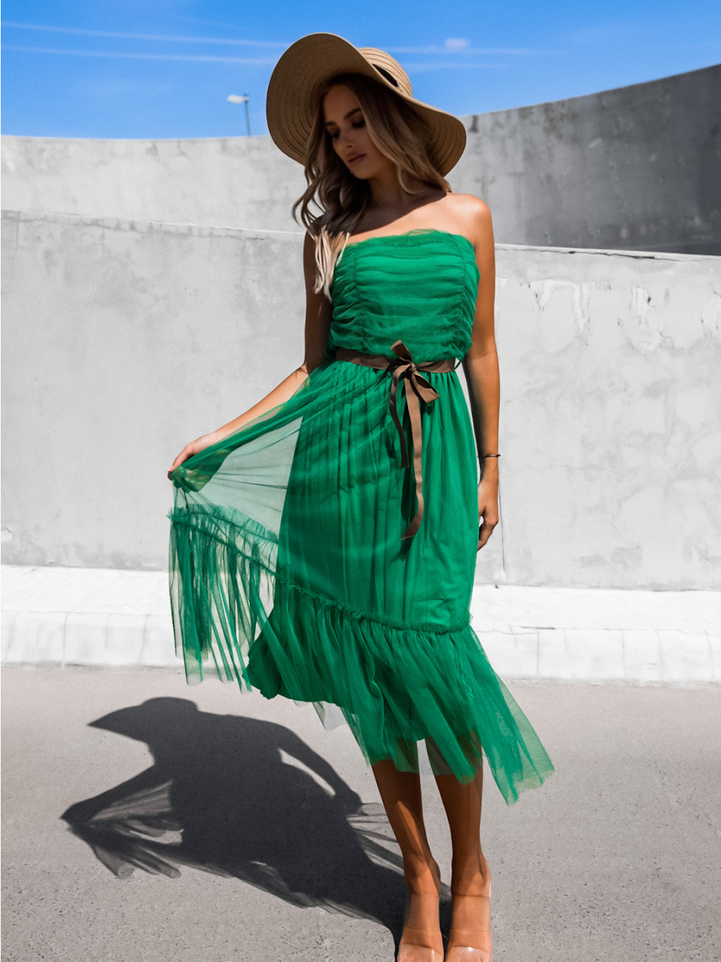 Zelené nariasené tylové šaty CANAPES s volánom