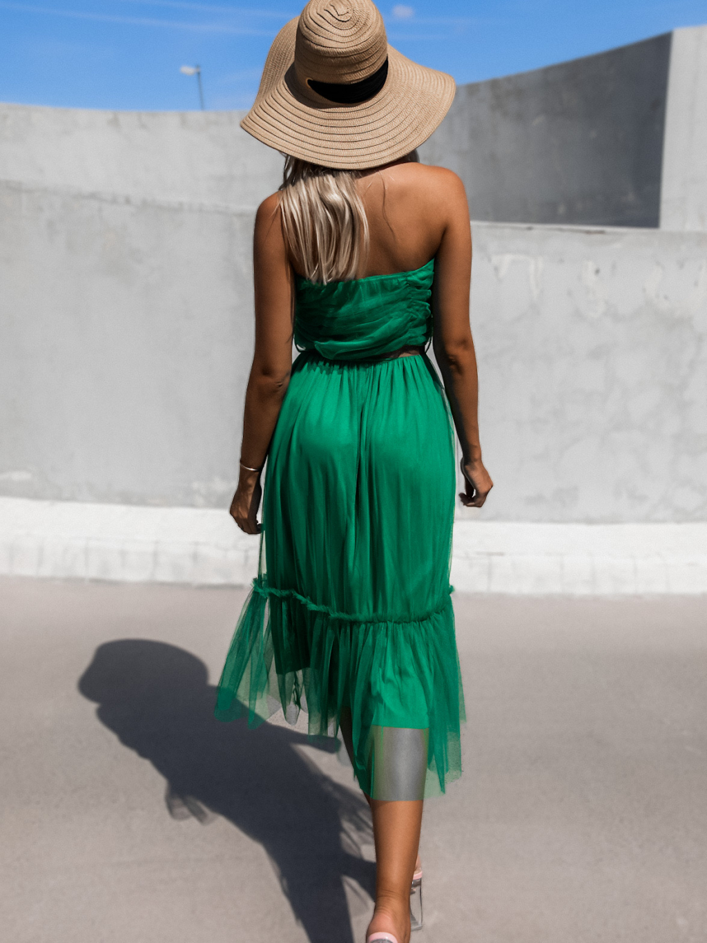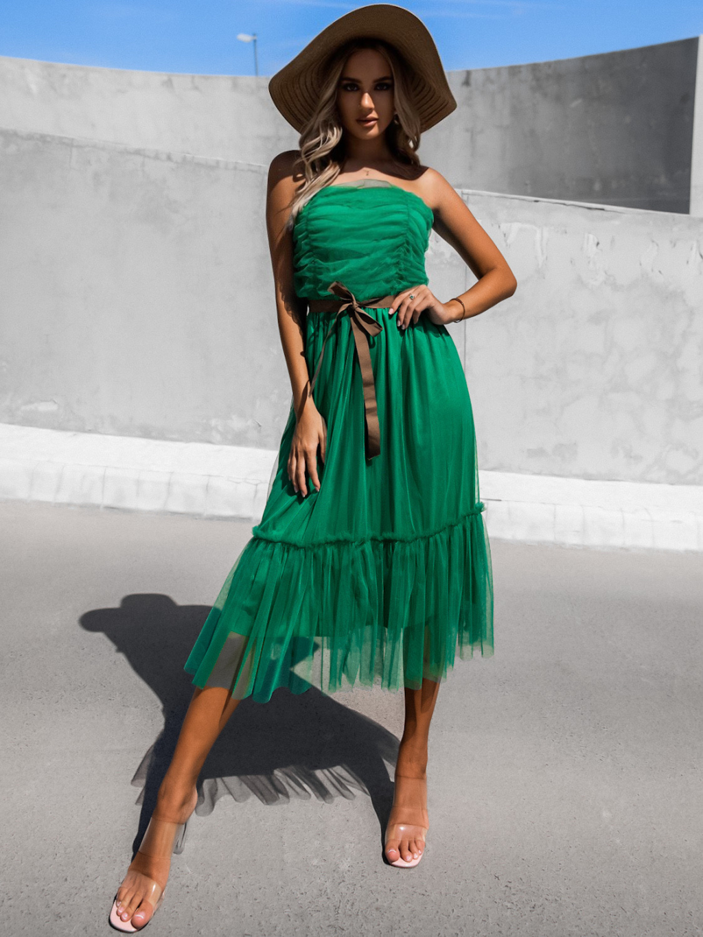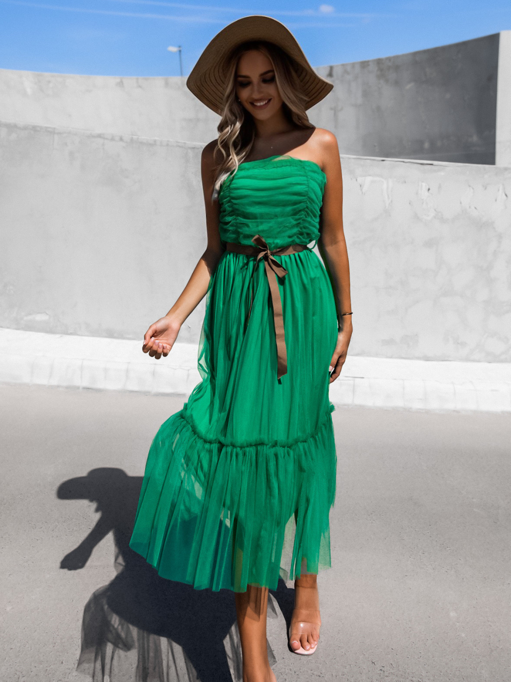 Zelené nariasené tylové šaty CANAPES s volánom