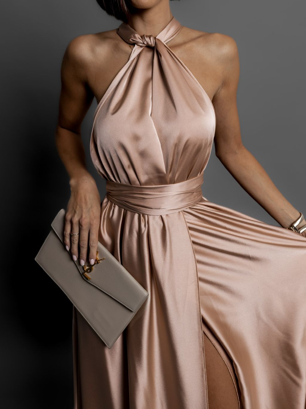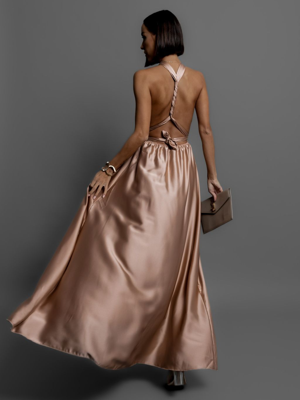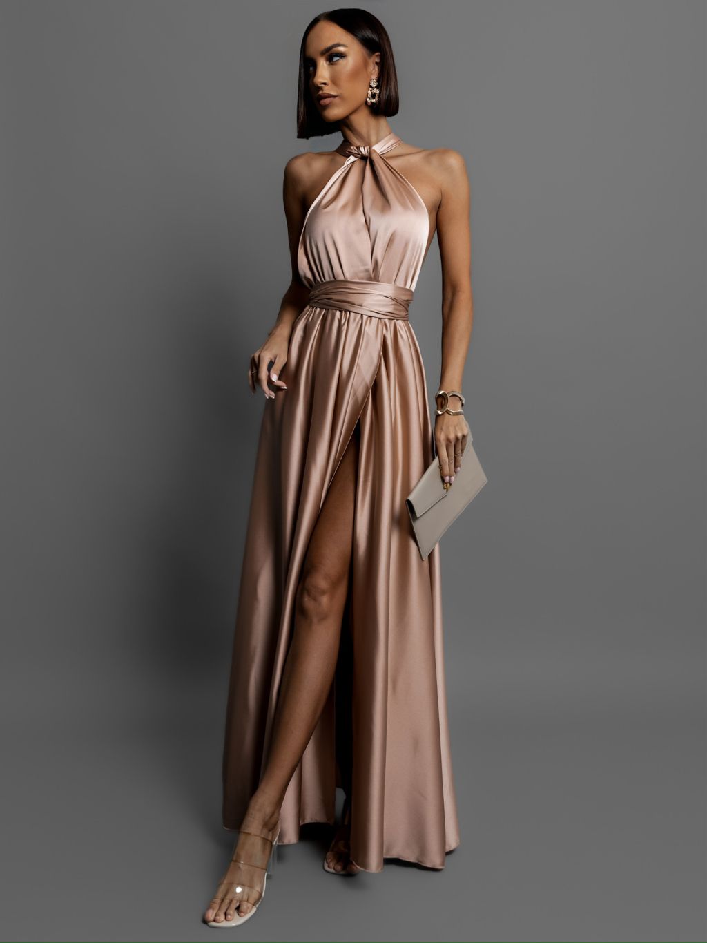 Zlaté lesklé šaty VALERDI s variabilným viazaním / s rázporkom