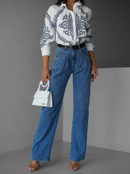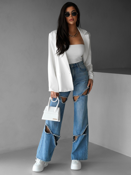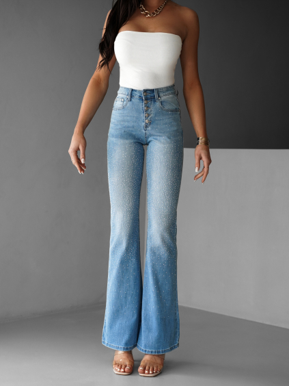 Modré štýlové široké straight džínsy HAZELA s kamienkami