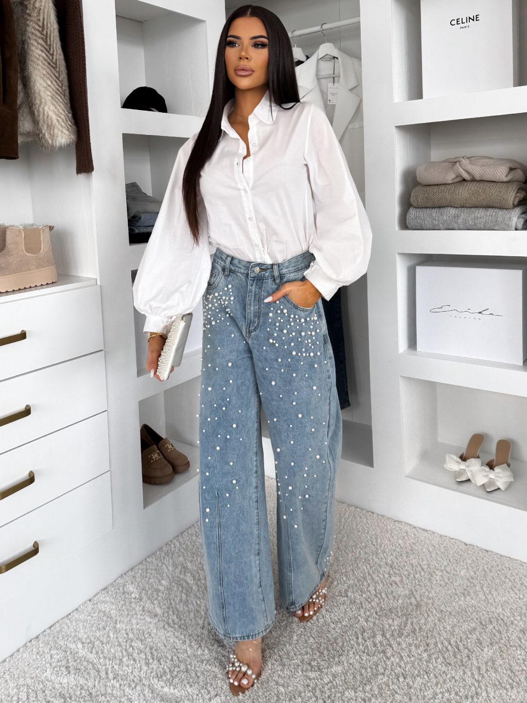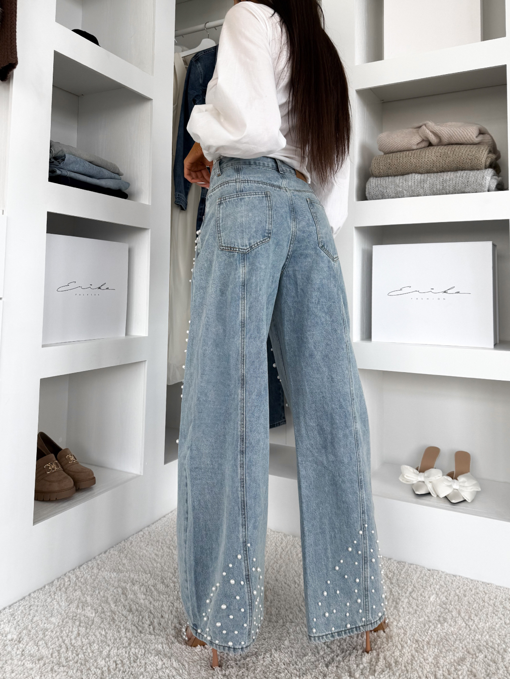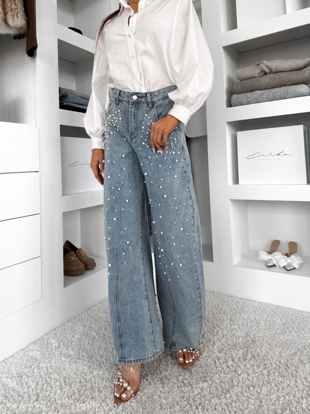 Modré široké štýlové baggy džínsy BEYOND s perličkami