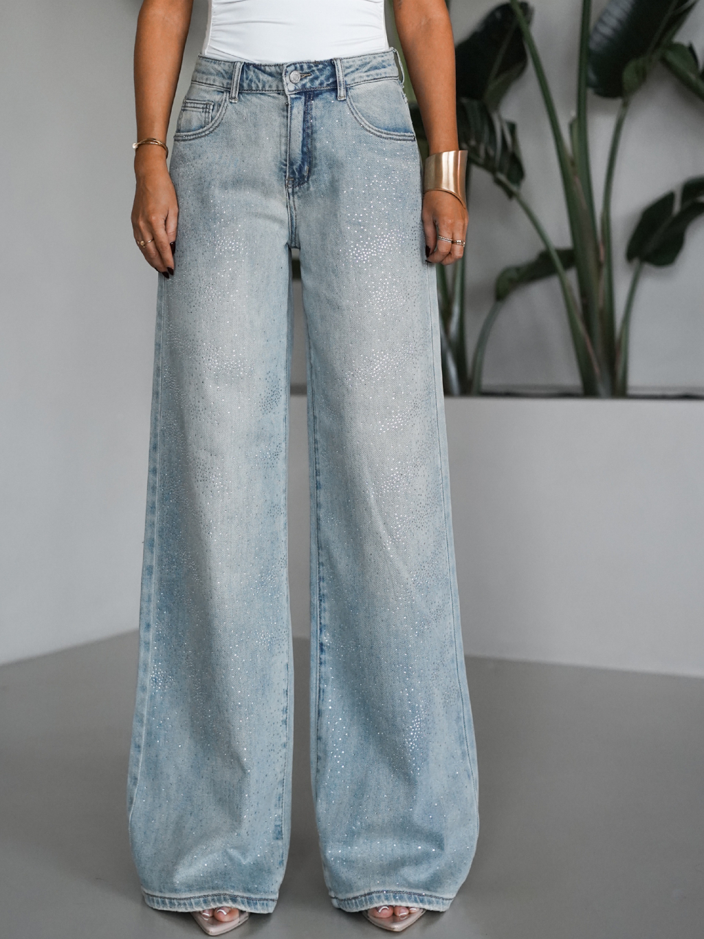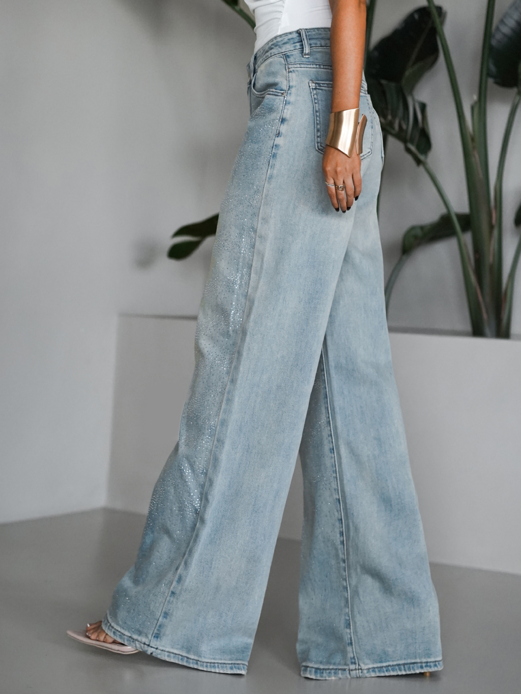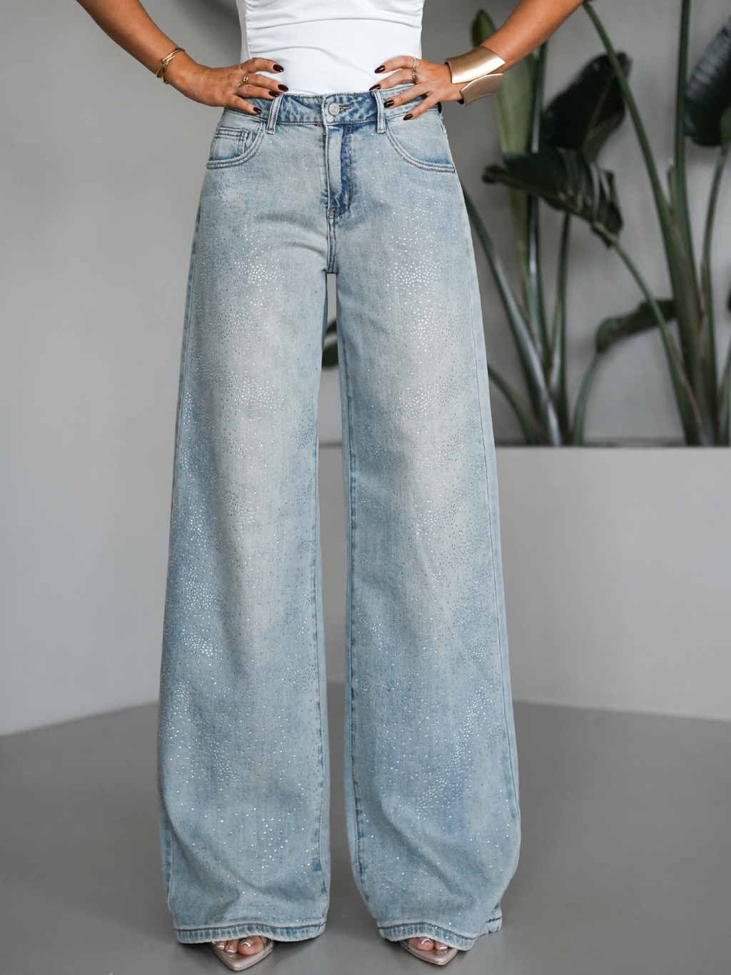 Modré široké wide leg džínsy PLEMEN s kamienkami