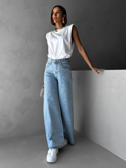 Modré trblietavé široké wide leg džínsy FEROS s kamienkami