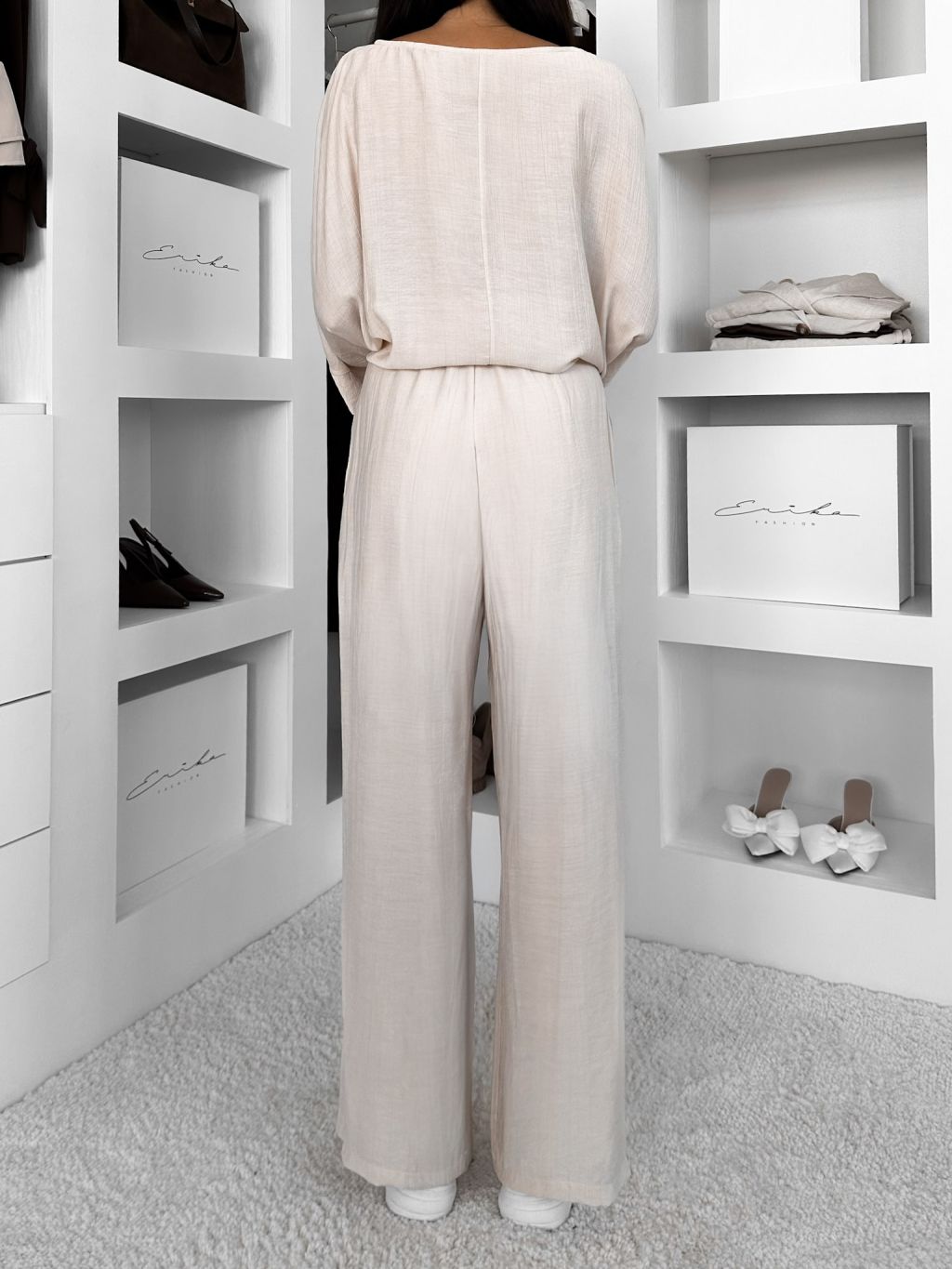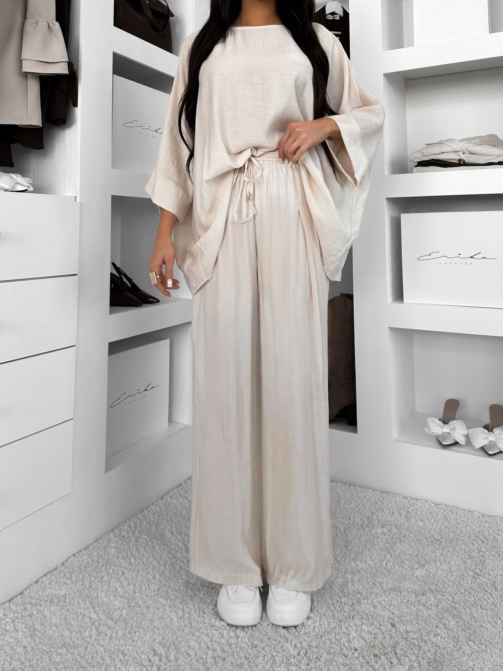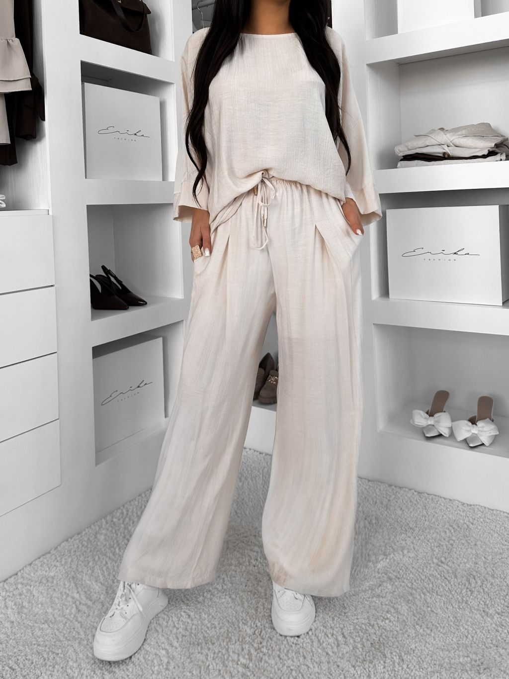 Krémové ľahké široké nohavice LARYS so šnúrkou