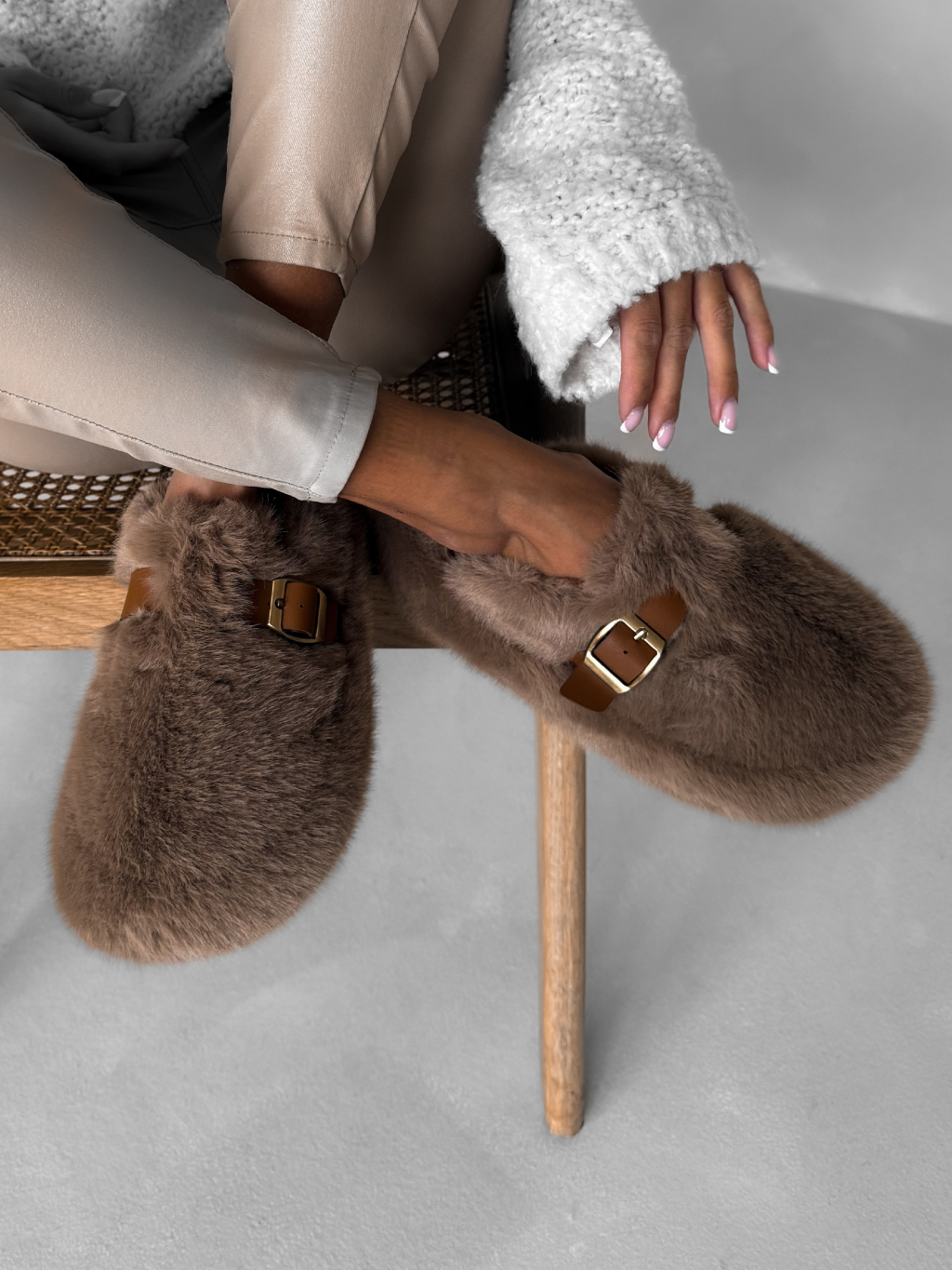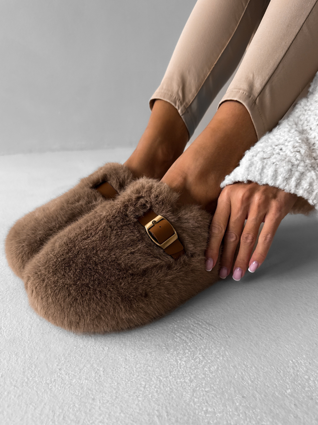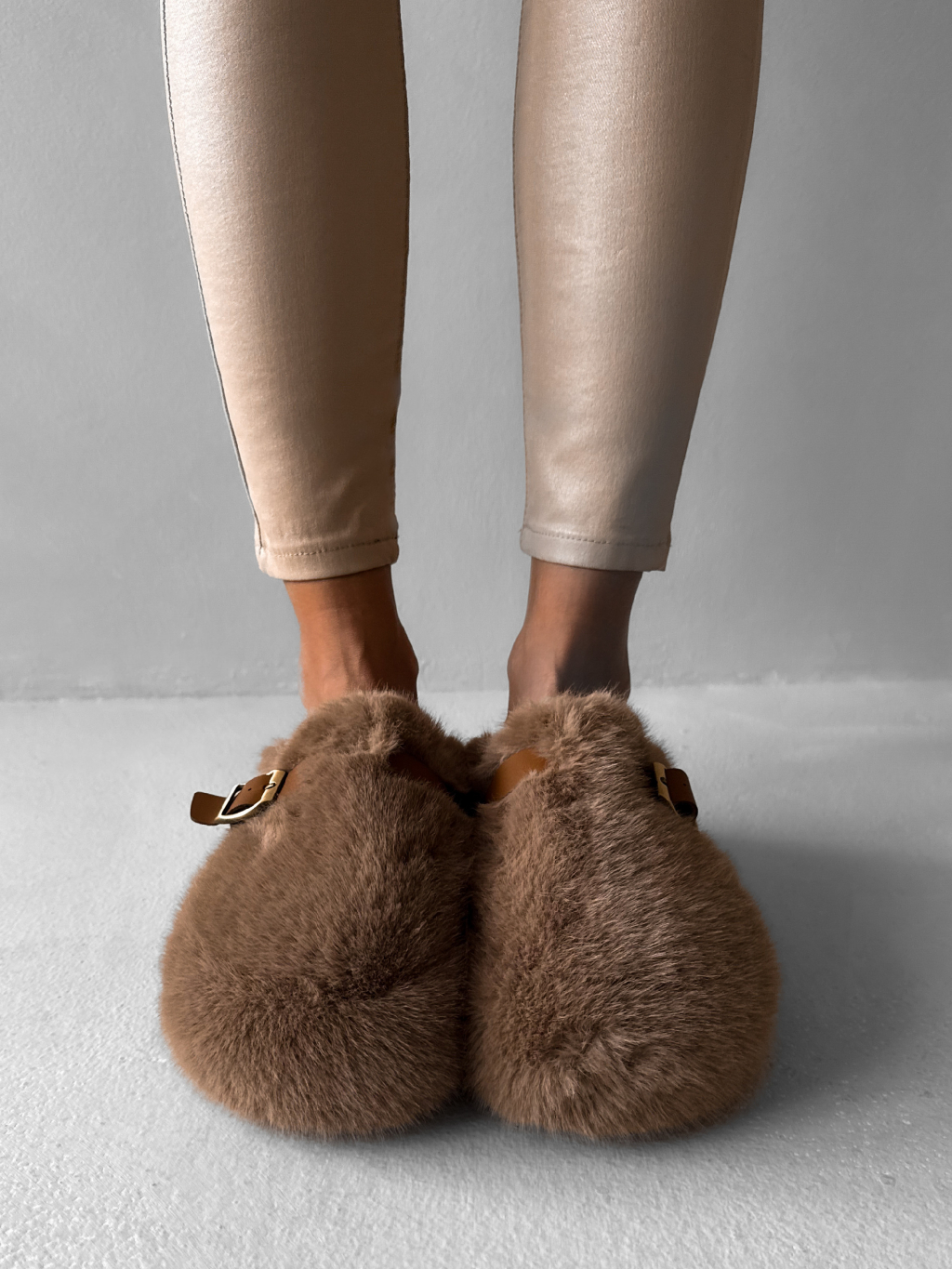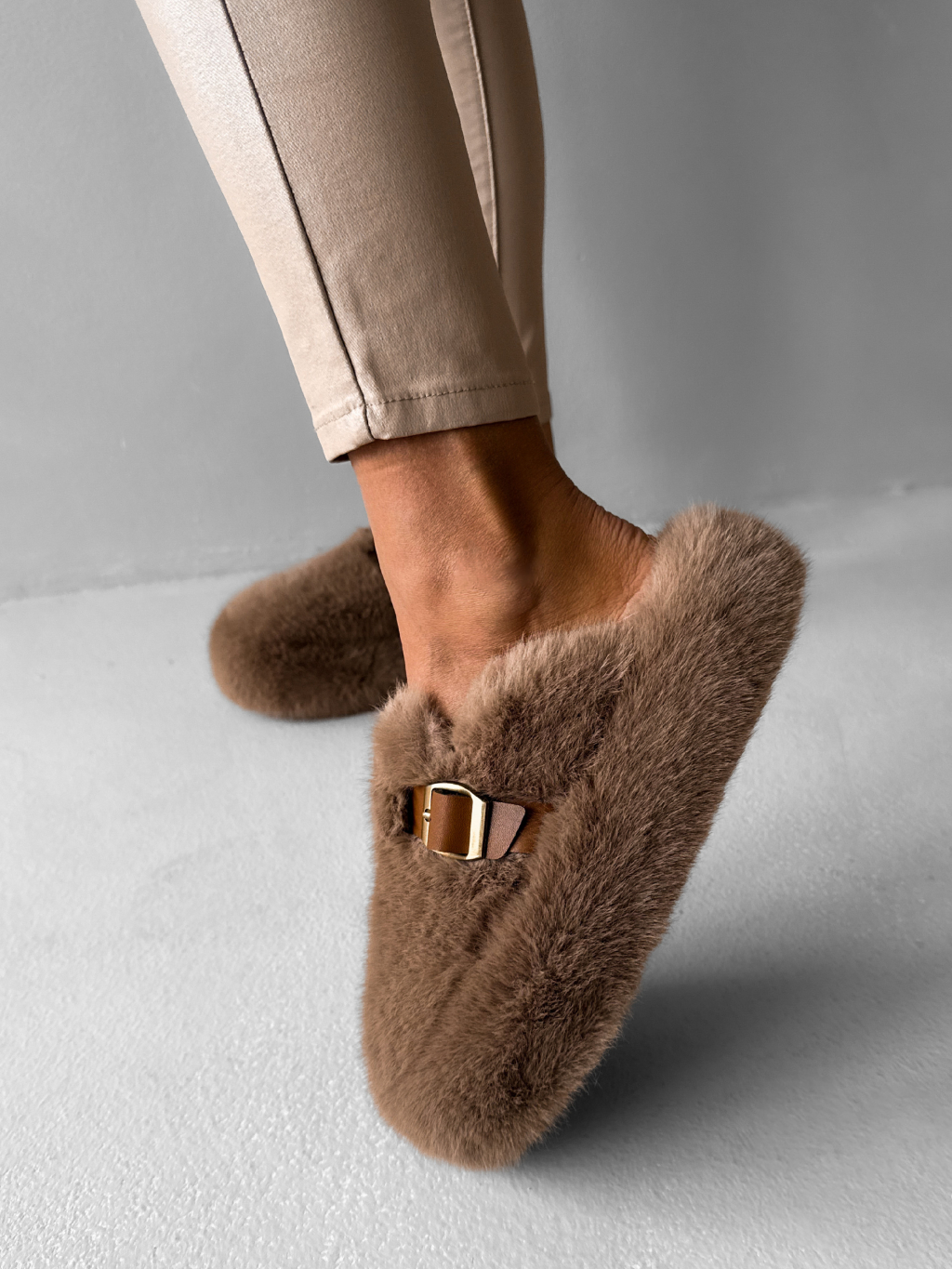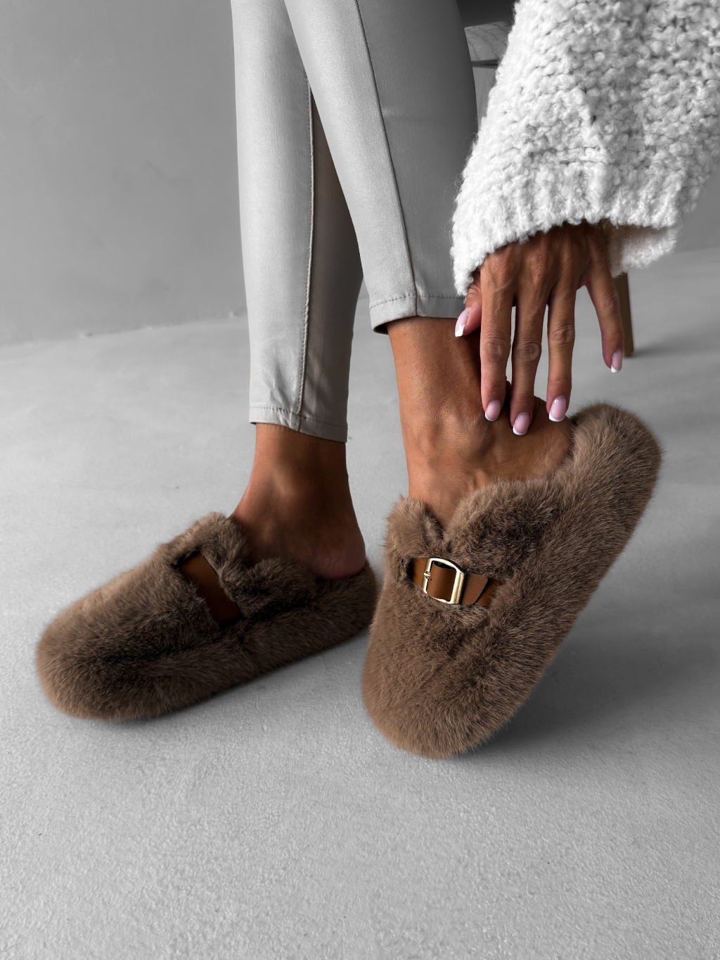 Hnedé huňaté šľapky FLUFFIES s opaskom