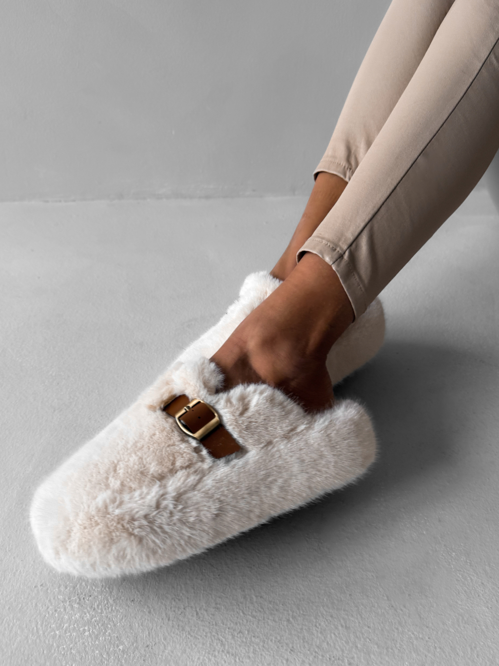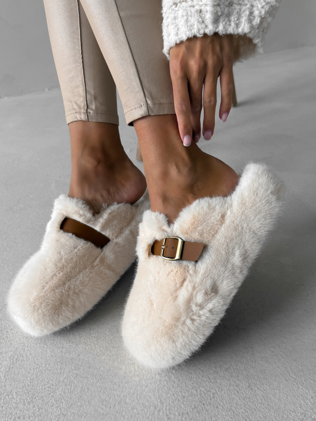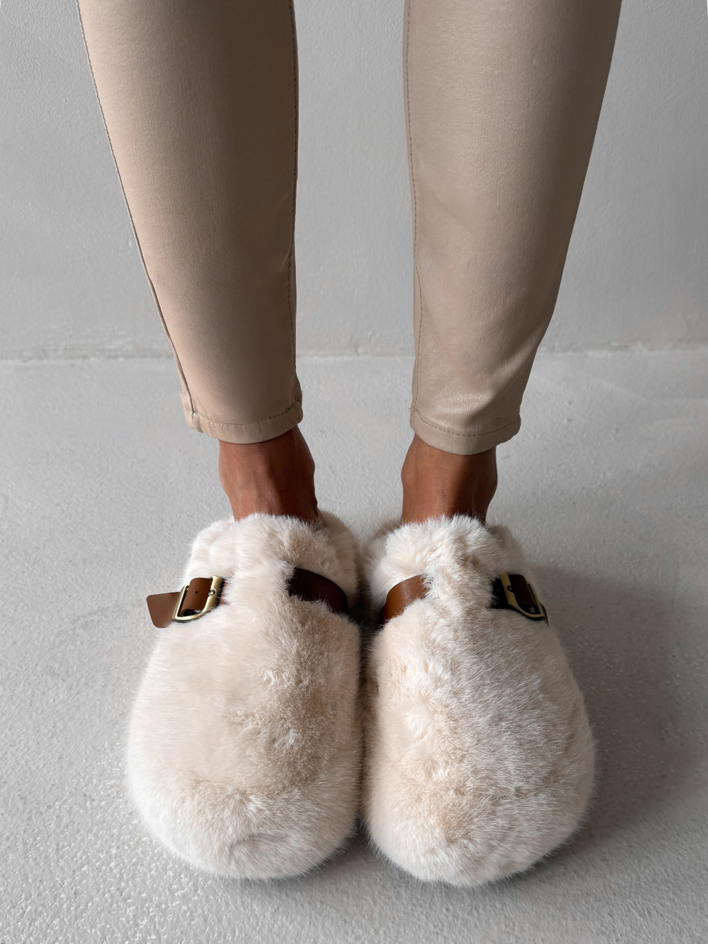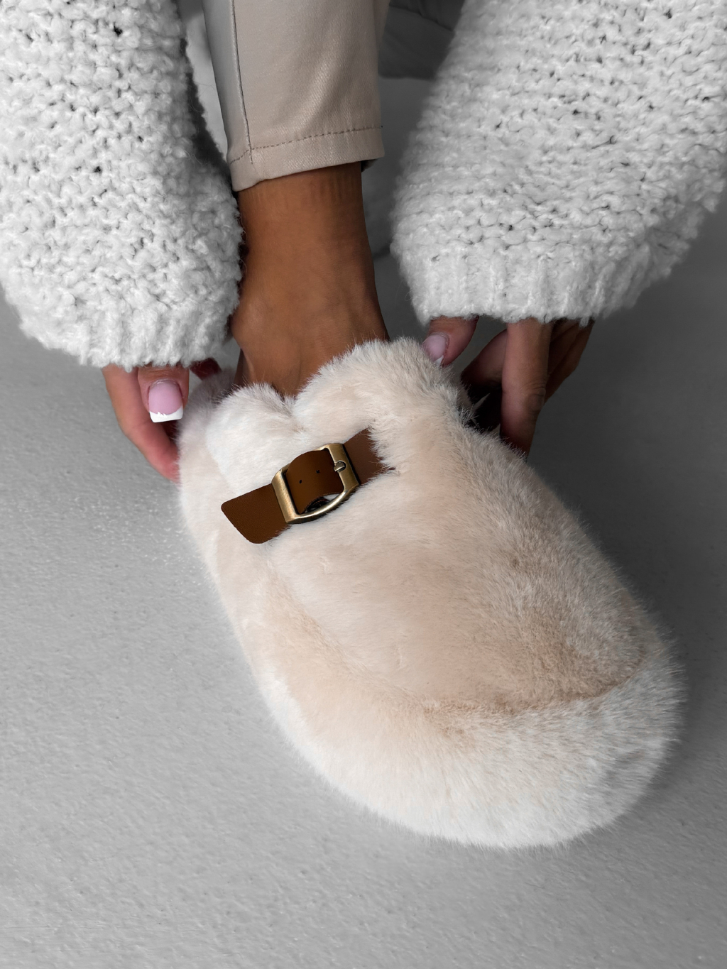 Krémové huňaté šľapky FLUFFIES s opaskom