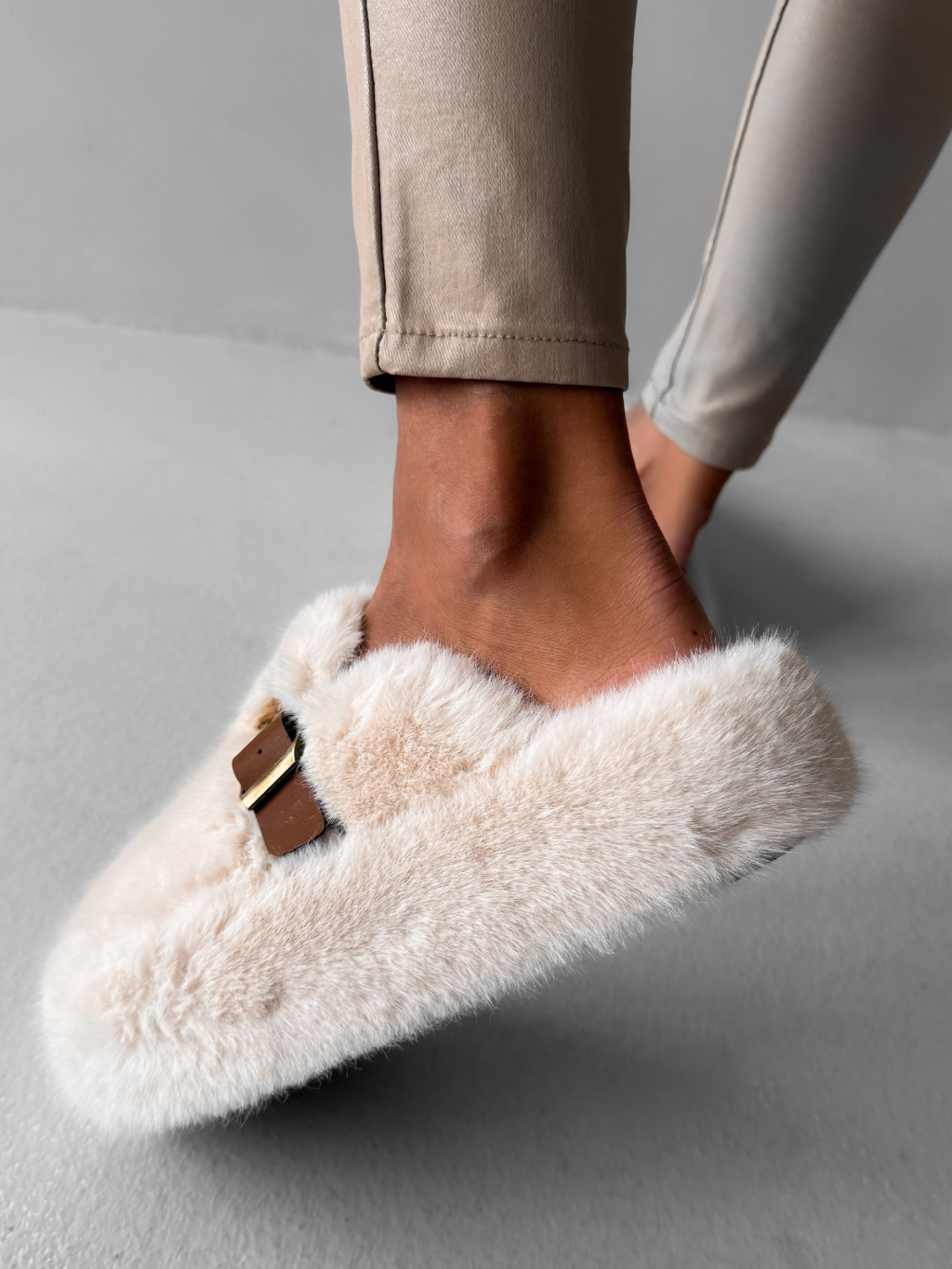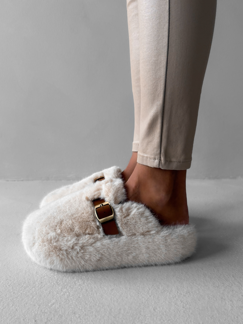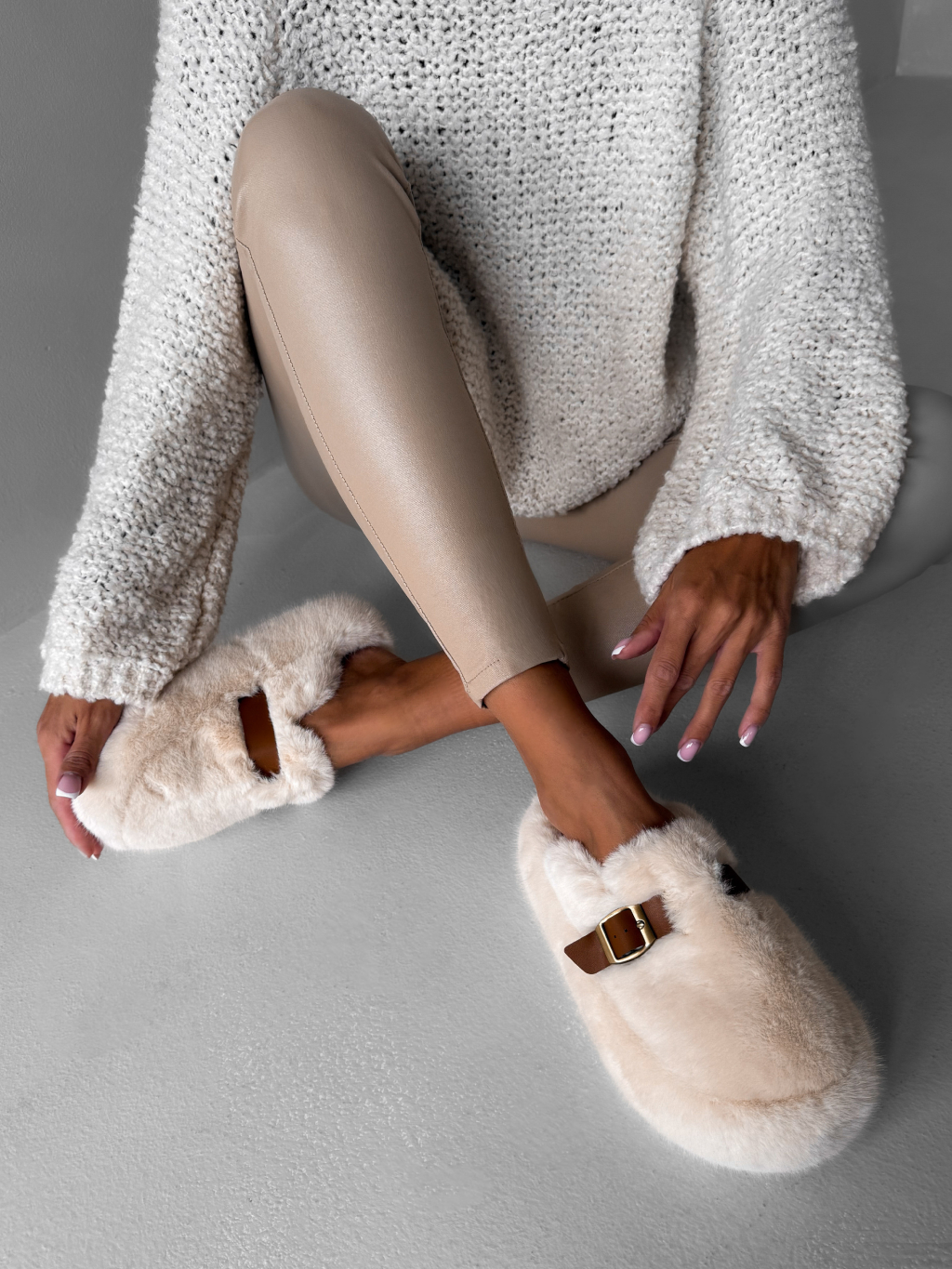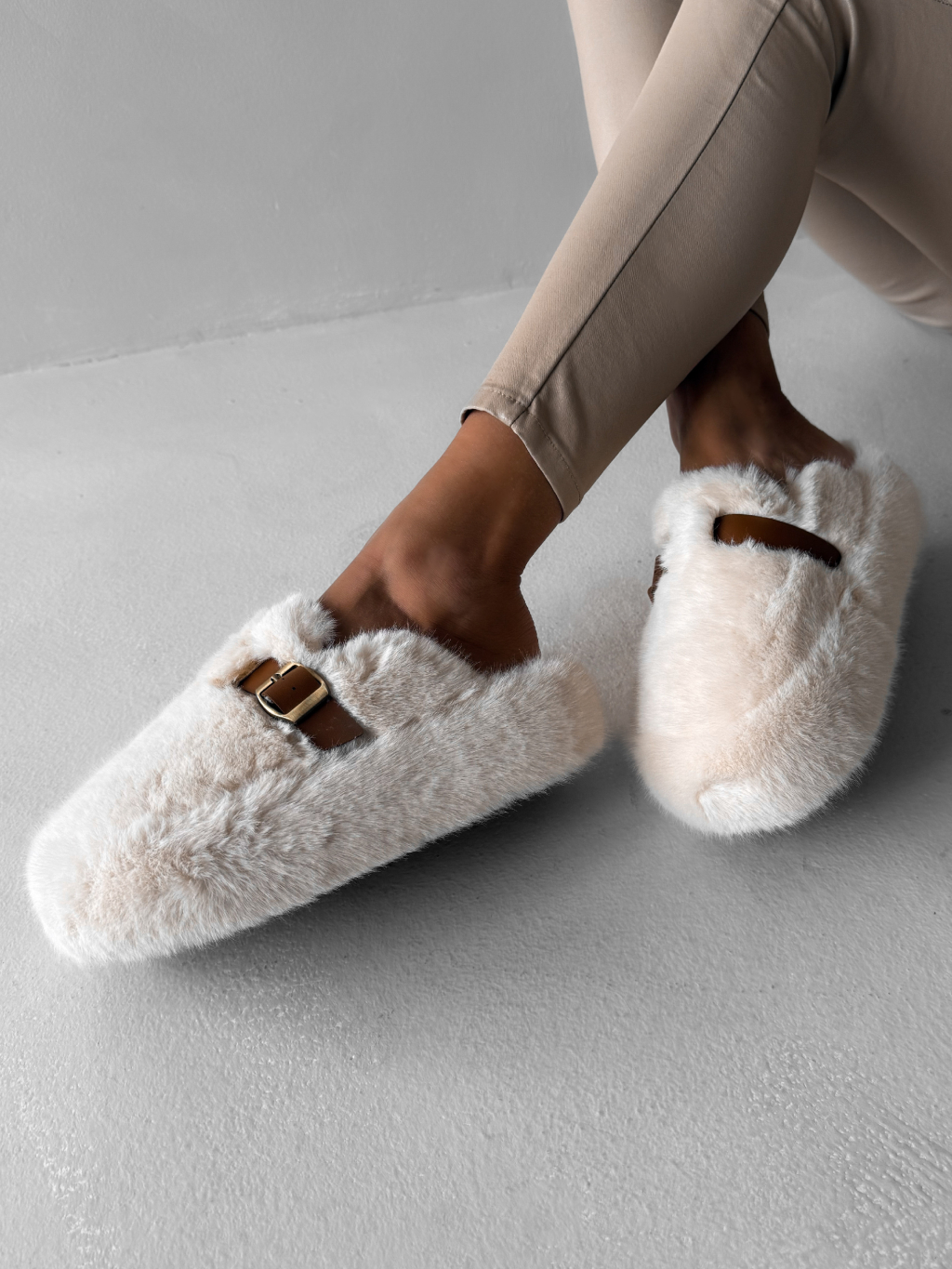 Krémové huňaté šľapky FLUFFIES s opaskom