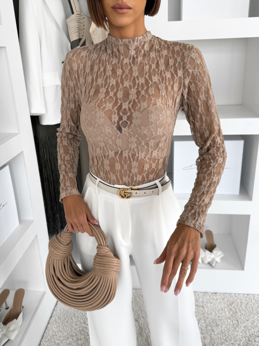 Béžové krajkové body TARELI s dlhým rukávom