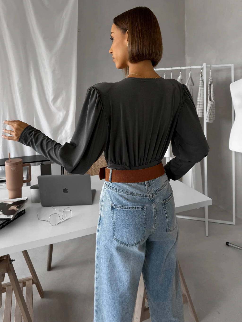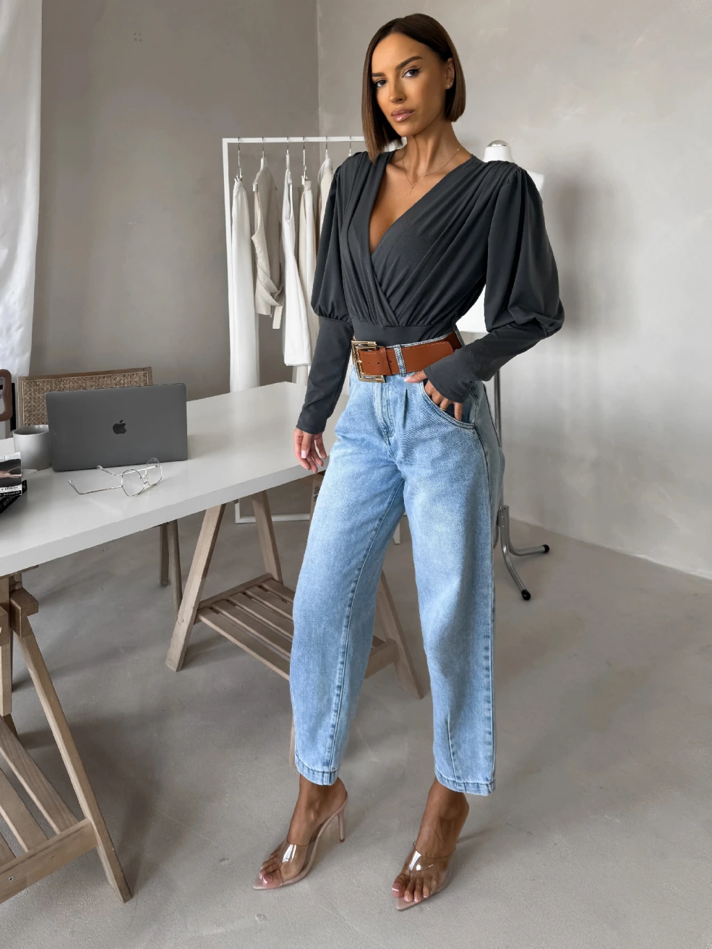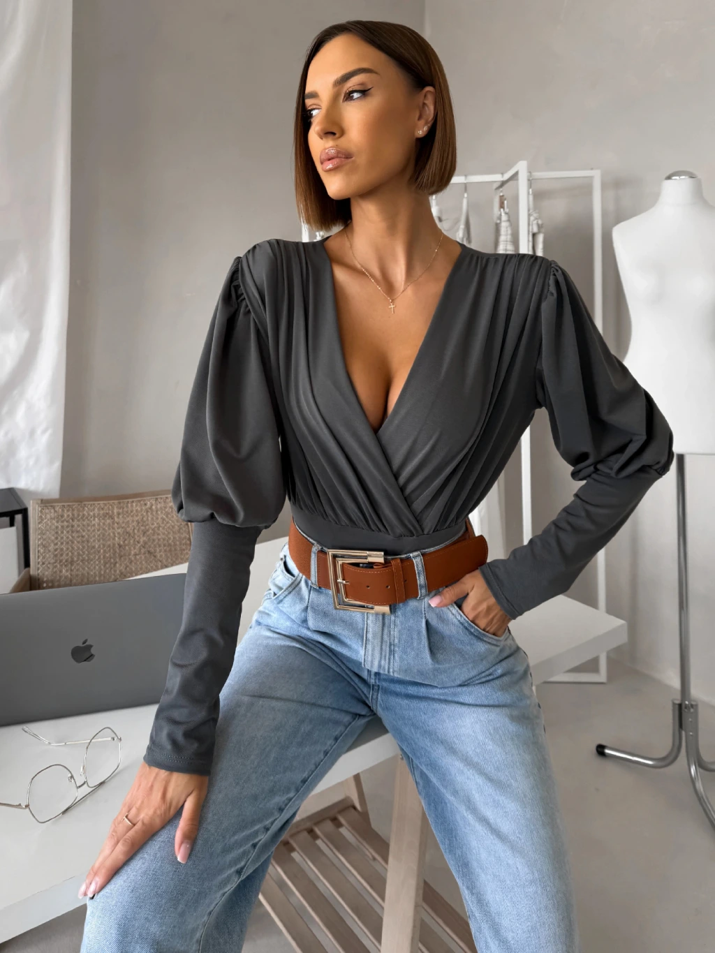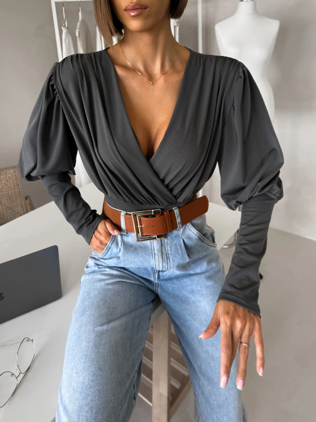 Šedé elegantné body KORBIX s výstrihom