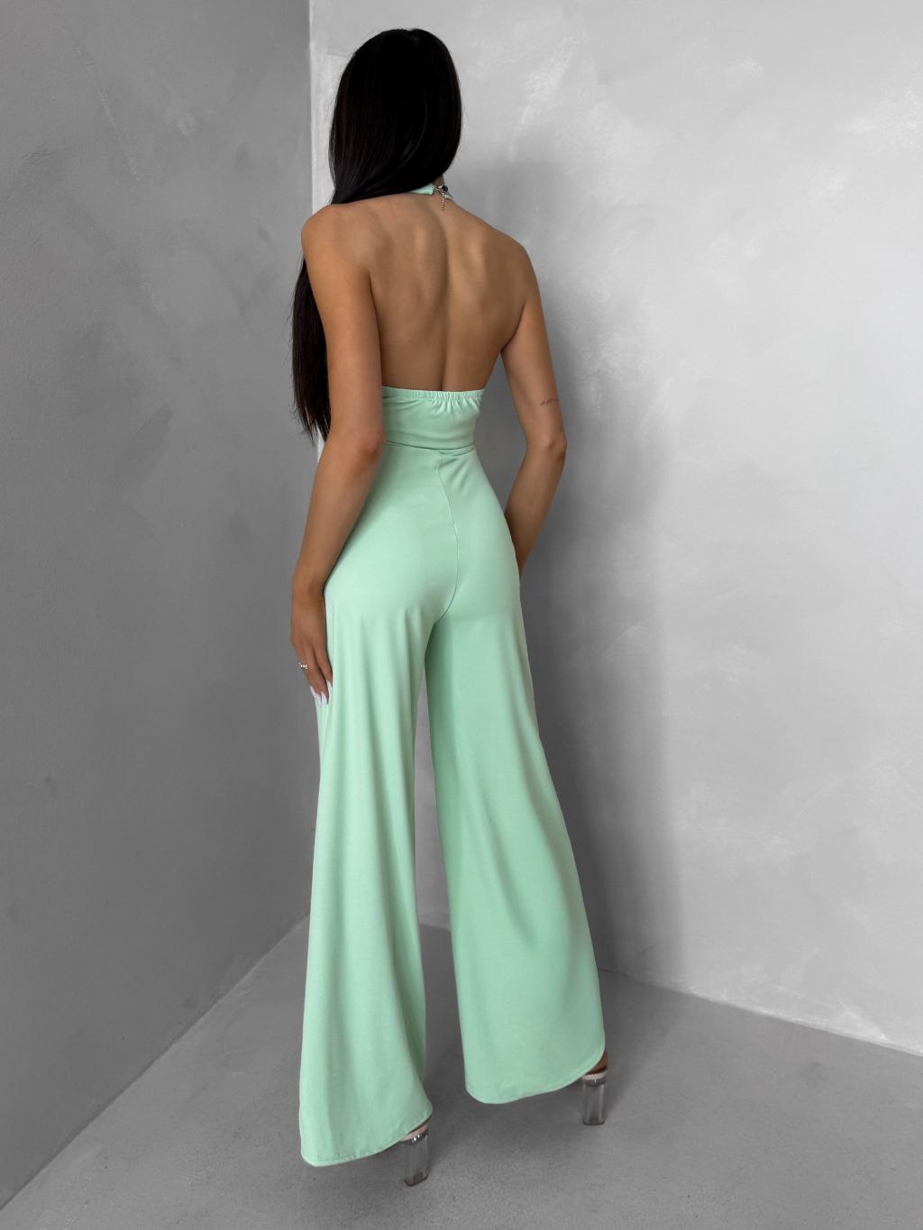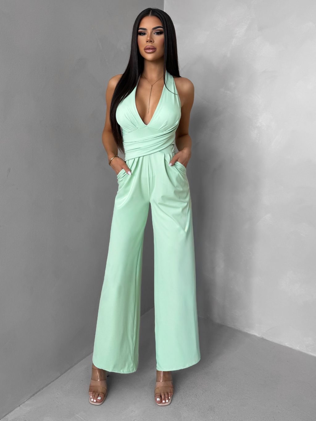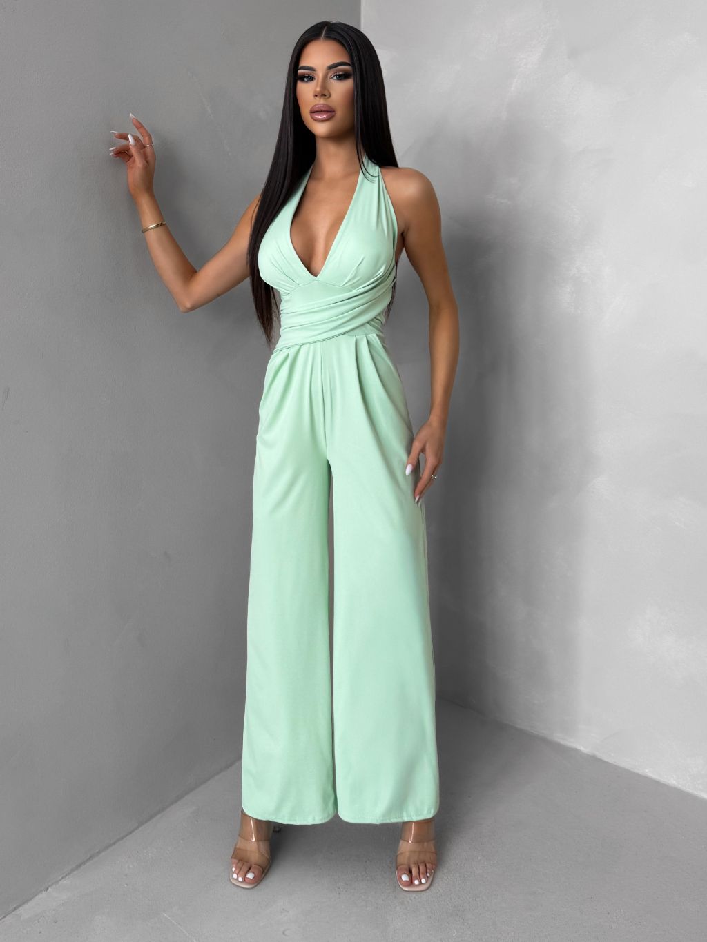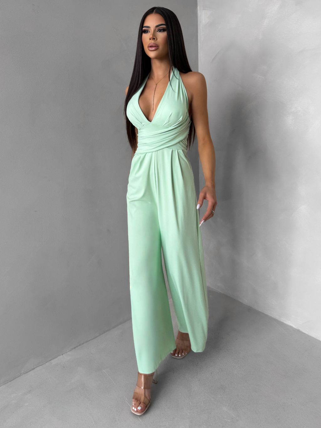 Svetlozelený spoločenský dlhý overal ARVELLA s výstrihom