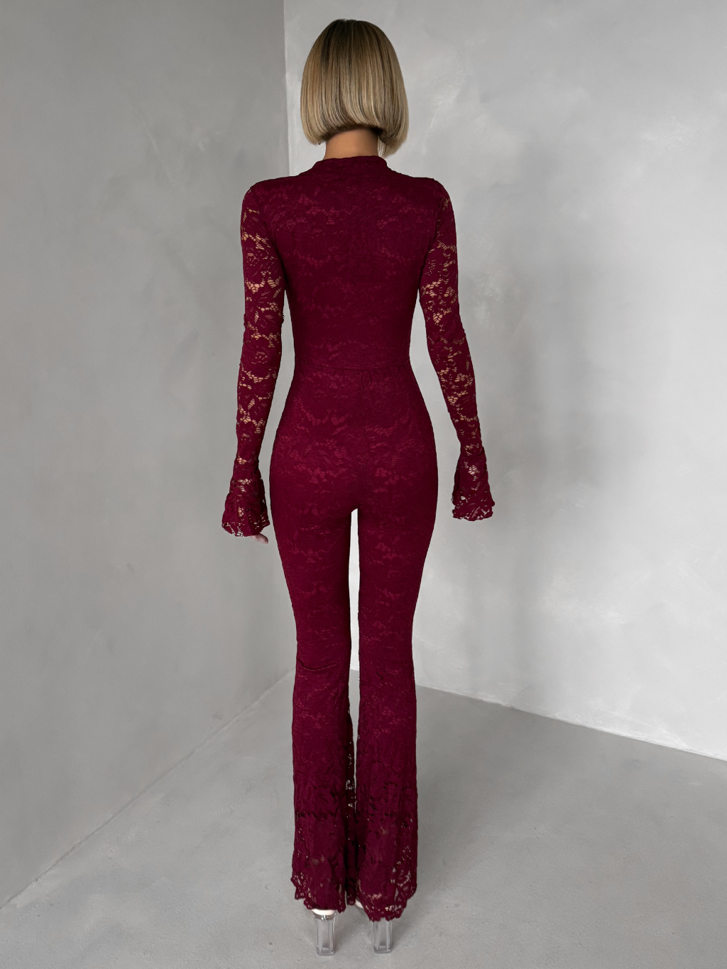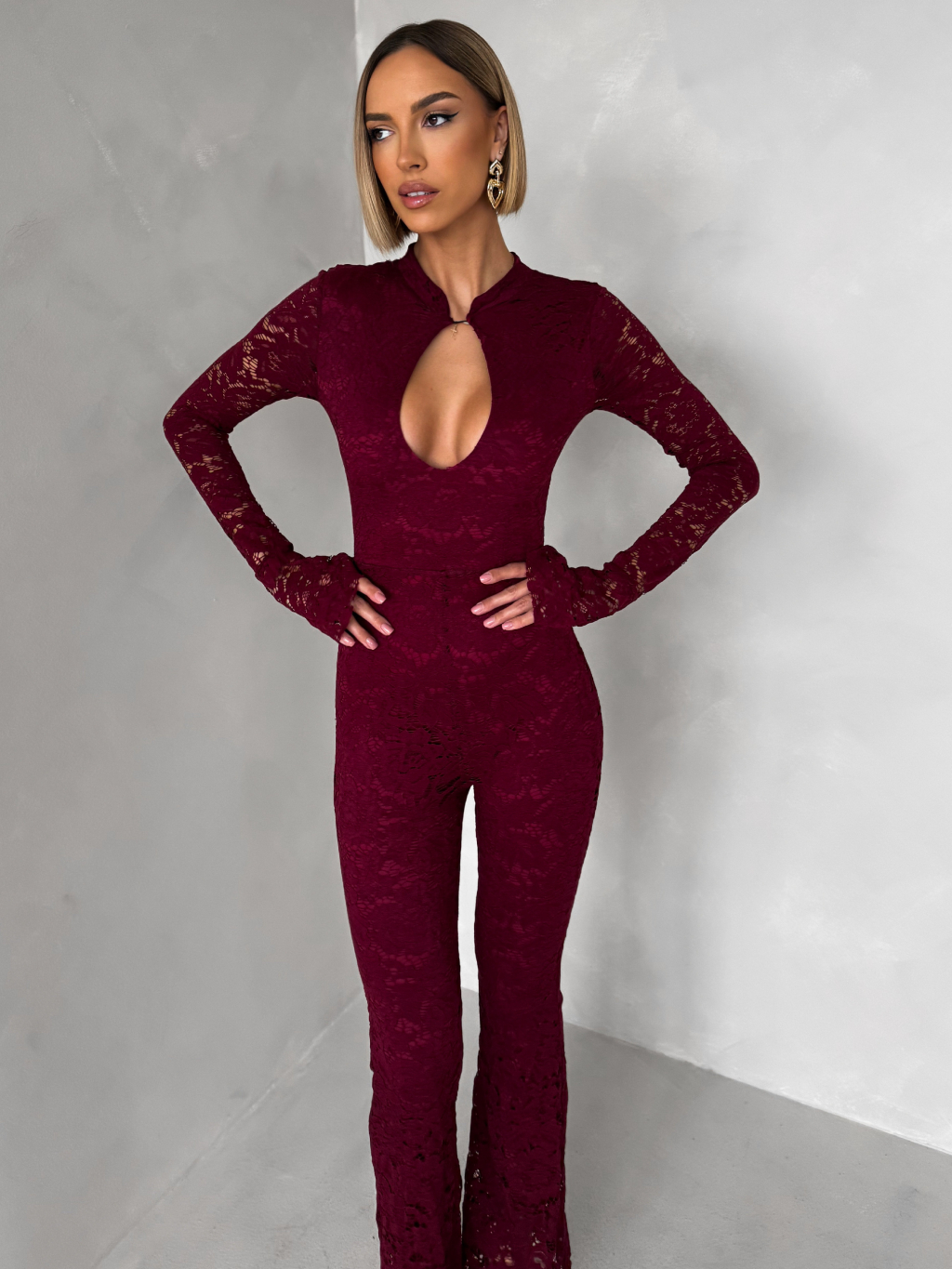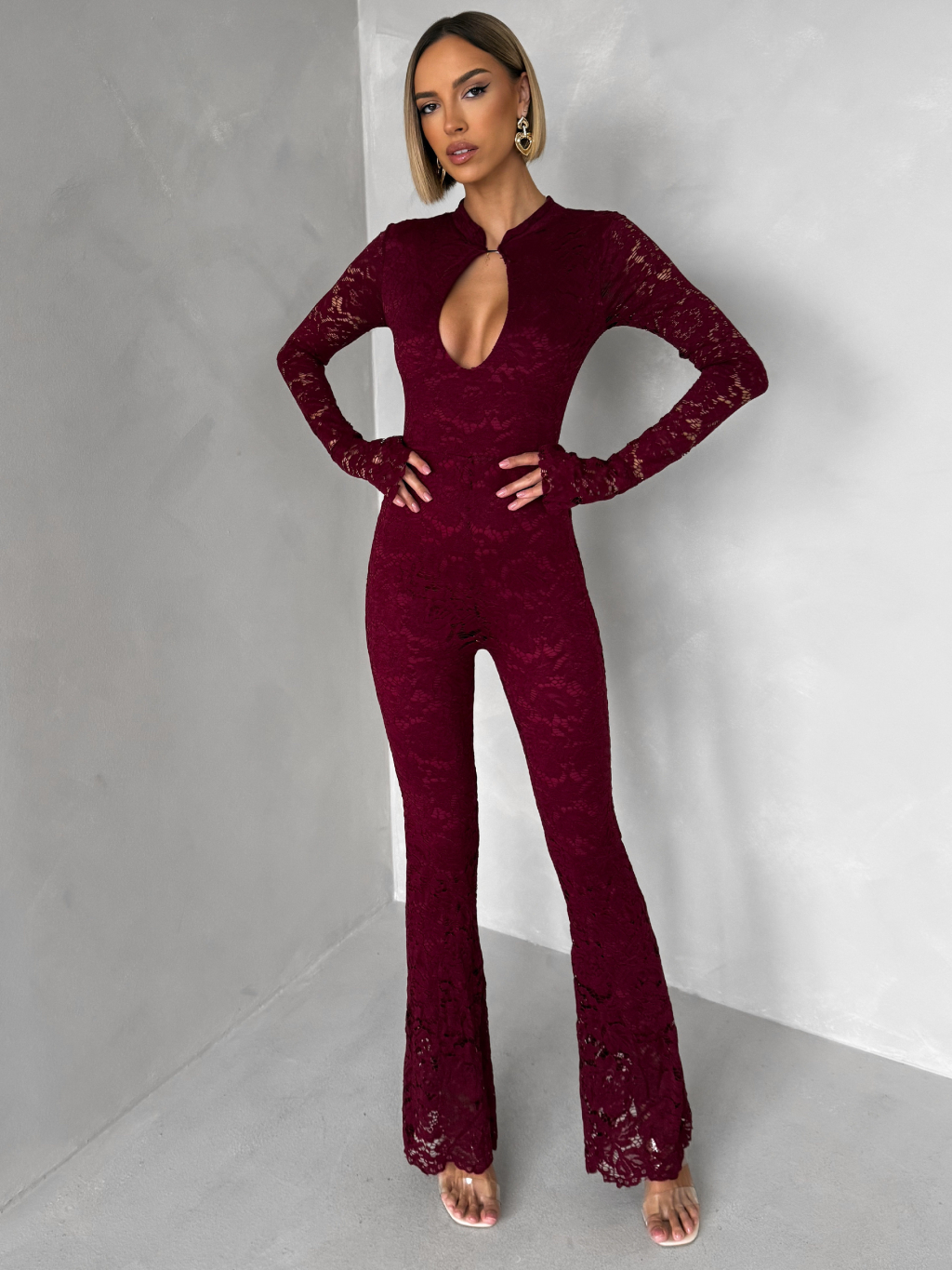 Vínový krajkovaný spoločenský dlhý overal WAIVANY