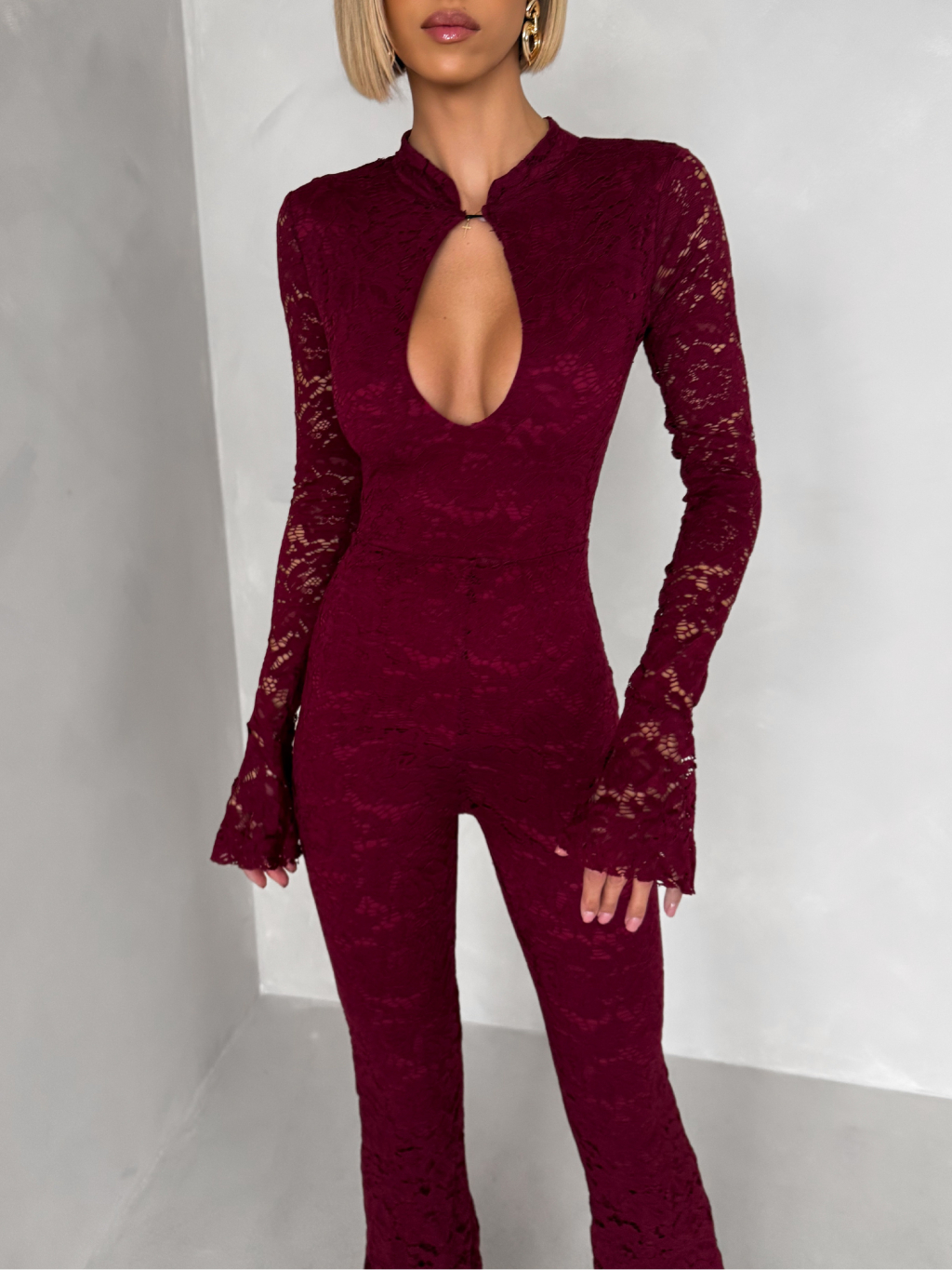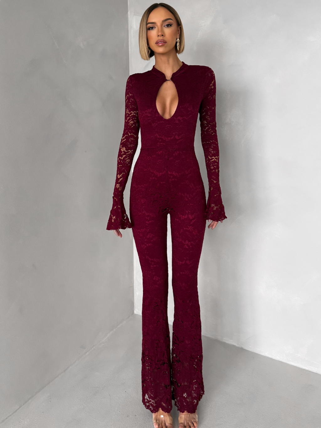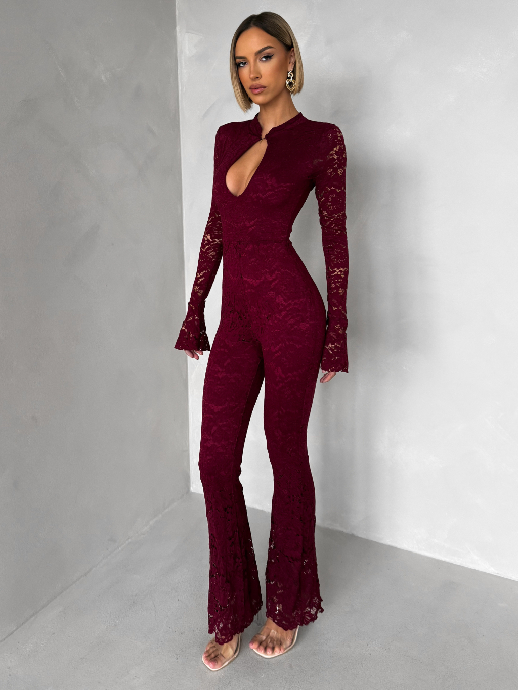 Vínový krajkovaný spoločenský dlhý overal WAIVANY