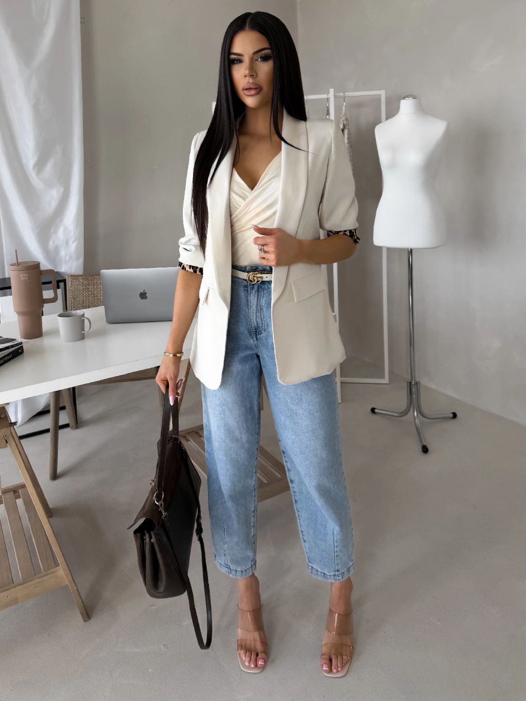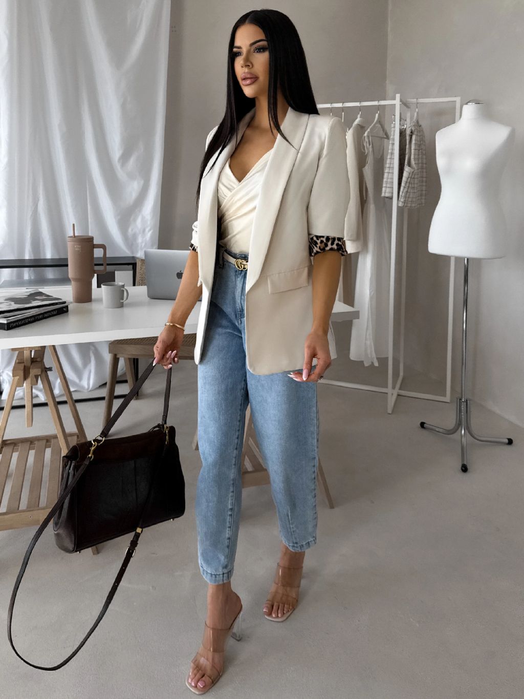 Béžové elegantné vypasované sako ZAFINA s leopardným vzorom