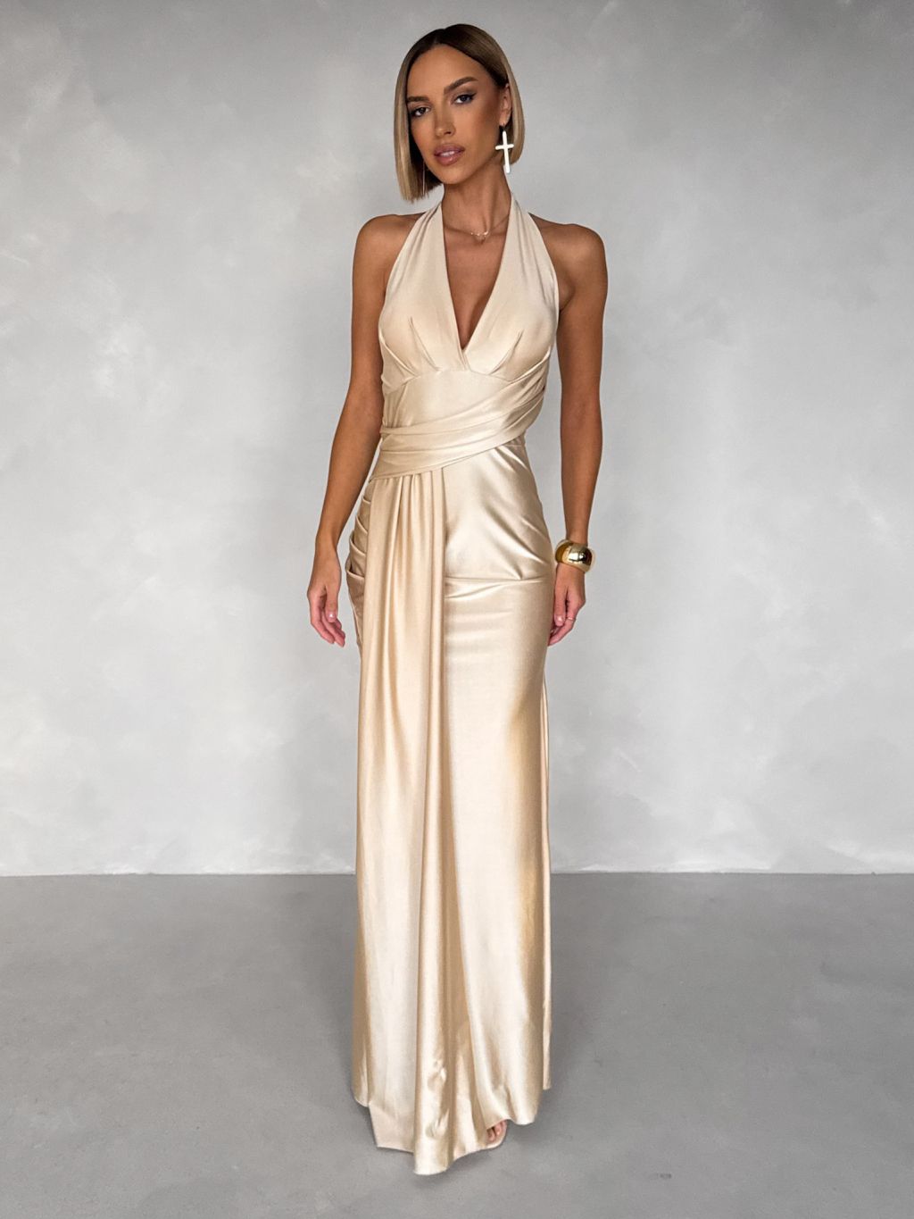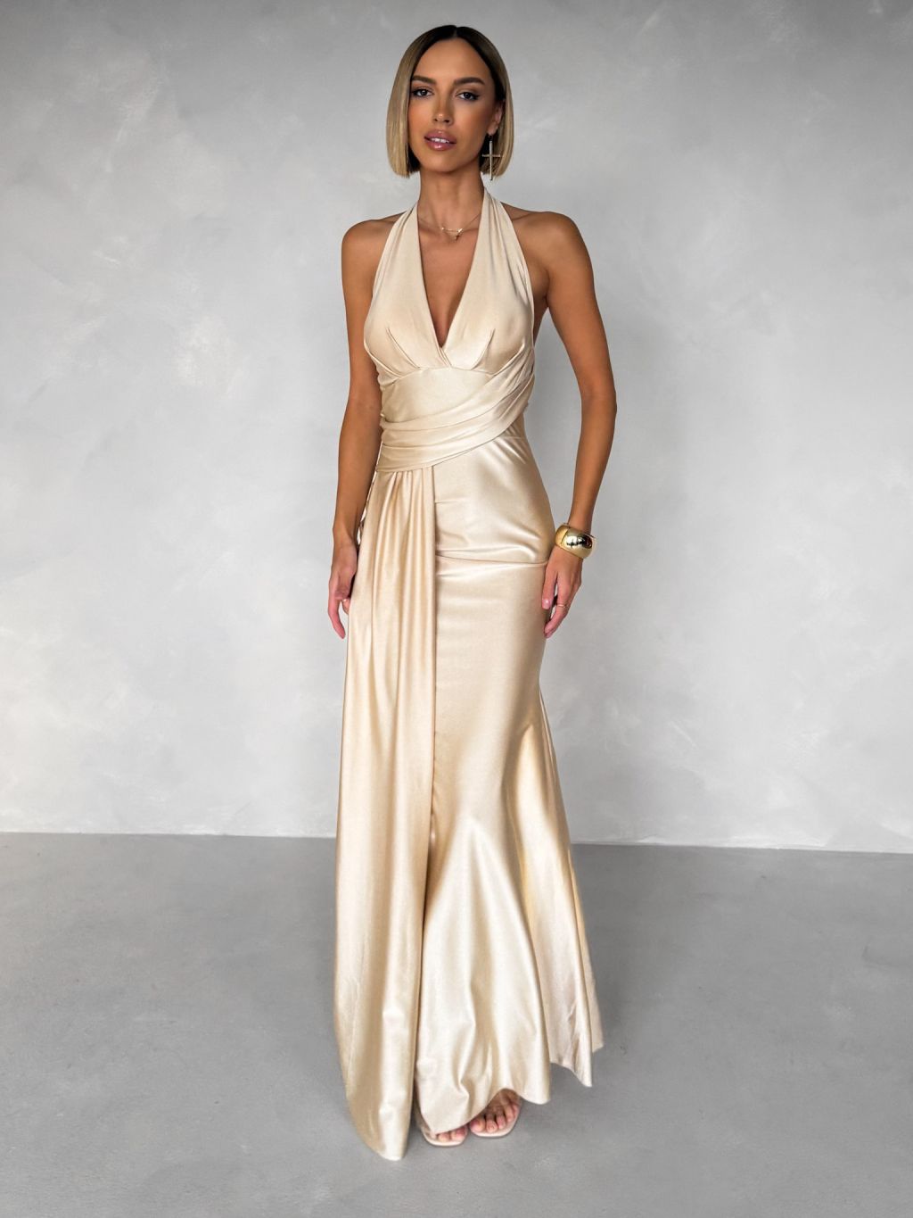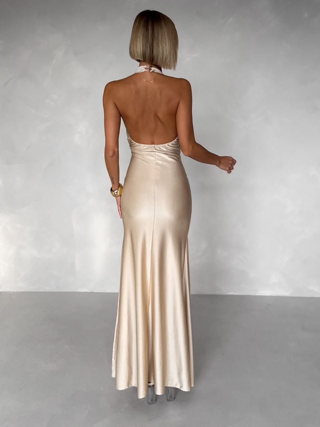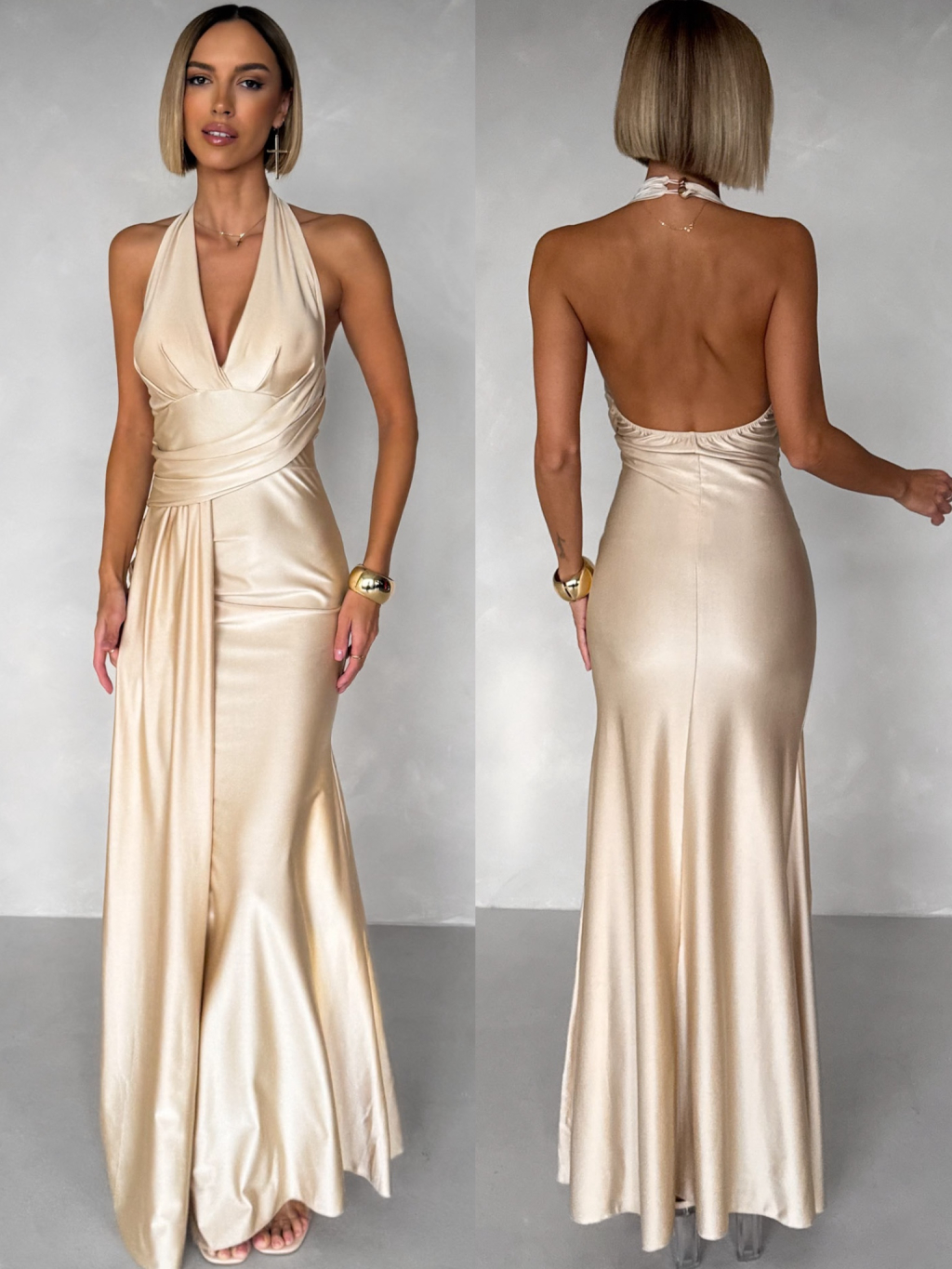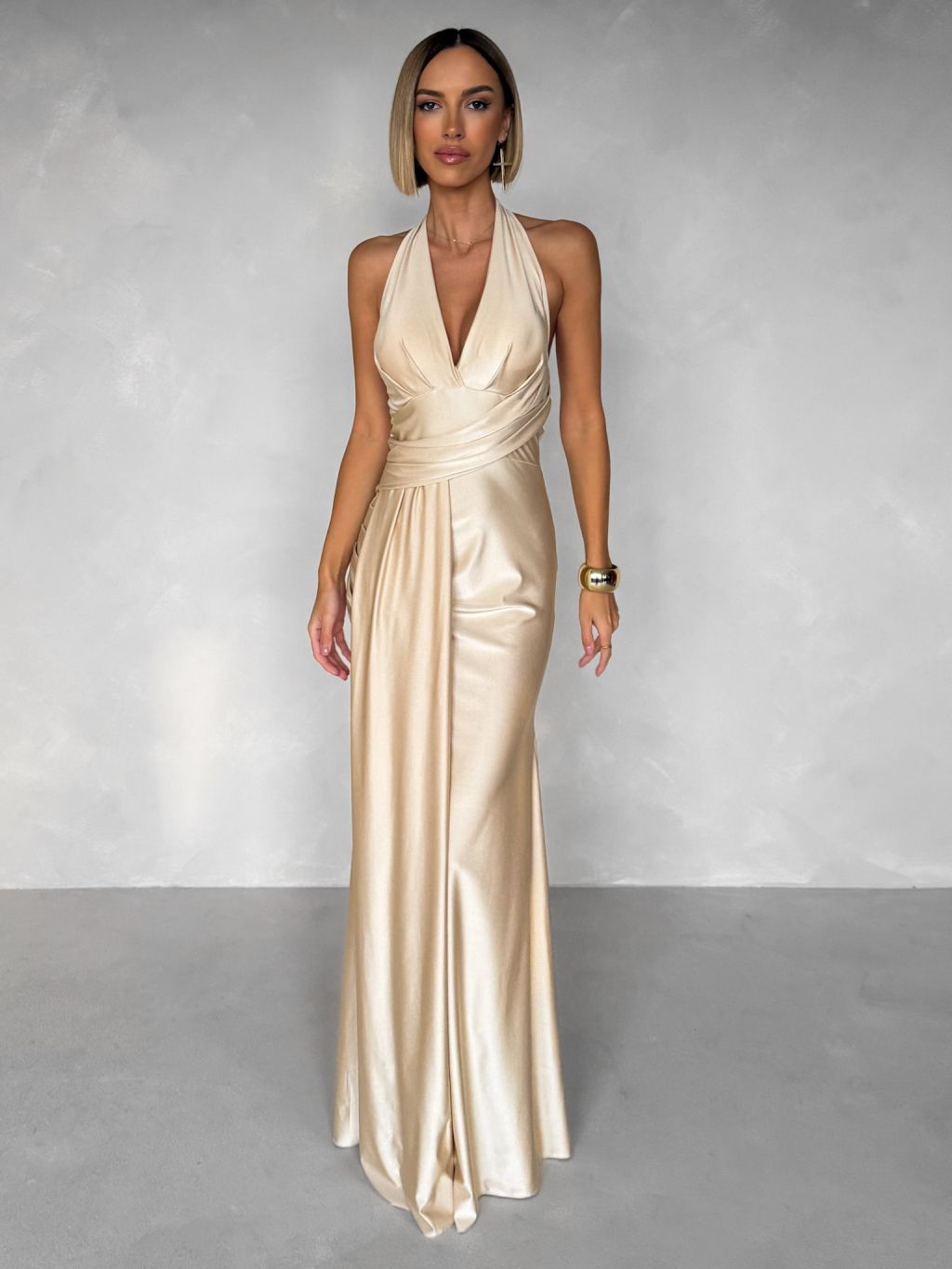 Béžové dlhé spoločenské šaty CELESTIA s vlečkou