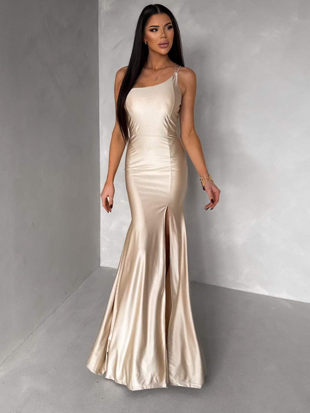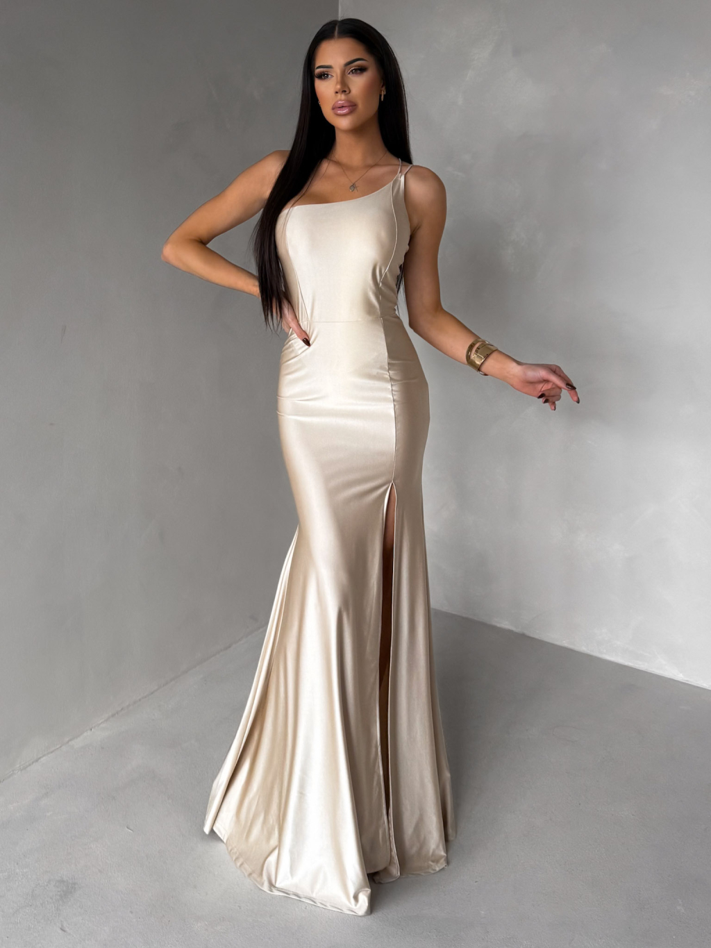 Béžové spoločenské dlhé šaty GAREVIA s rázporkom