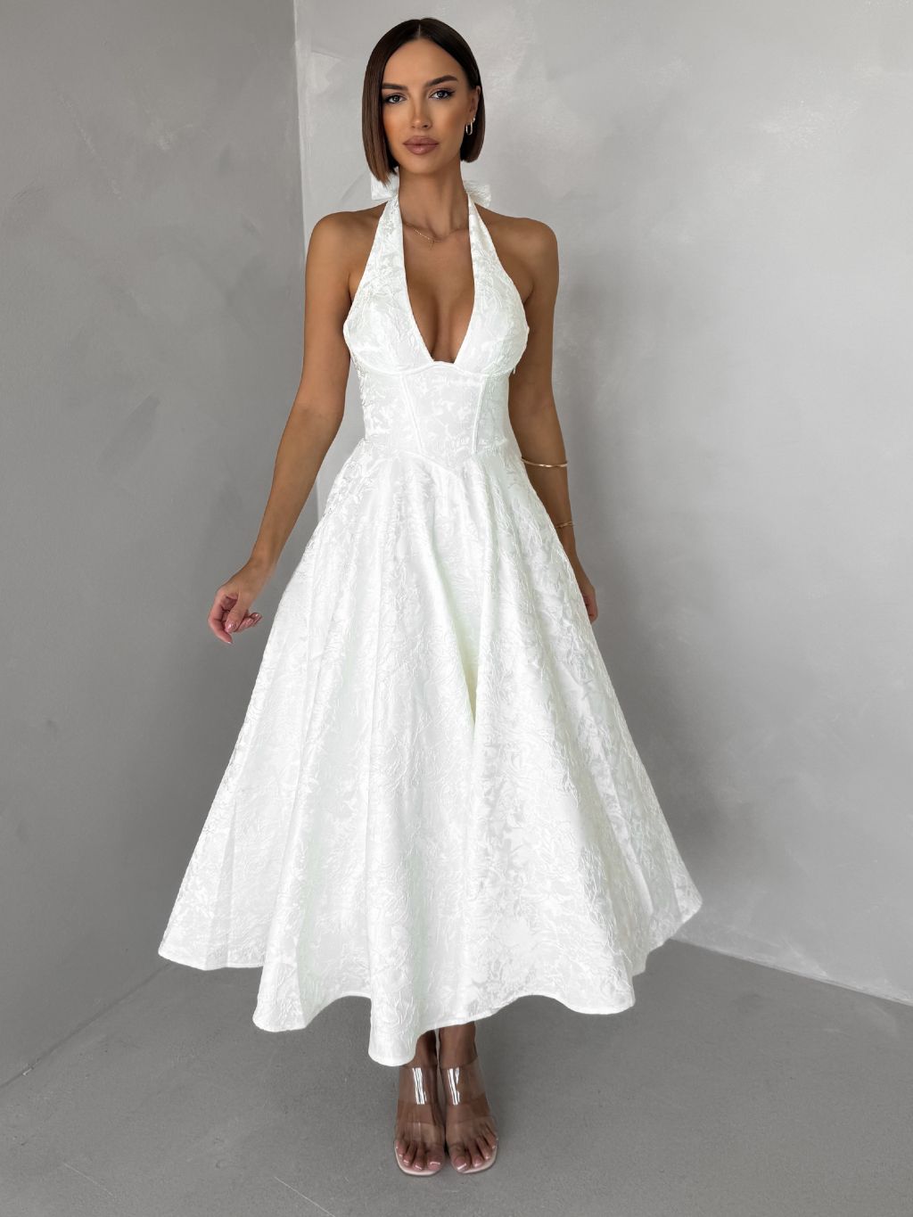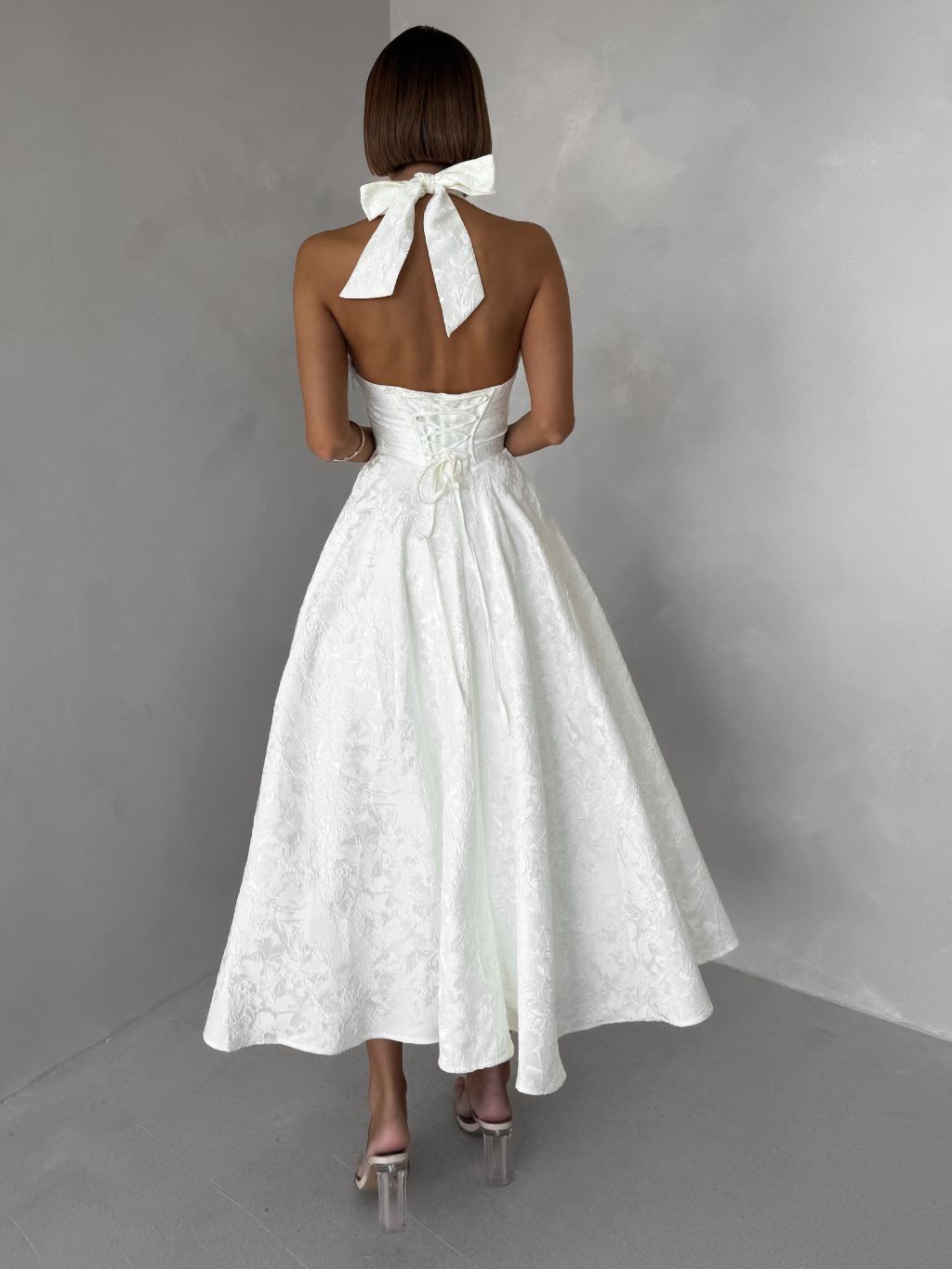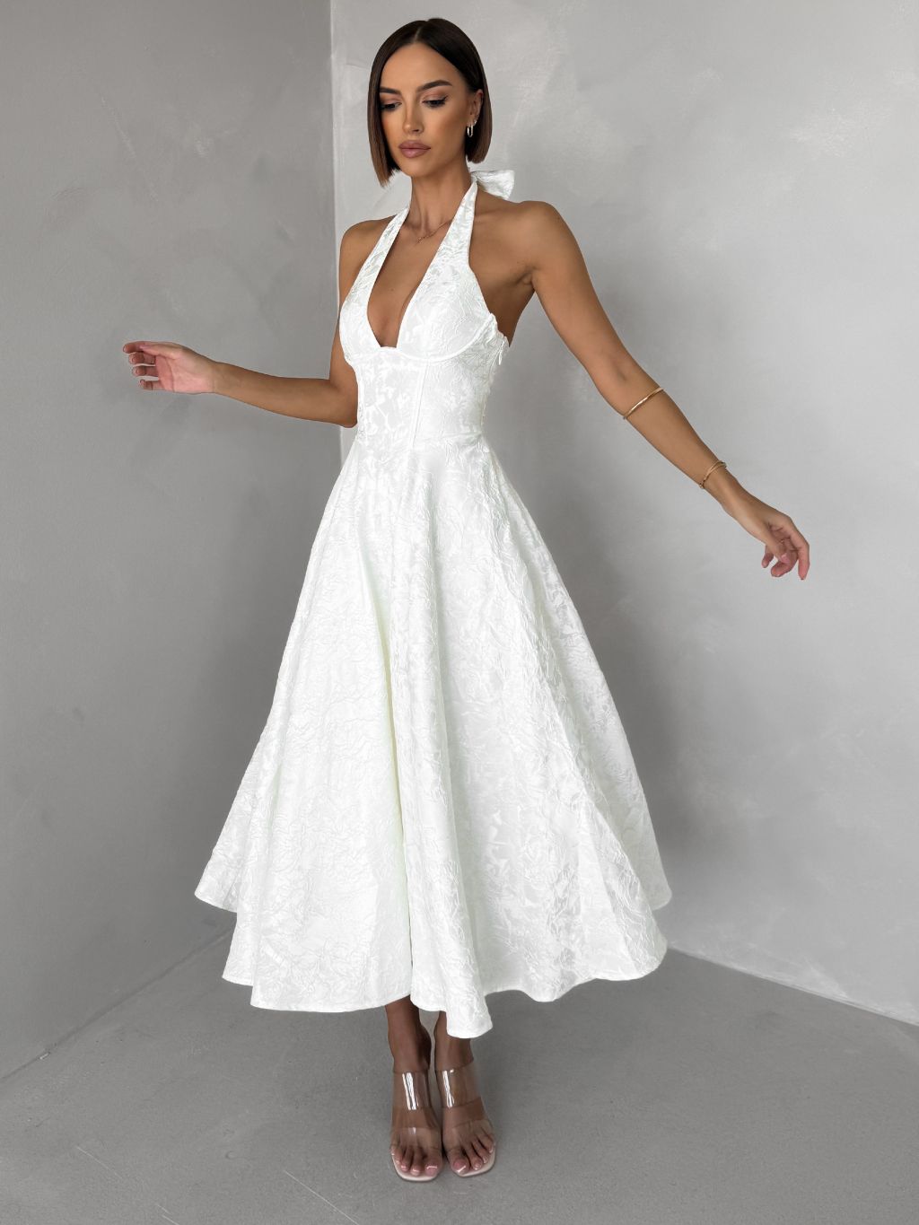 Biele spoločenské vypasované áčkové midi šaty NYXORA