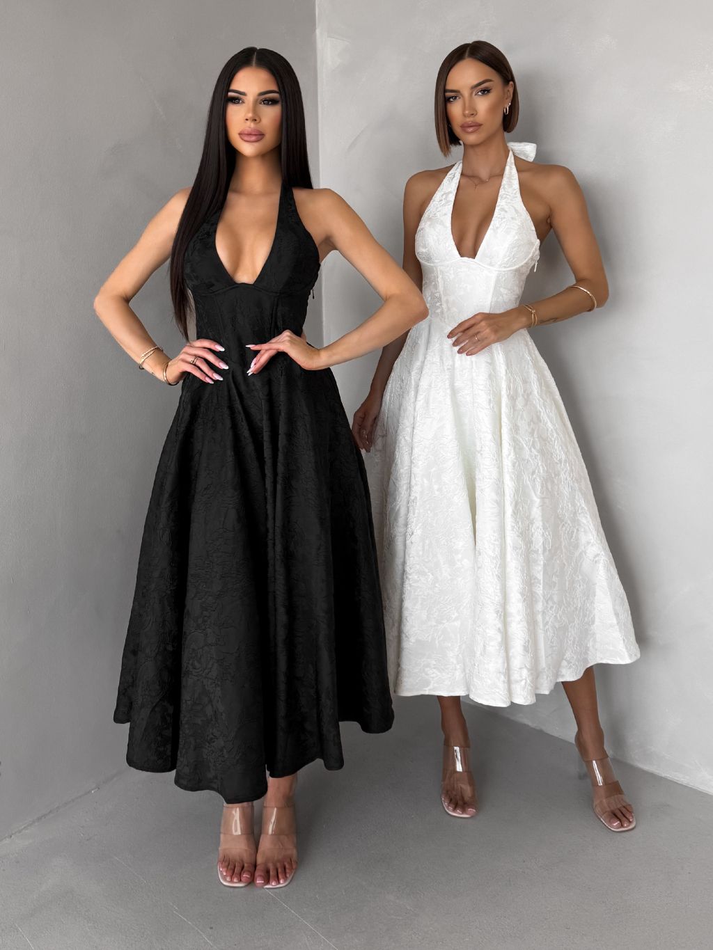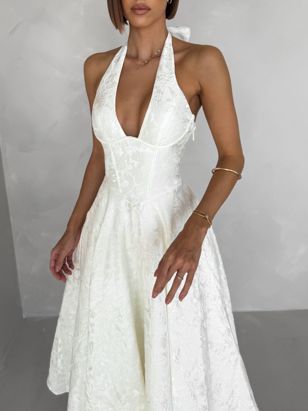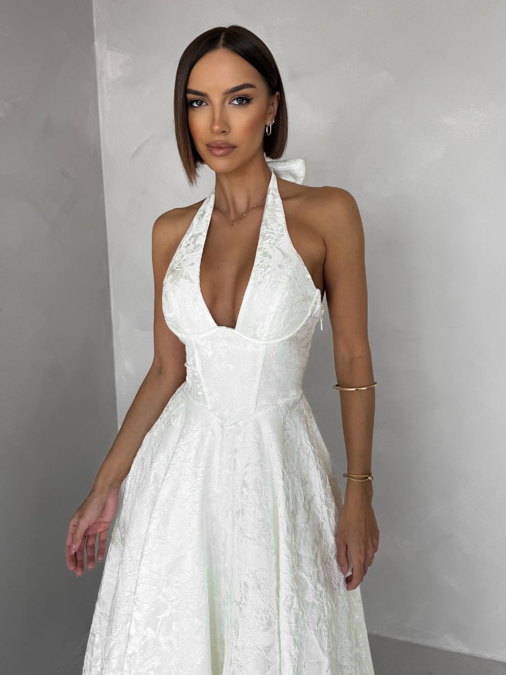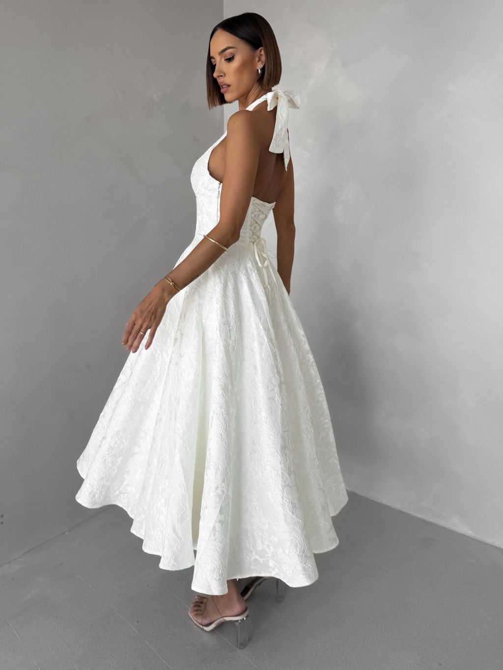 Biele spoločenské vypasované áčkové midi šaty NYXORA