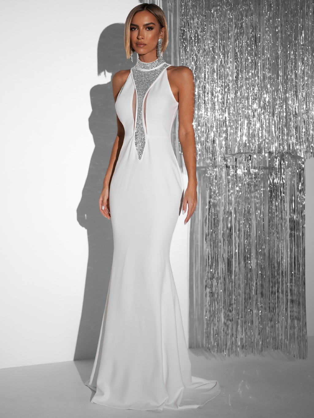 Biele večerné dlhé šaty NOVES s kamienkami
