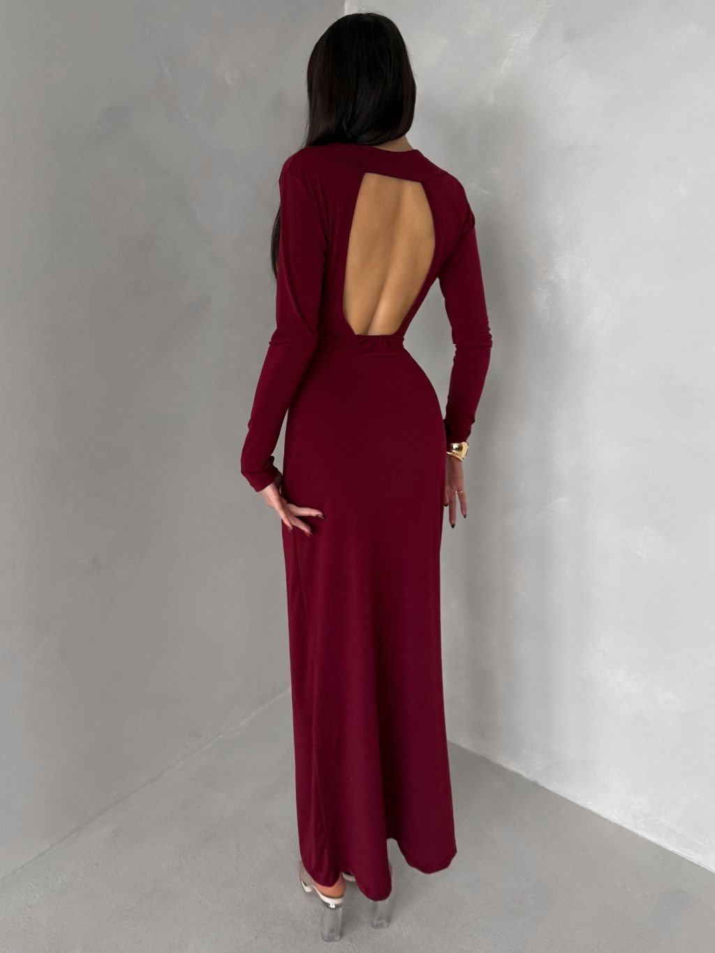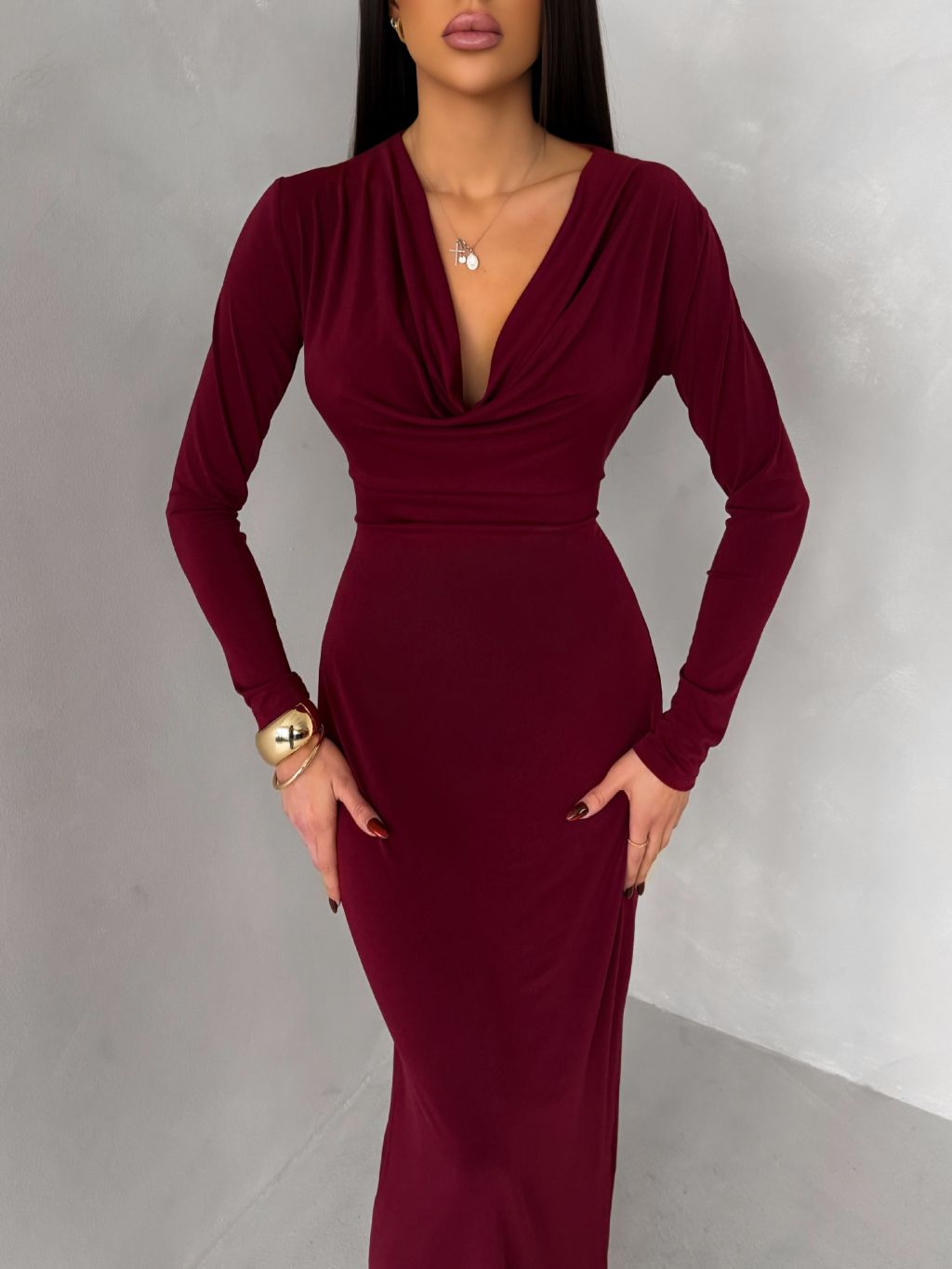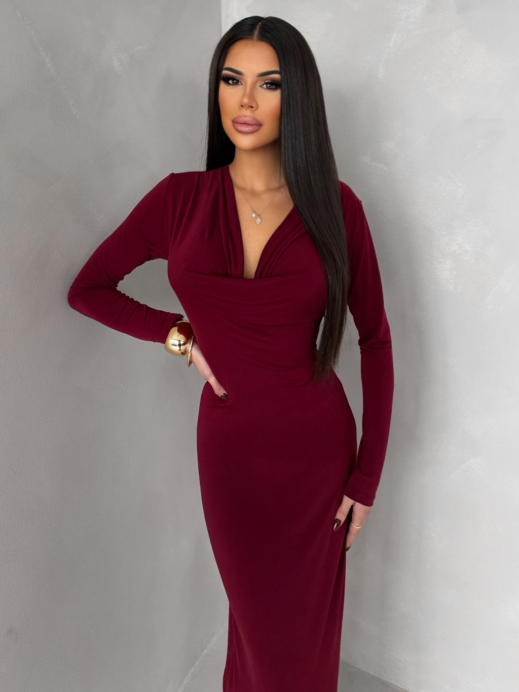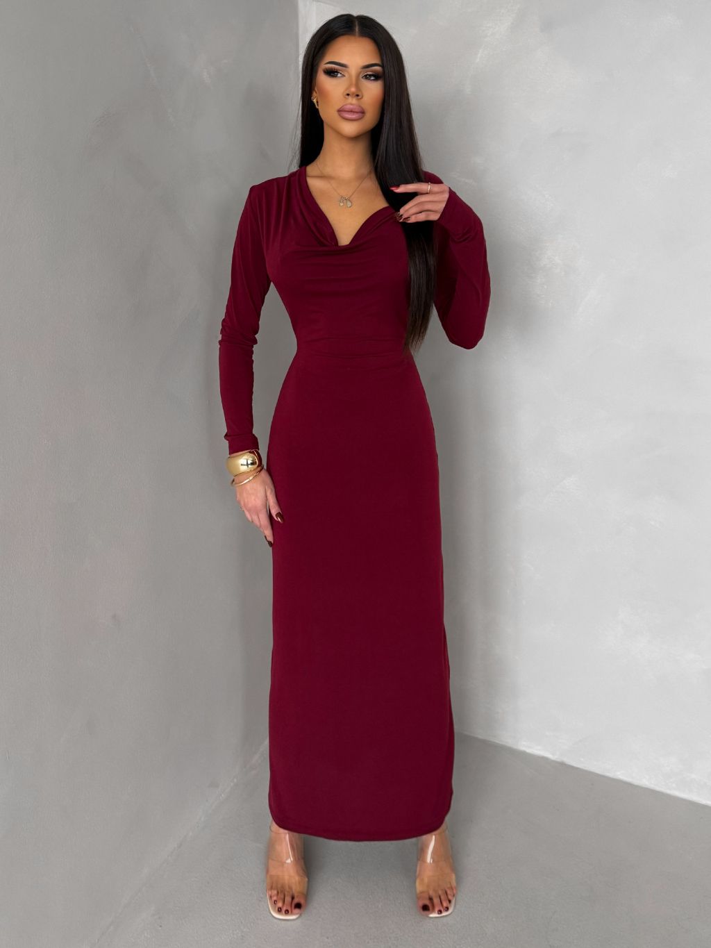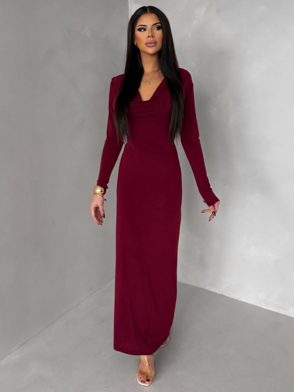 Bordó elegantné dlhé šaty OLIVINE s dlhým rukávom