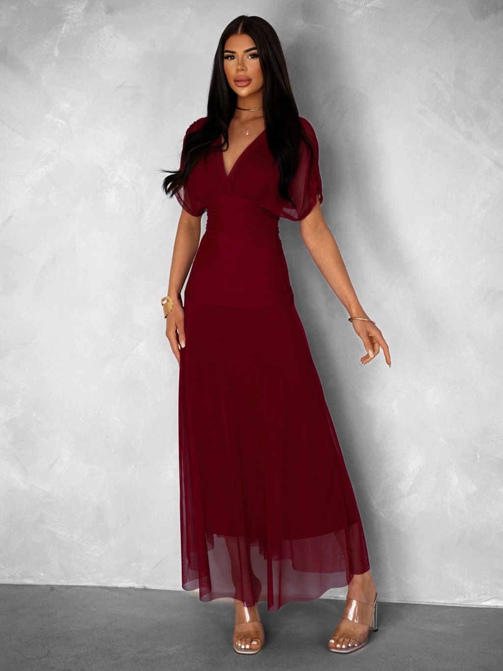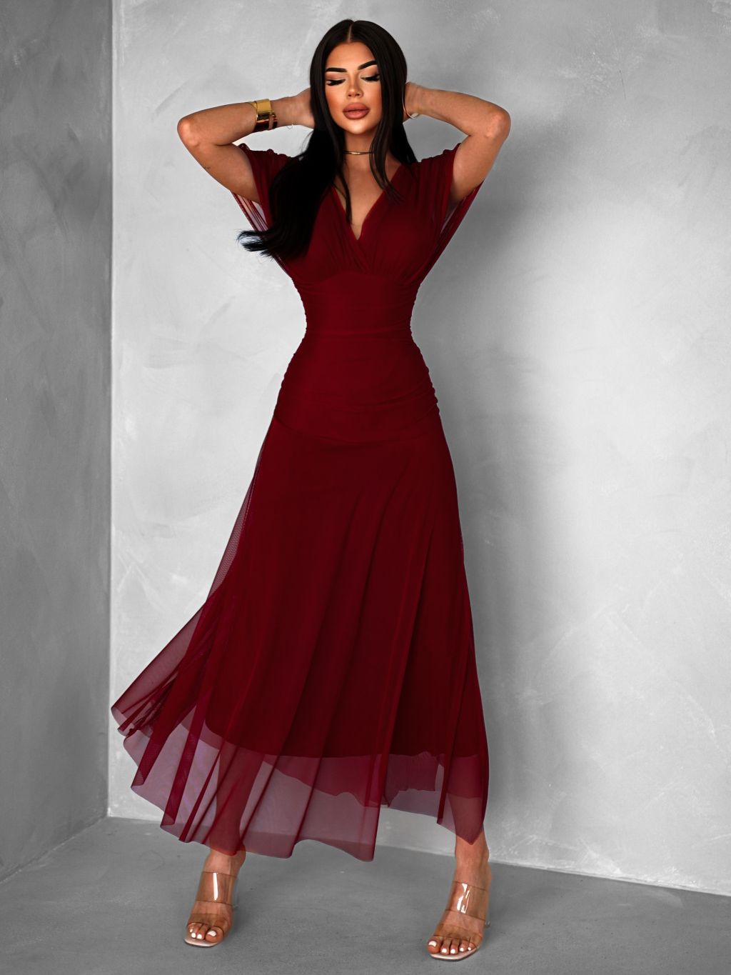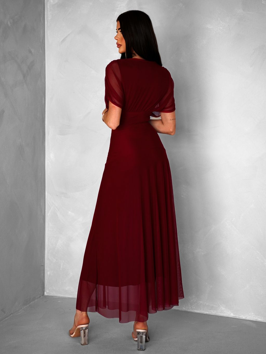 Bordó tylové dlhé spoločenské šaty VOLYADA
