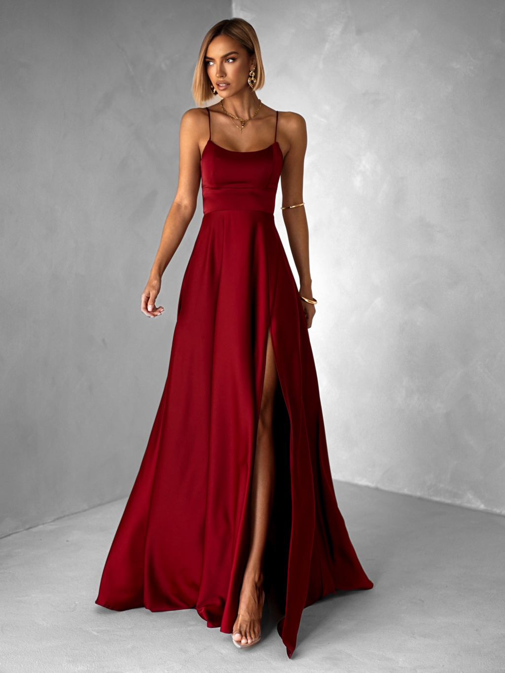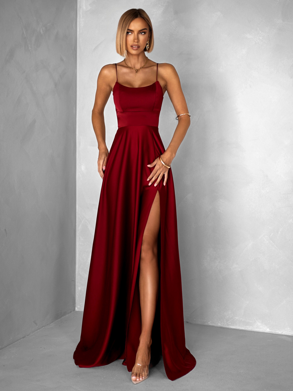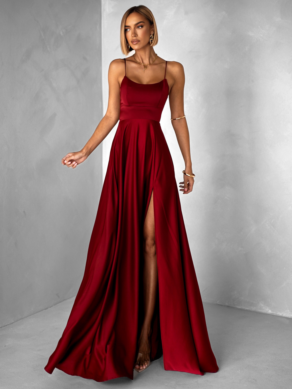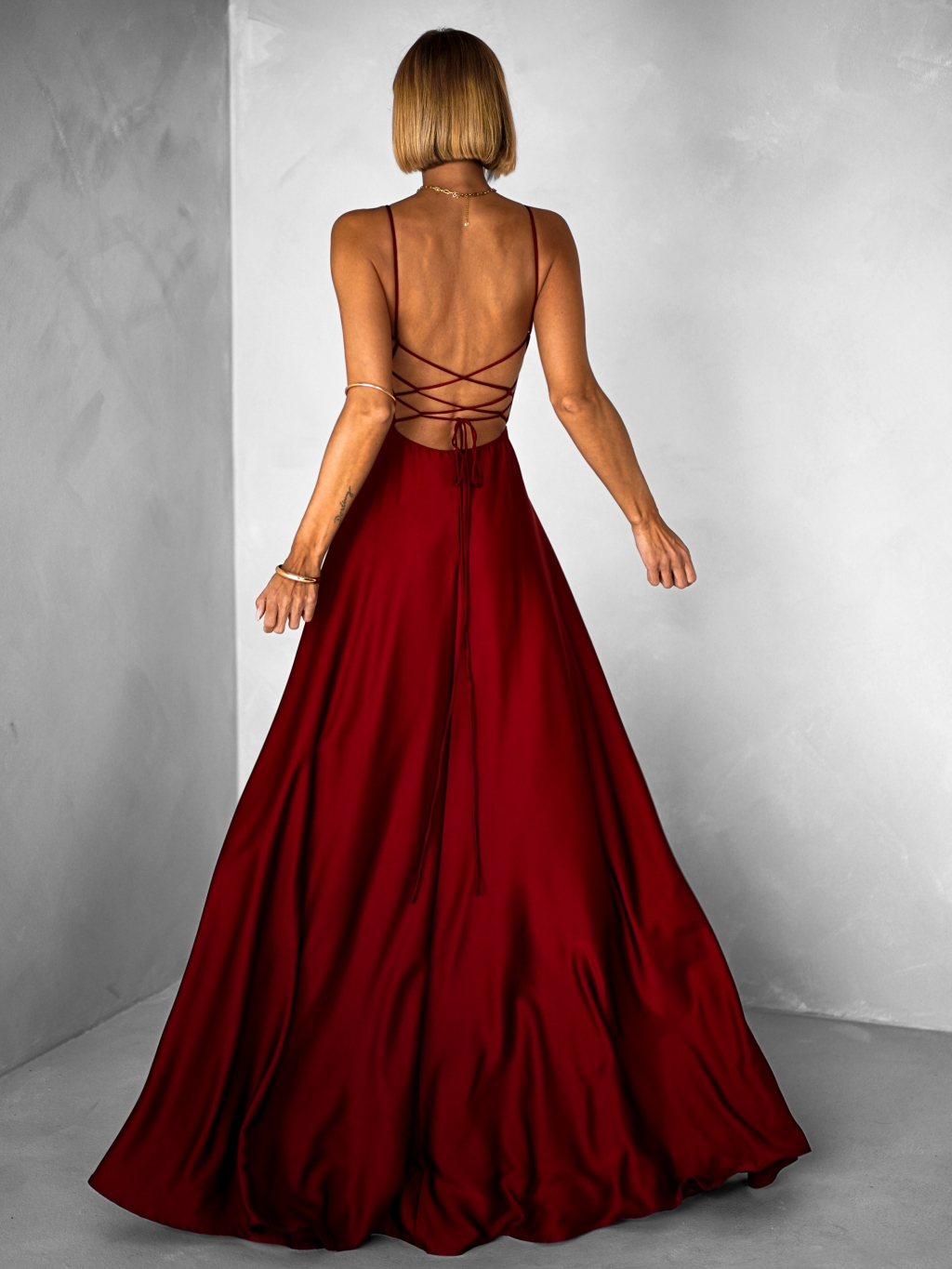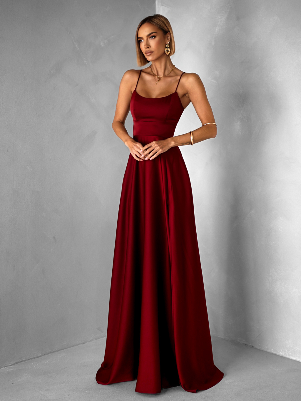 Bordové dlhé plesové šaty CELLINES so šnurovaním a rázporkom