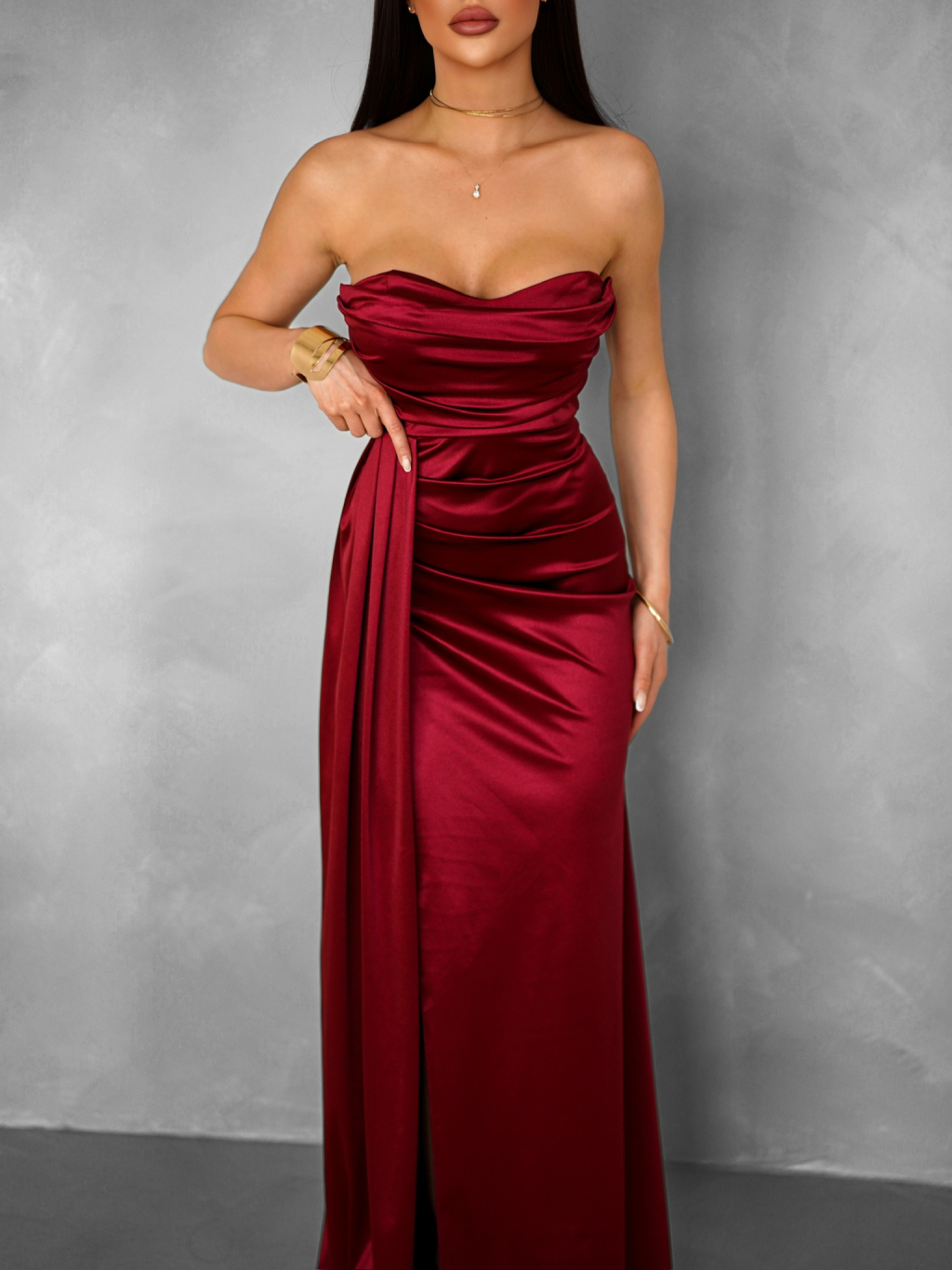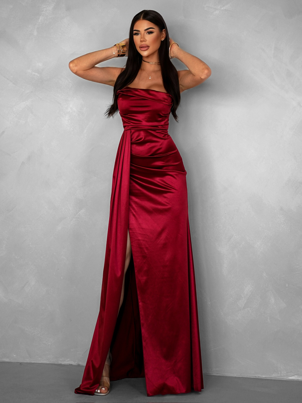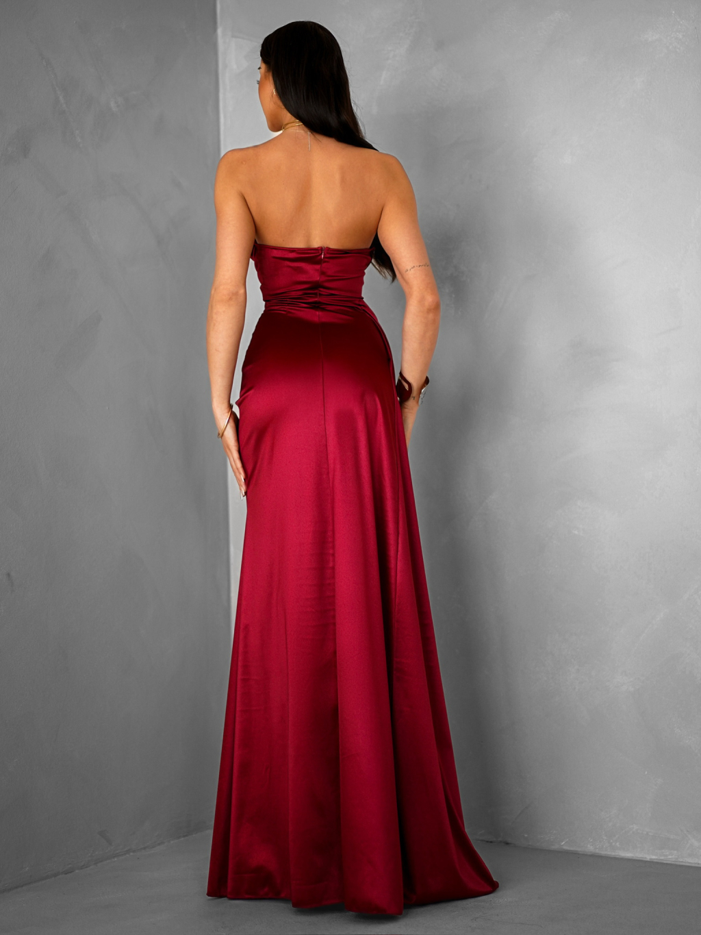Bordové dlhé saténové šaty ALITAN s korzetom