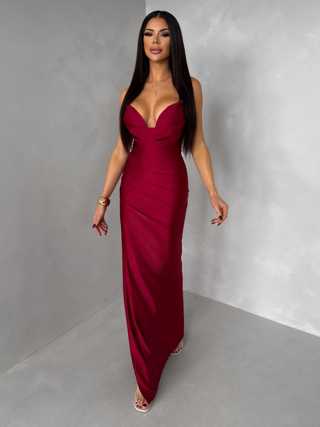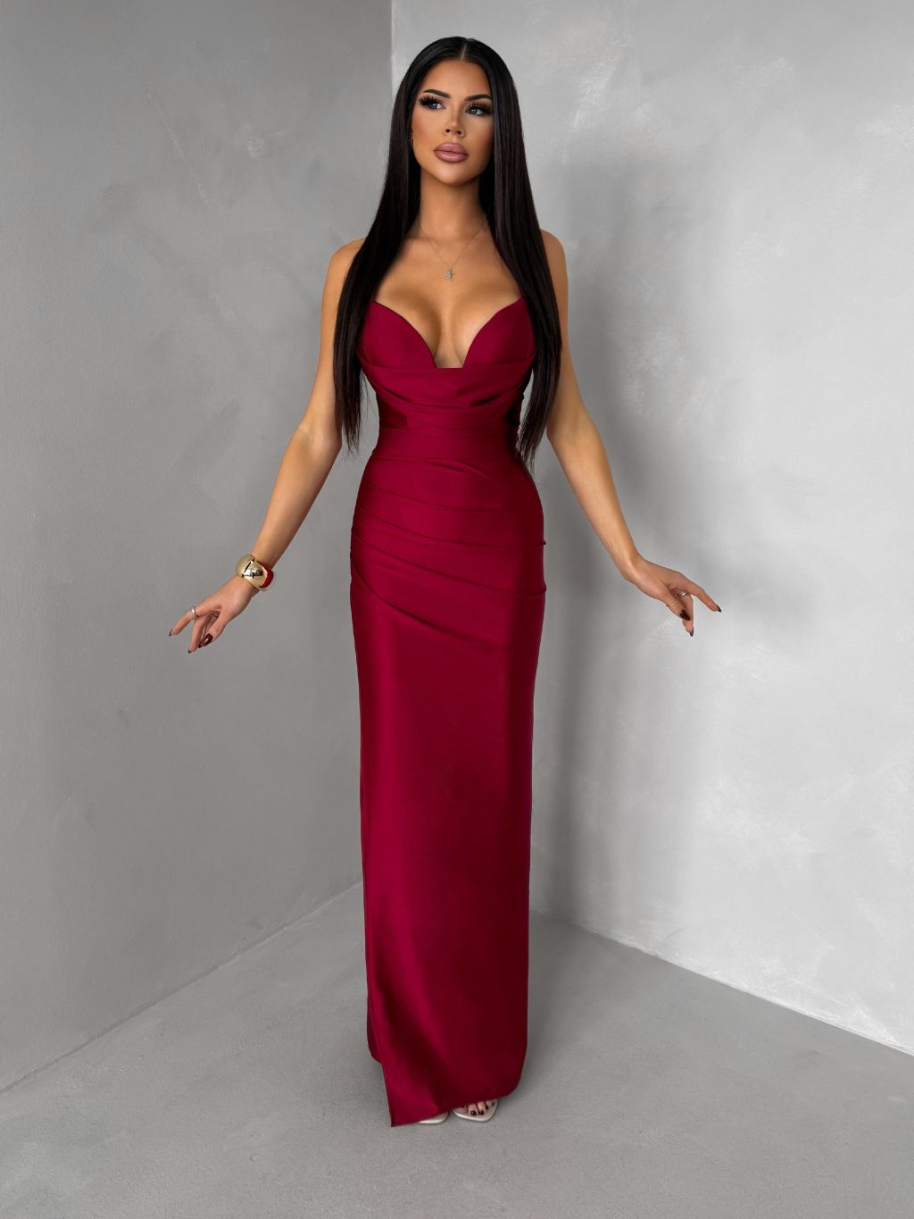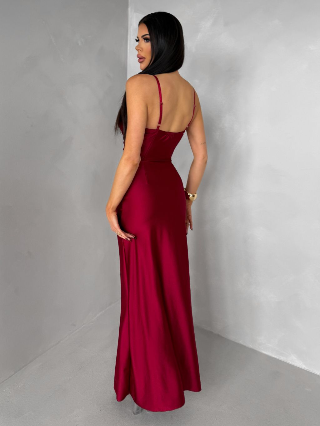 Bordové dlhé saténové spoločenské šaty ORIXY s výstrihom