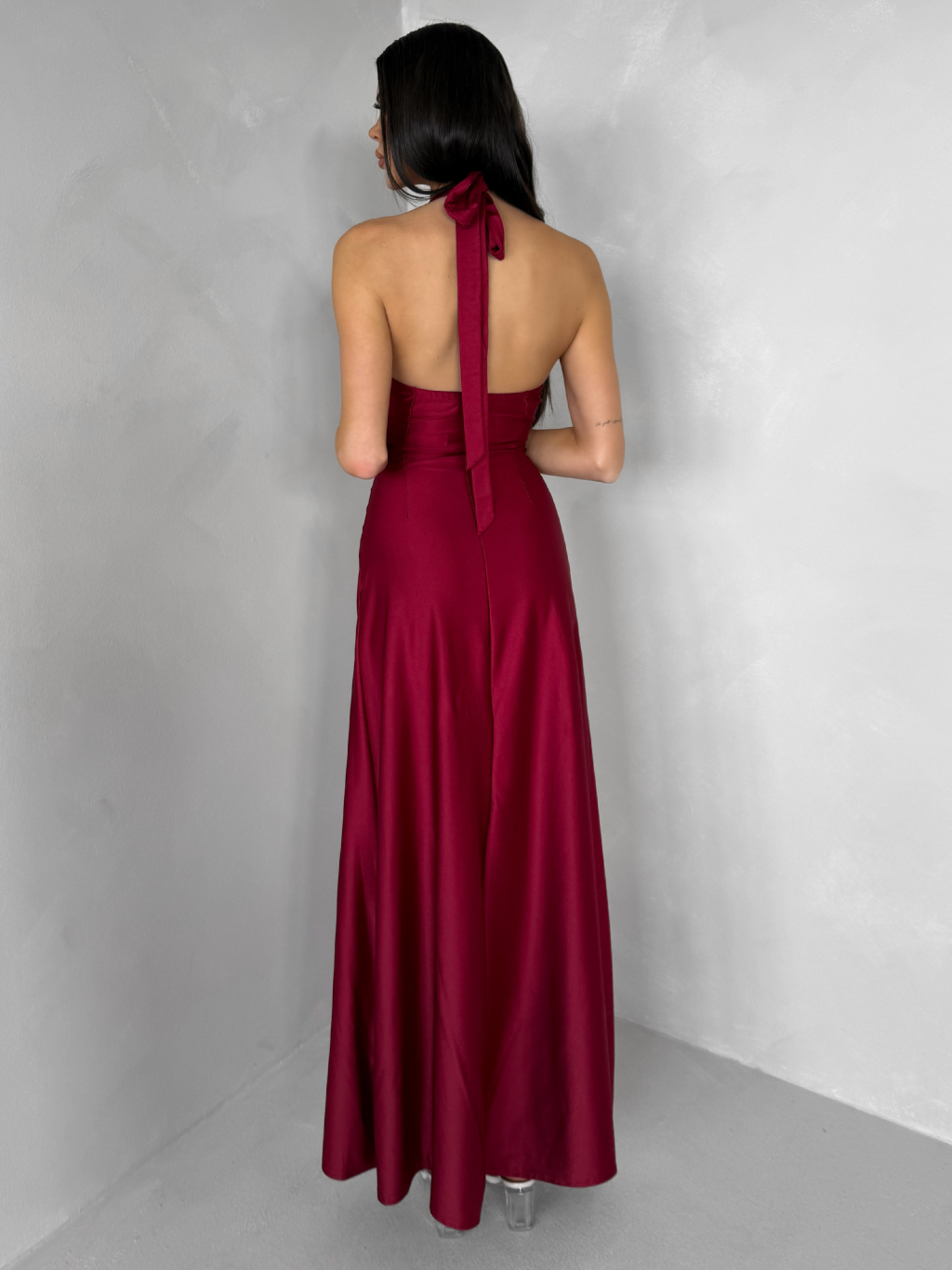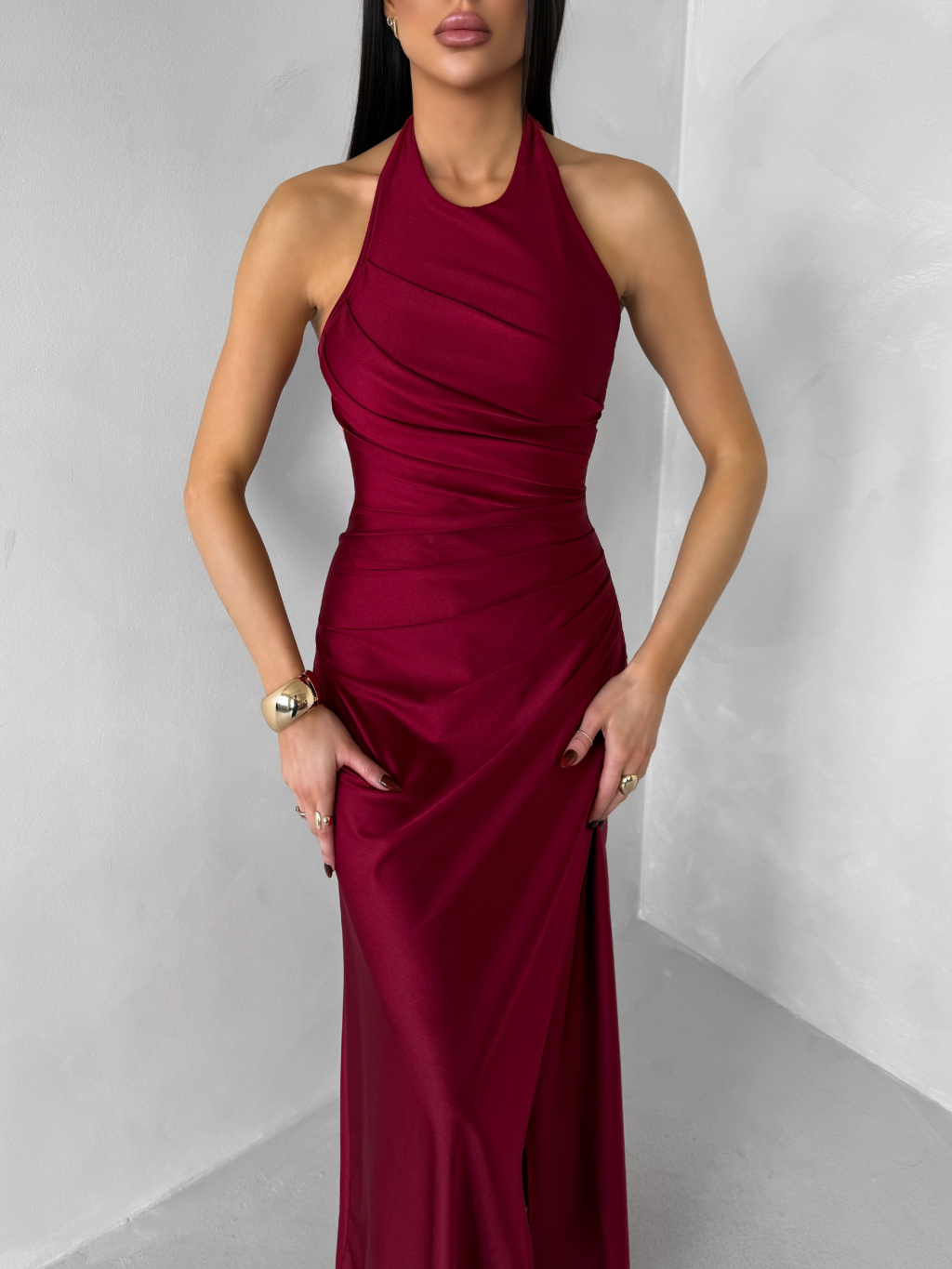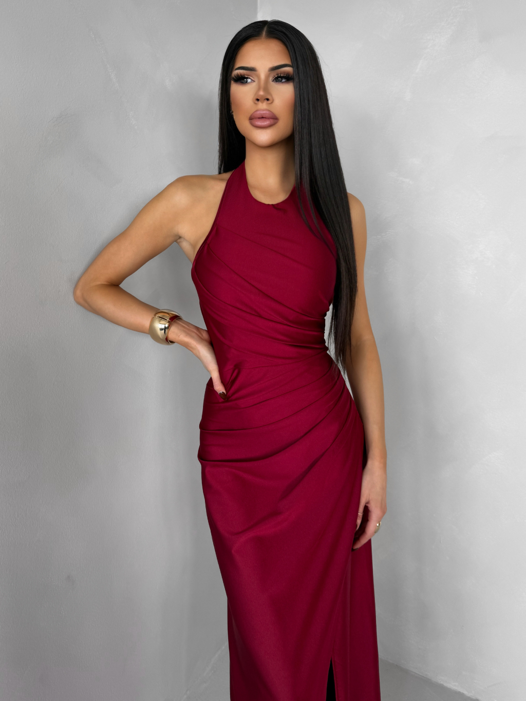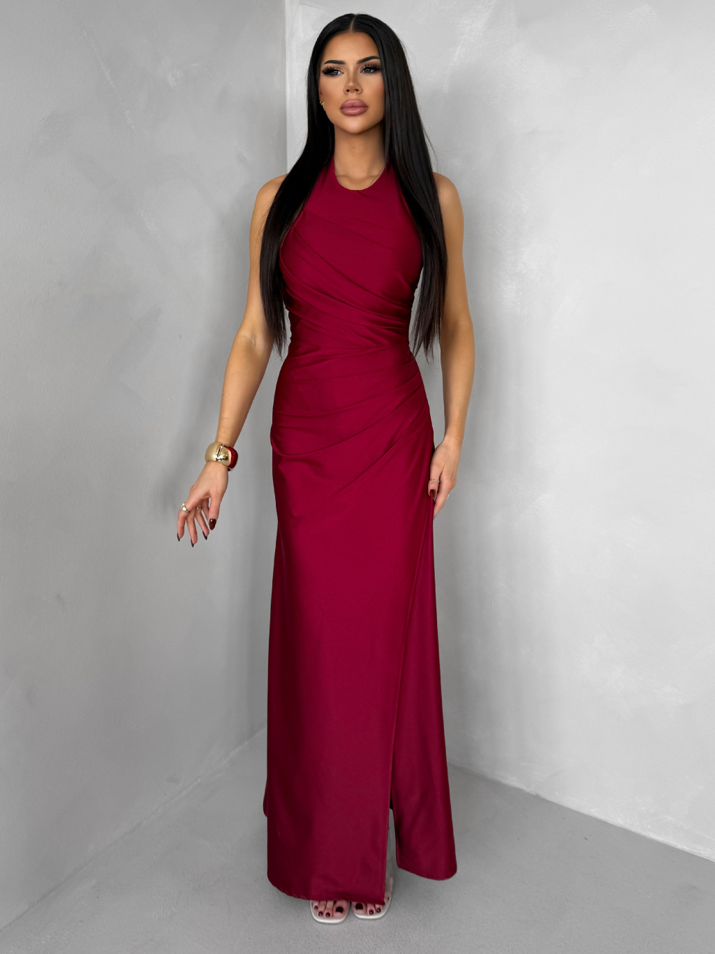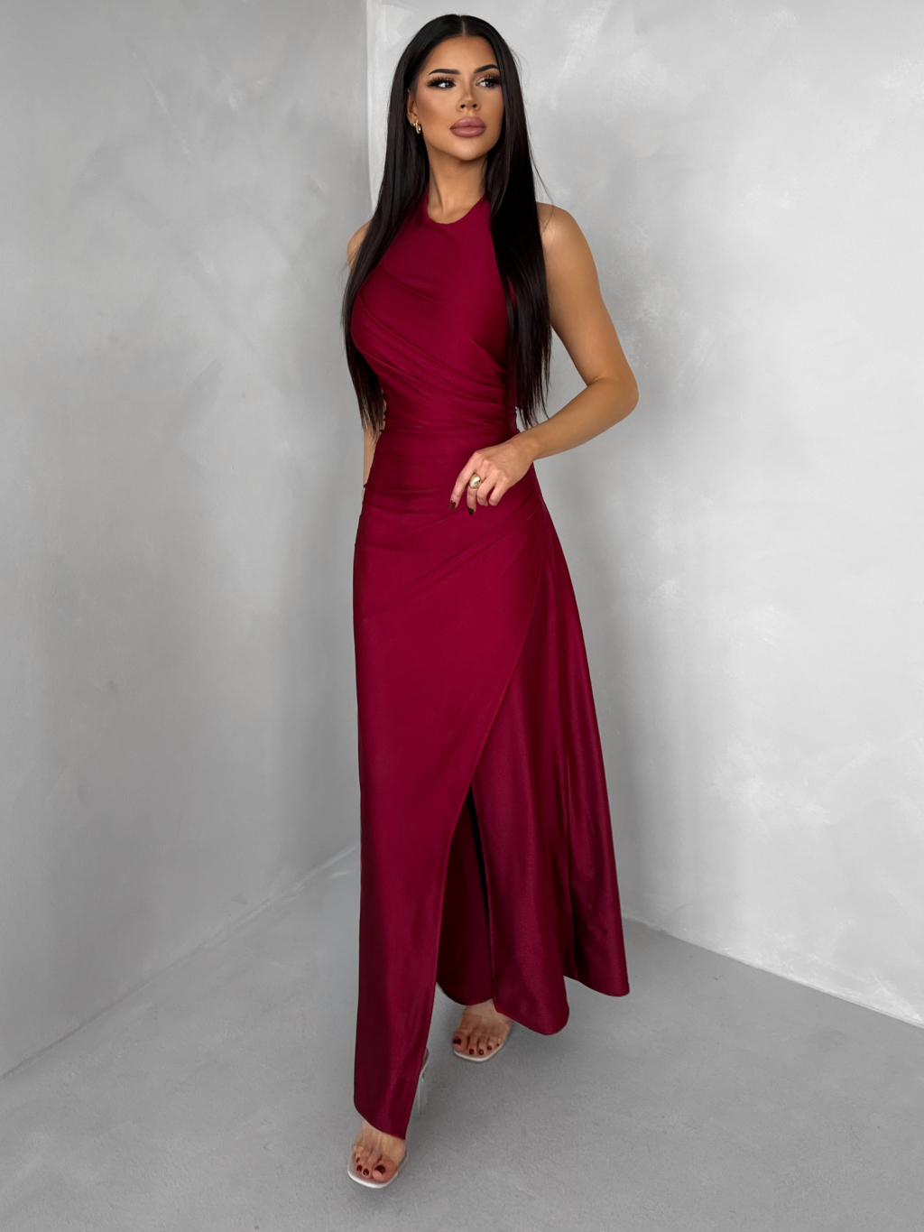 Bordové spoločenské dlhé tvarujúce šaty SYVONA s rázporkom