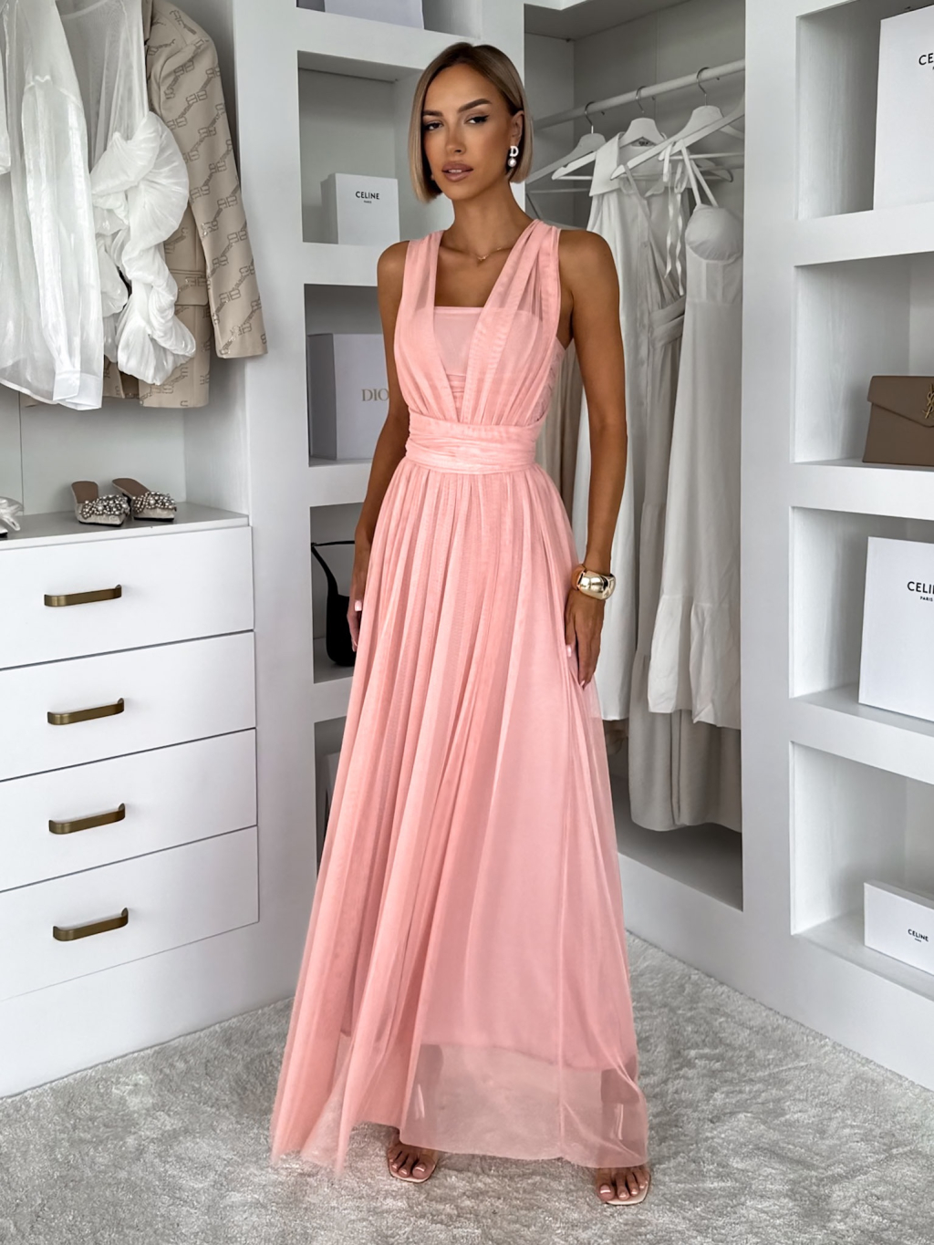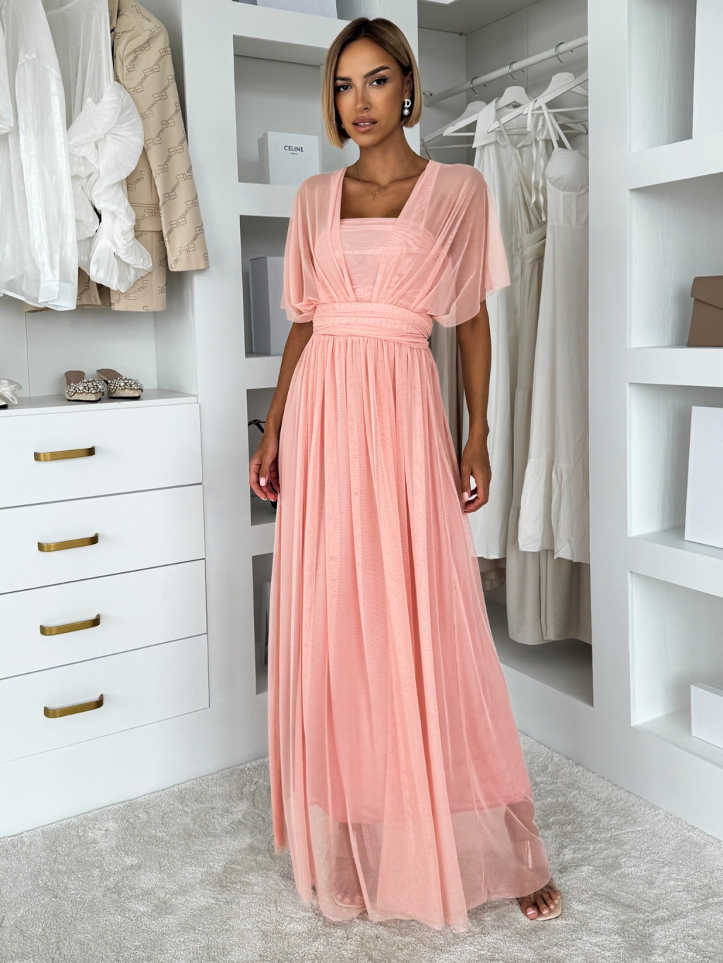 Elegantné tylové šaty s variabilným viazaním, ktoré umožňuje niekoľko spôsobov nosenia.