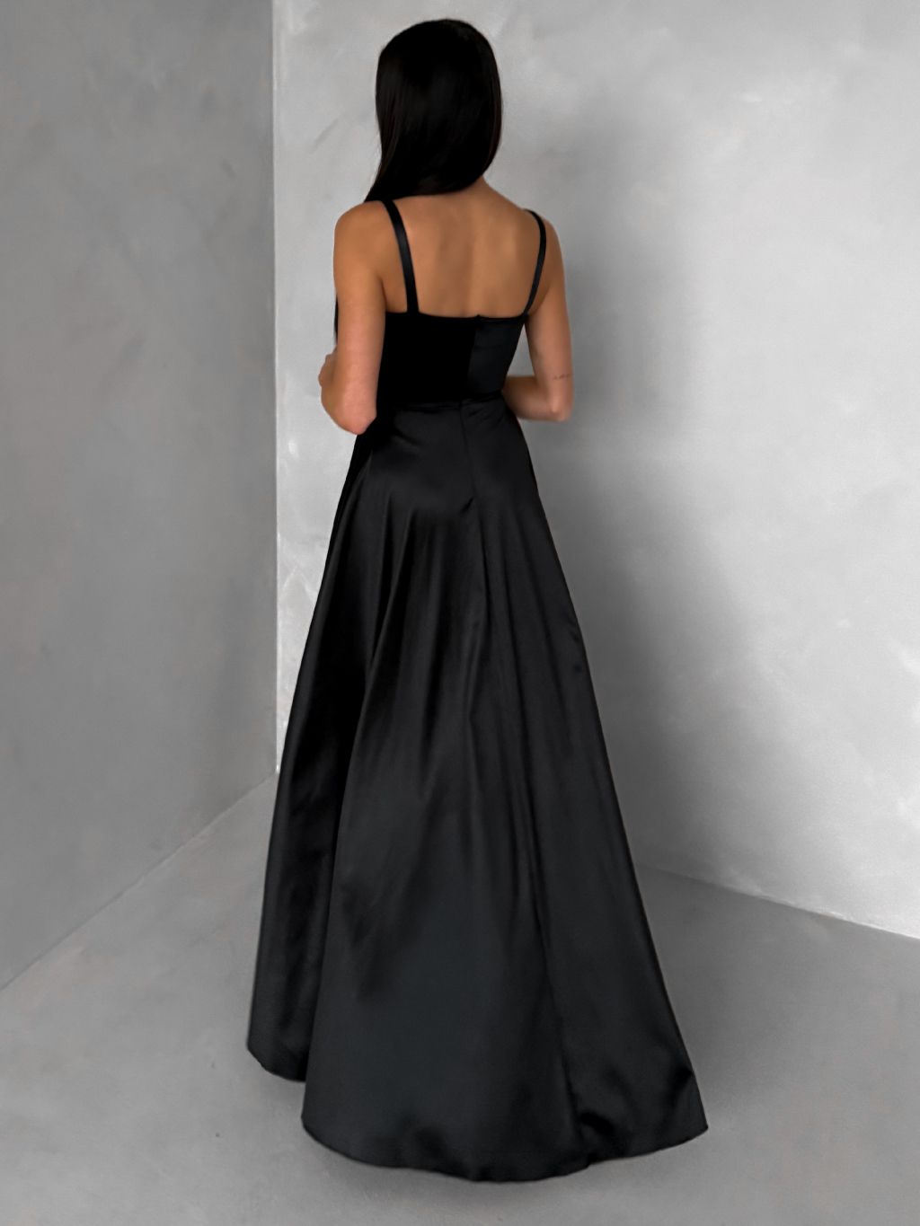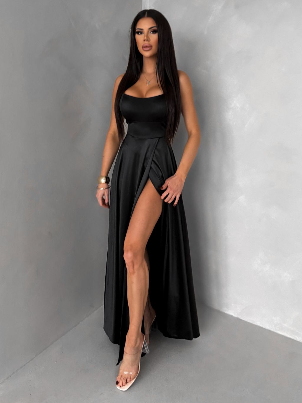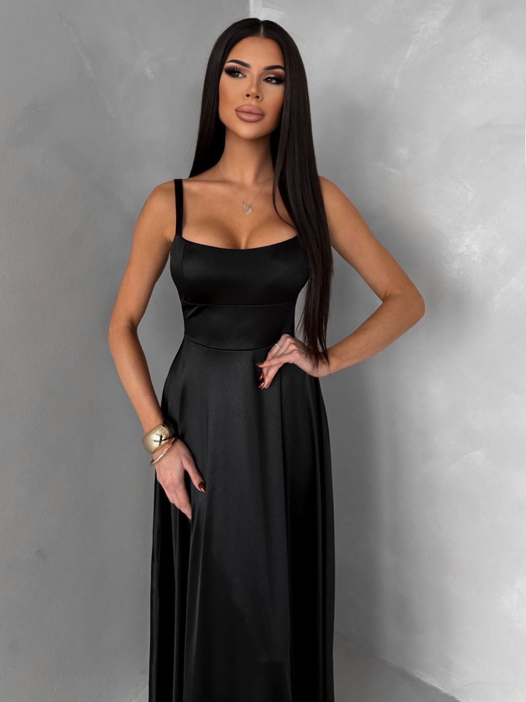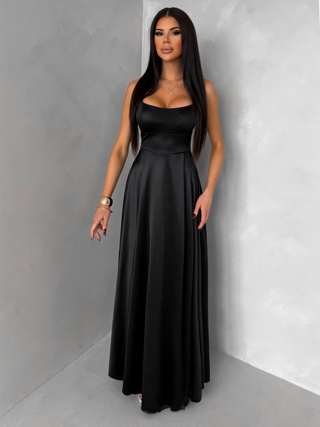 Čierne dlhé saténové spoločenské šaty HELSIN na ramienka