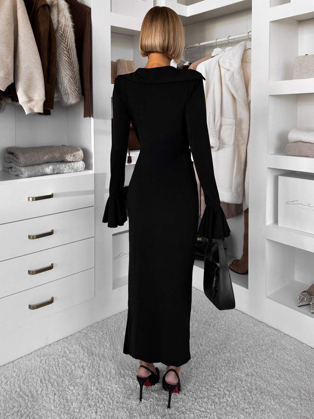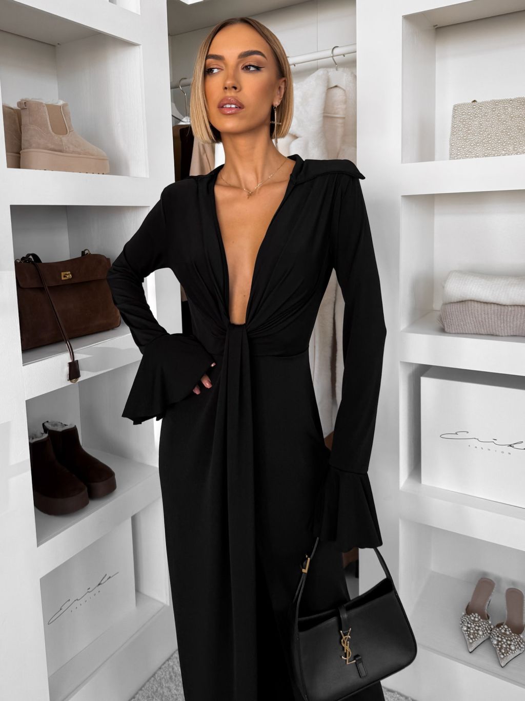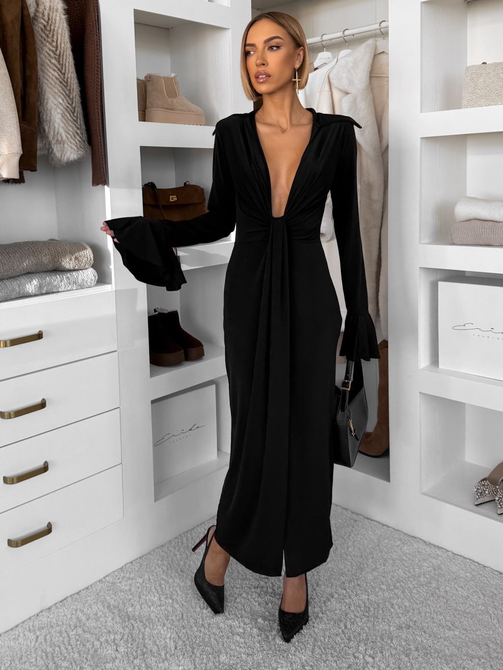 Čierne dlhé šaty OSTIVEN s hlbovým výstrihom