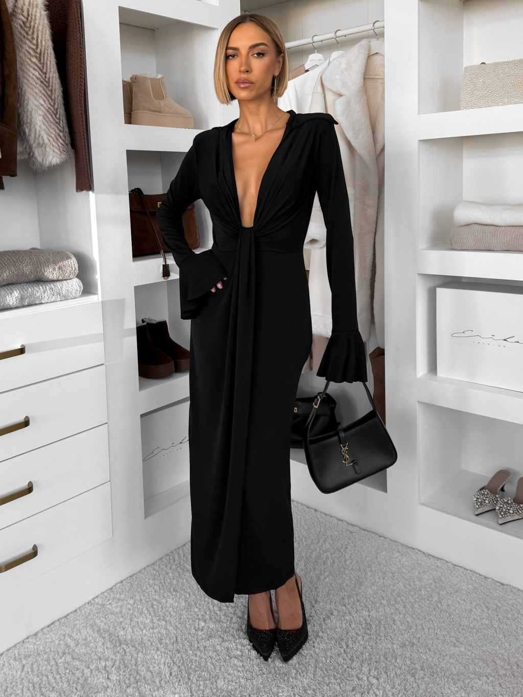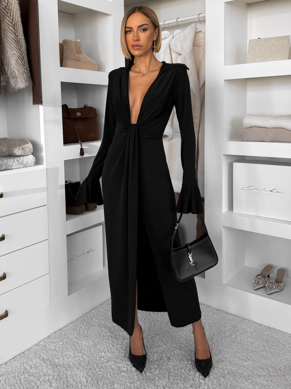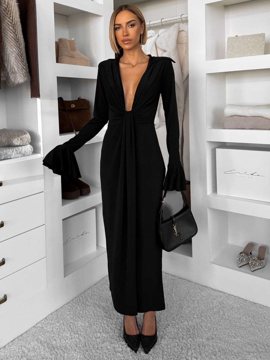 Čierne dlhé šaty OSTIVEN s hlbovým výstrihom