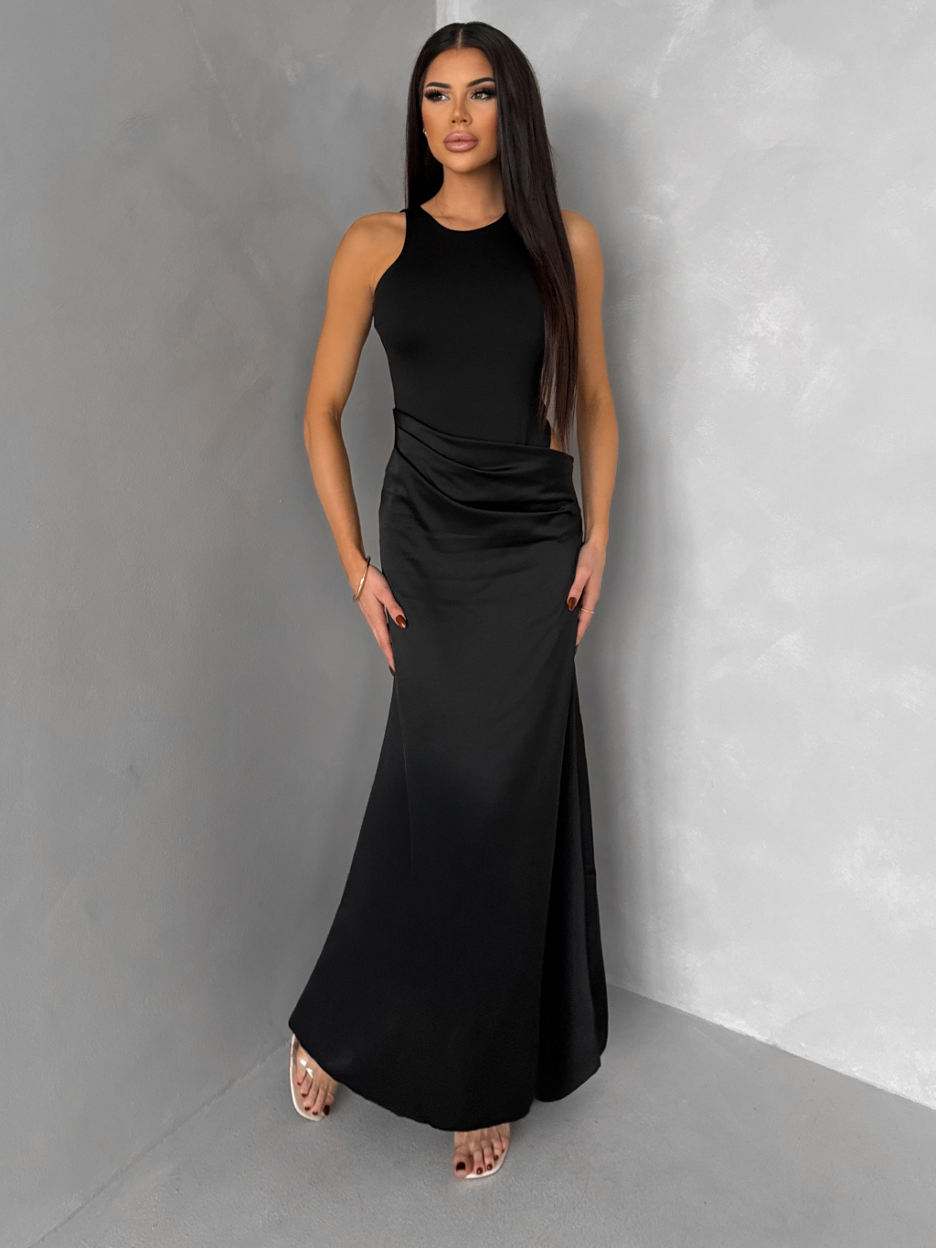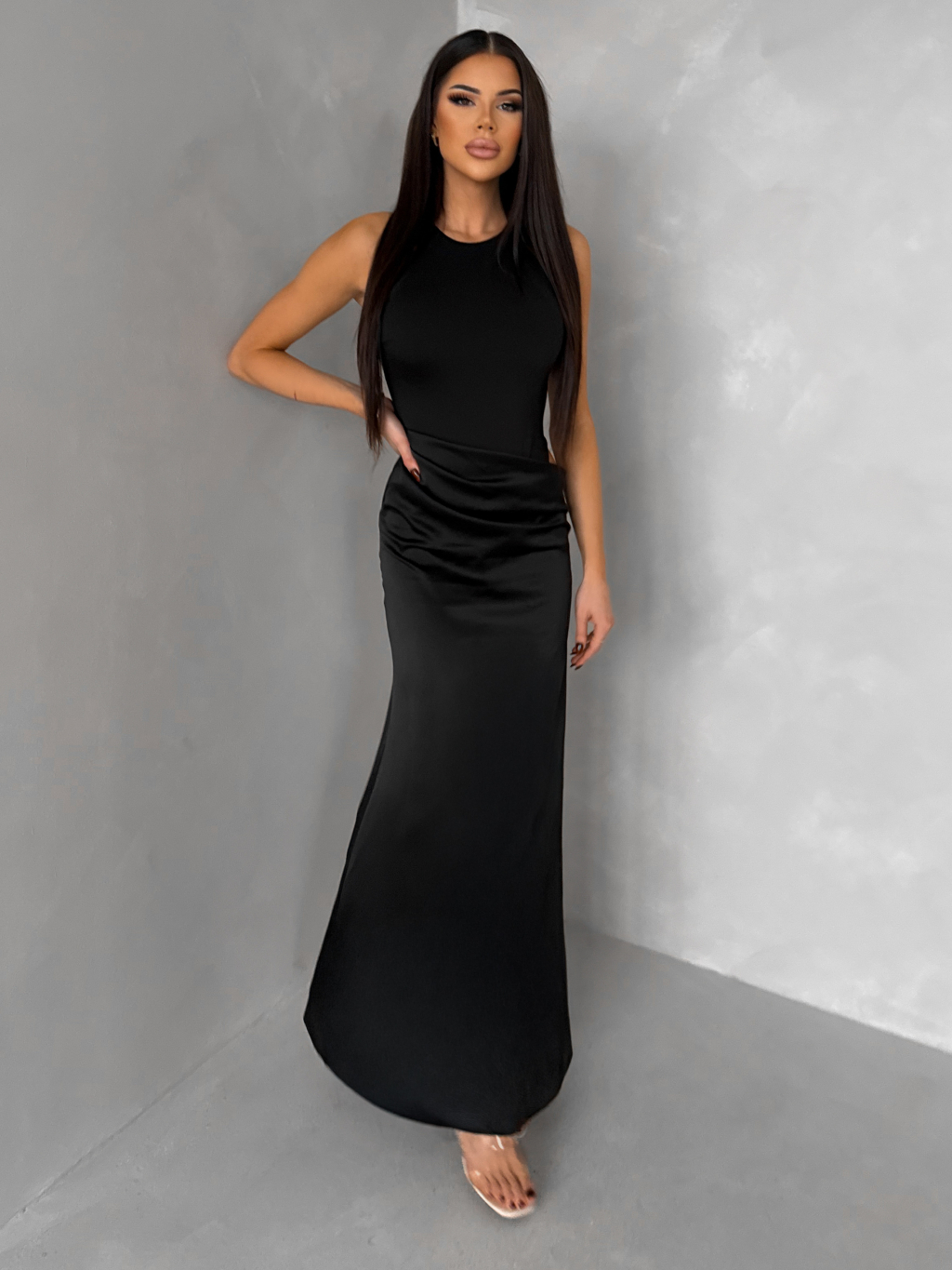 Čierne elegantné saténové šaty VEĽMORO s bodmi
