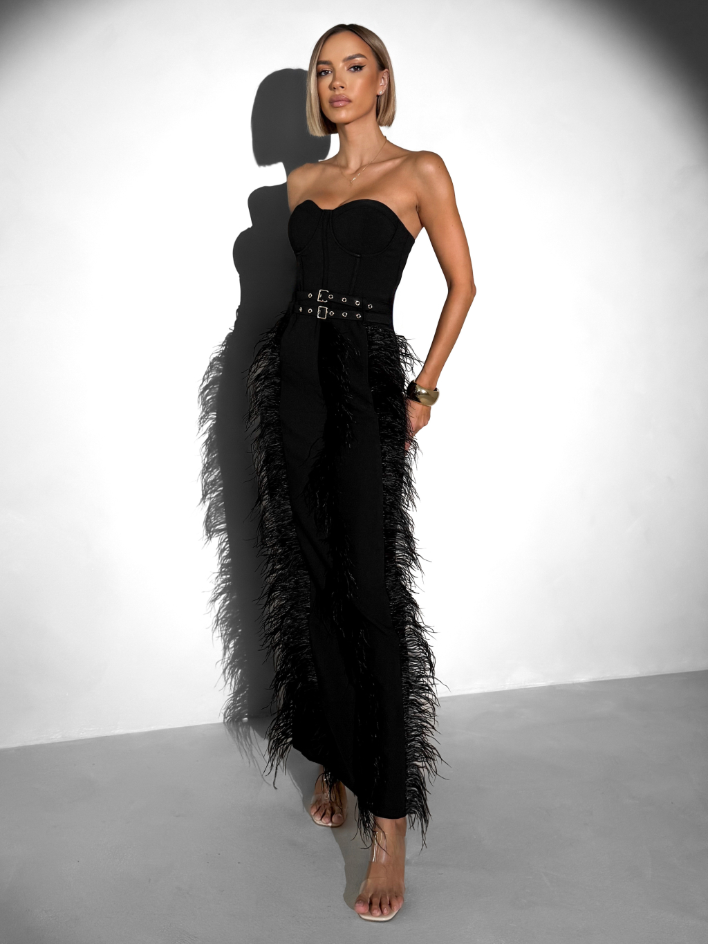 Čierne elegantné vypasované šaty TERINIA s pierkami