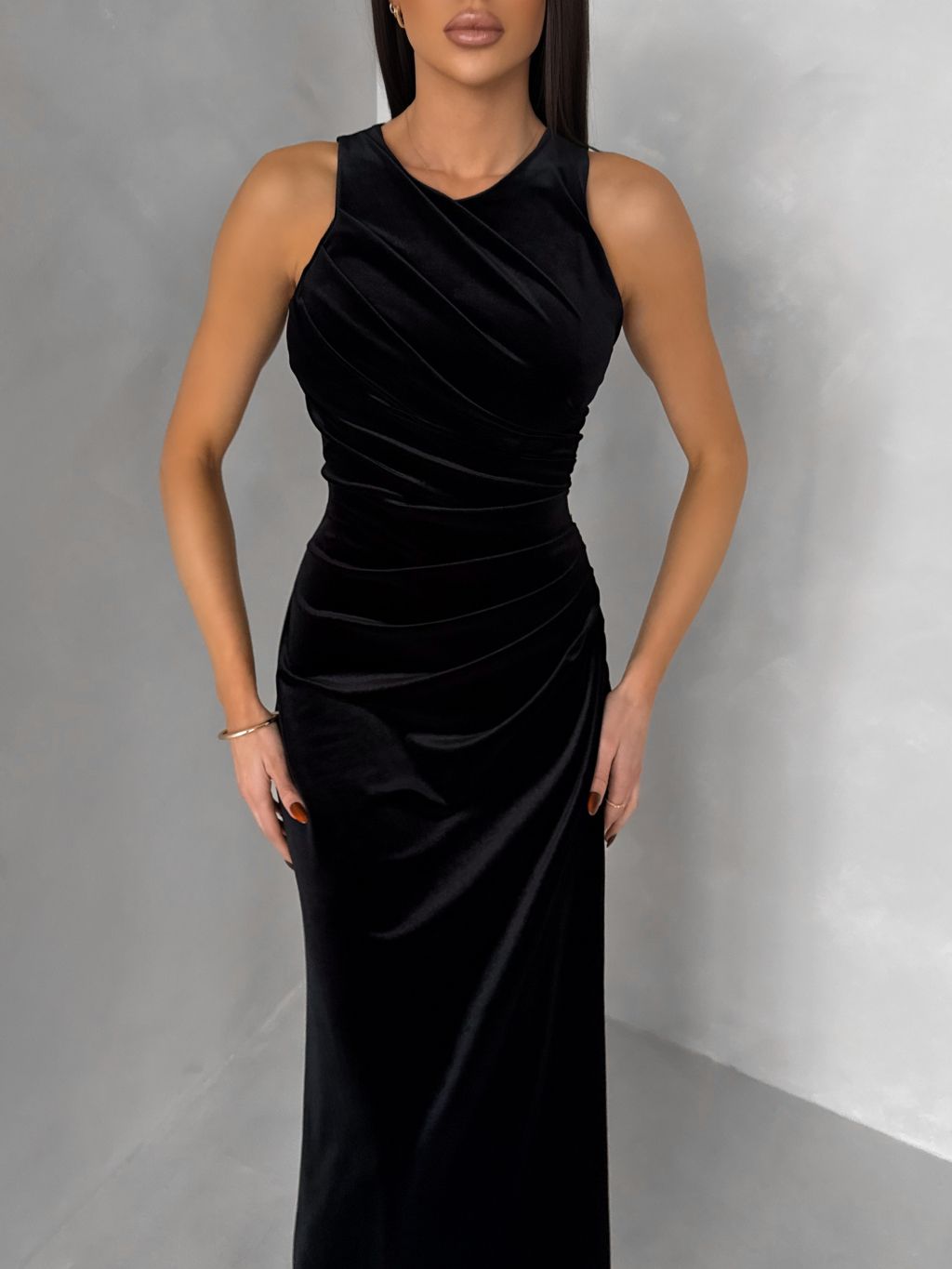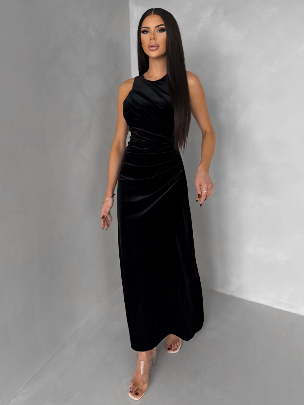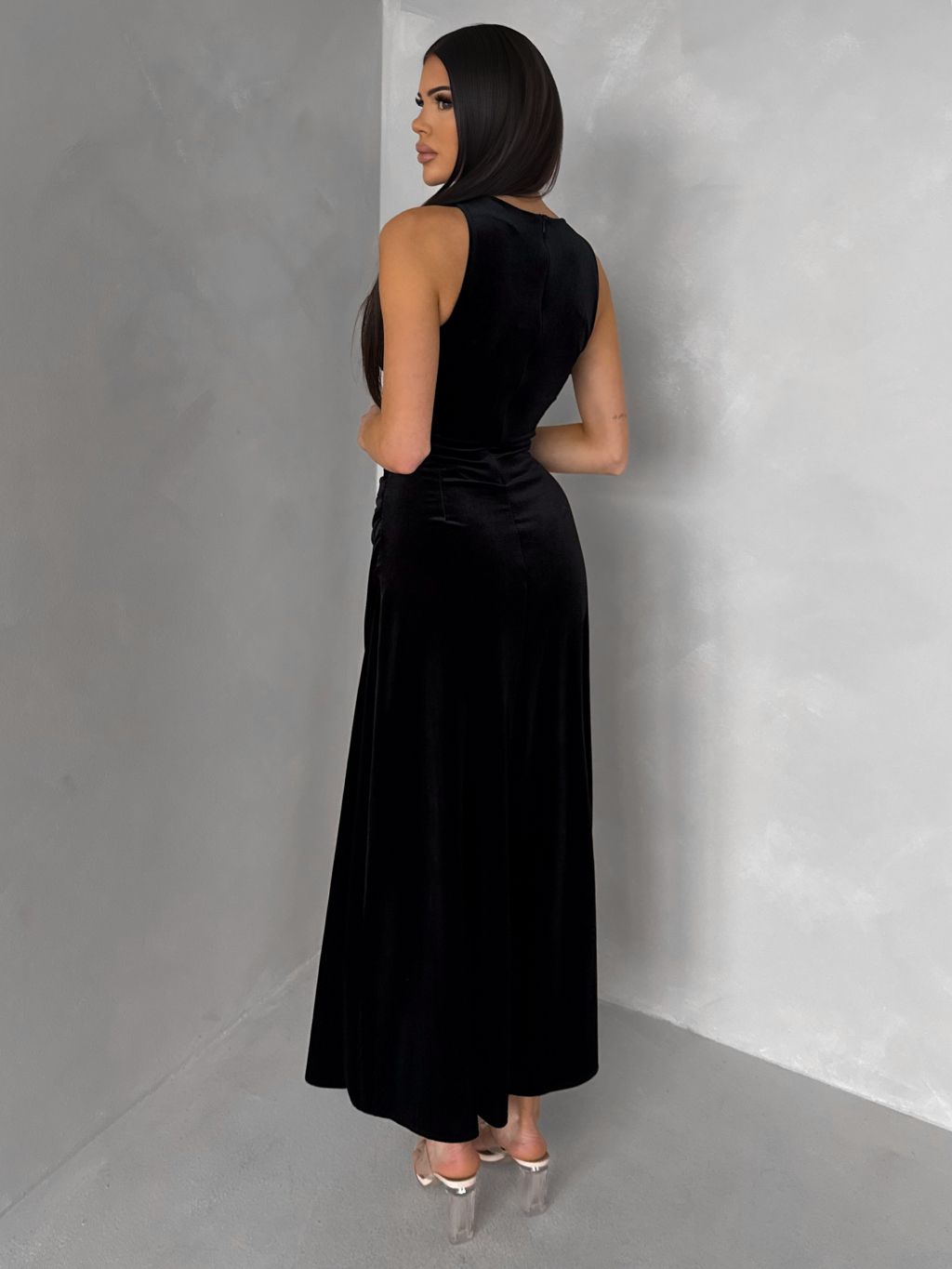 Čierne elegantné zamatové spoločenské šaty SOVENTY s rázporkom