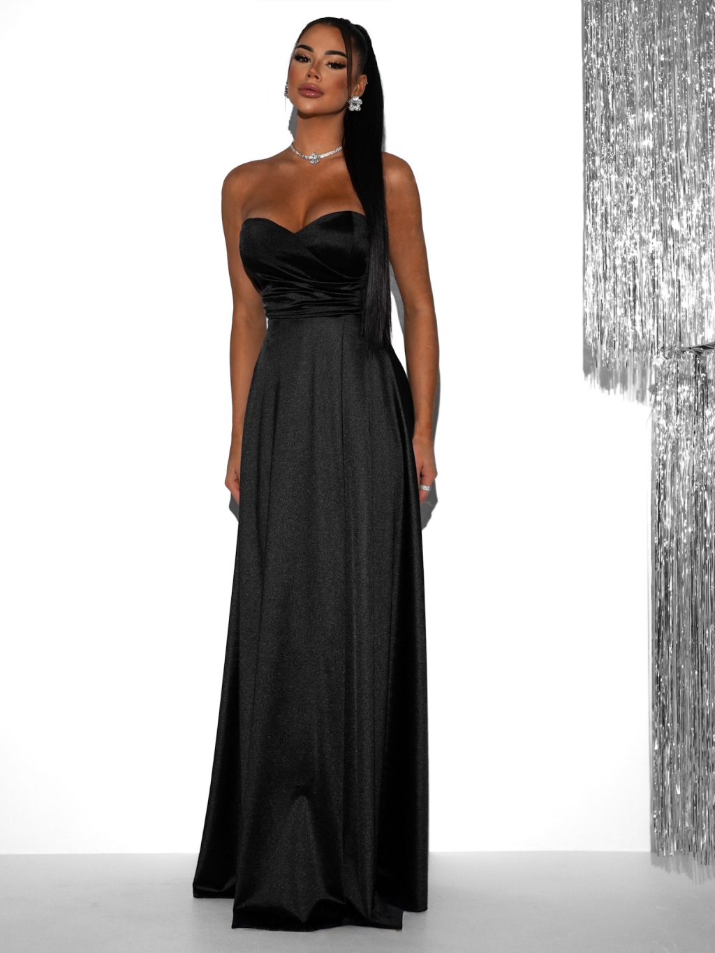 Čierne saténové dlhé šaty SYCHAEUS bez ramienok