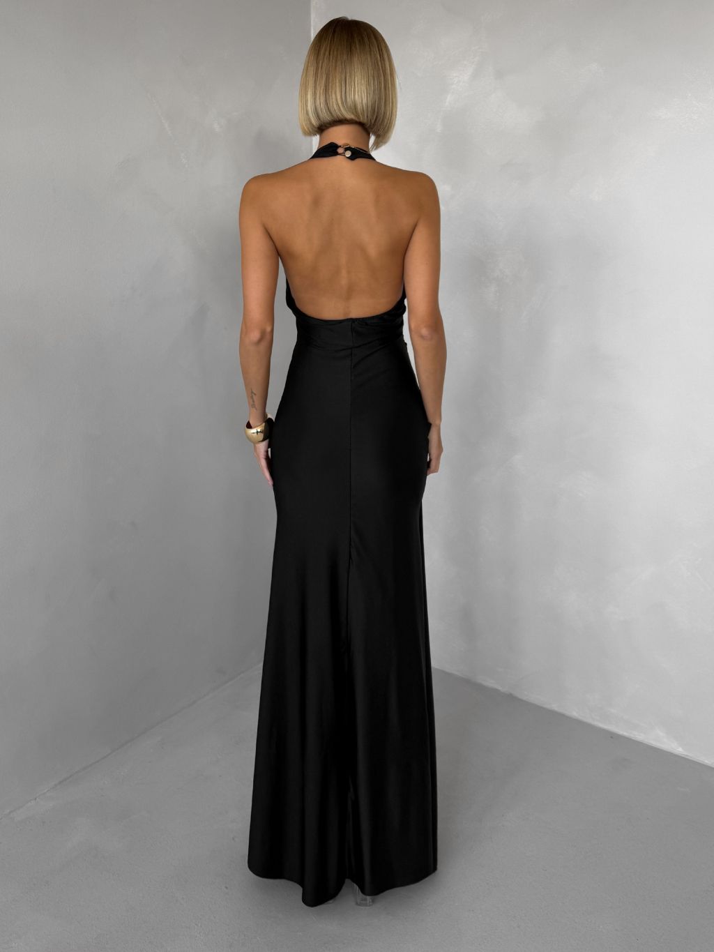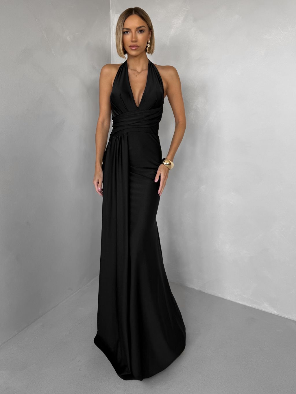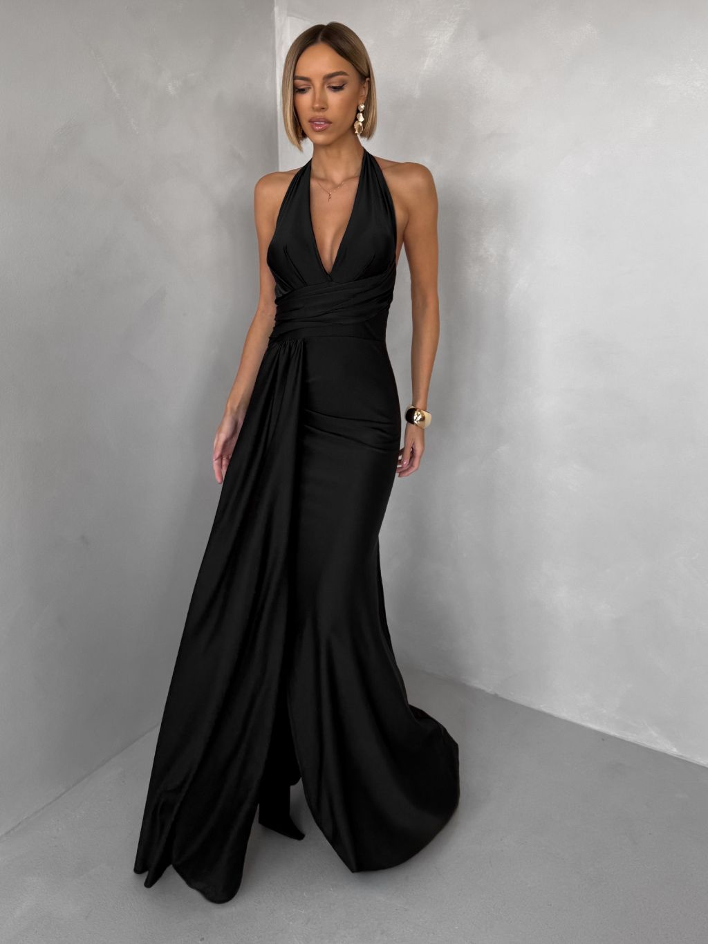 Čierne saténové spoločenské dlhé šaty CELESTIA s vlečkou