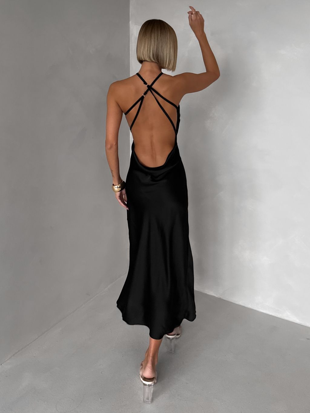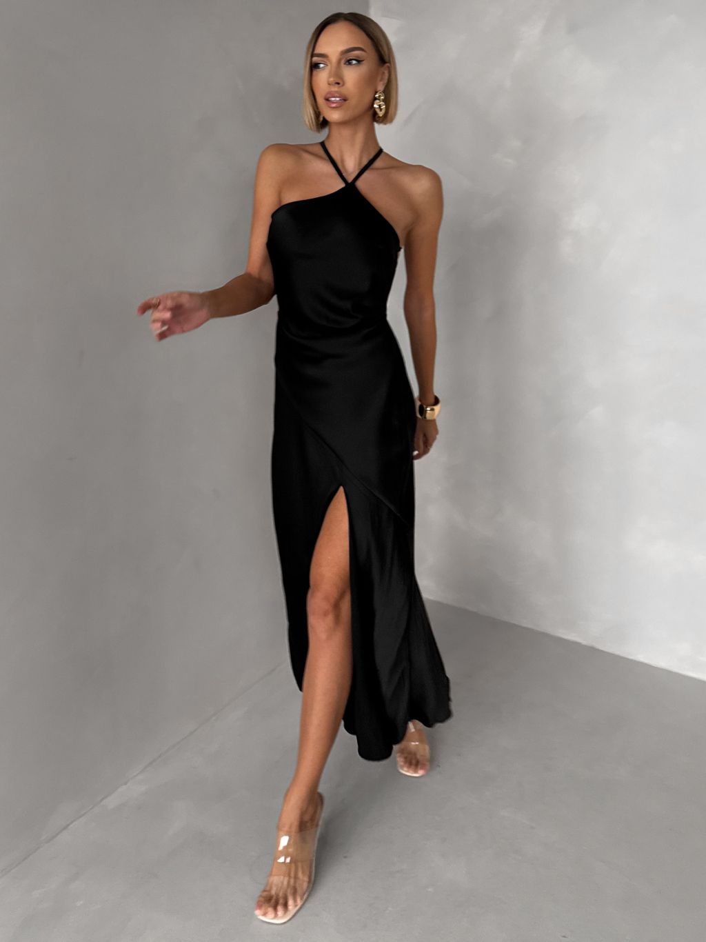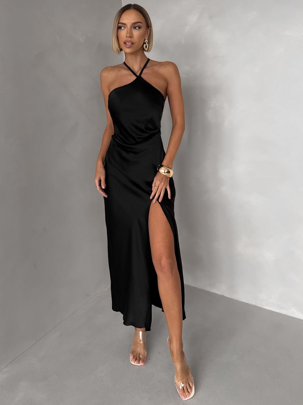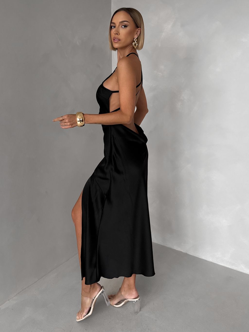 Čierne saténové spoločenské šaty ELIRON s rázporkom