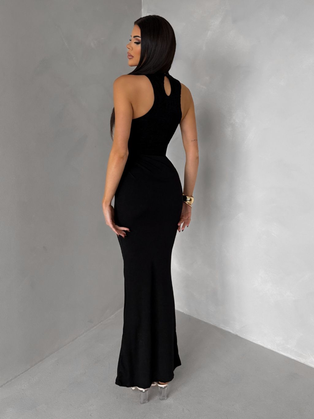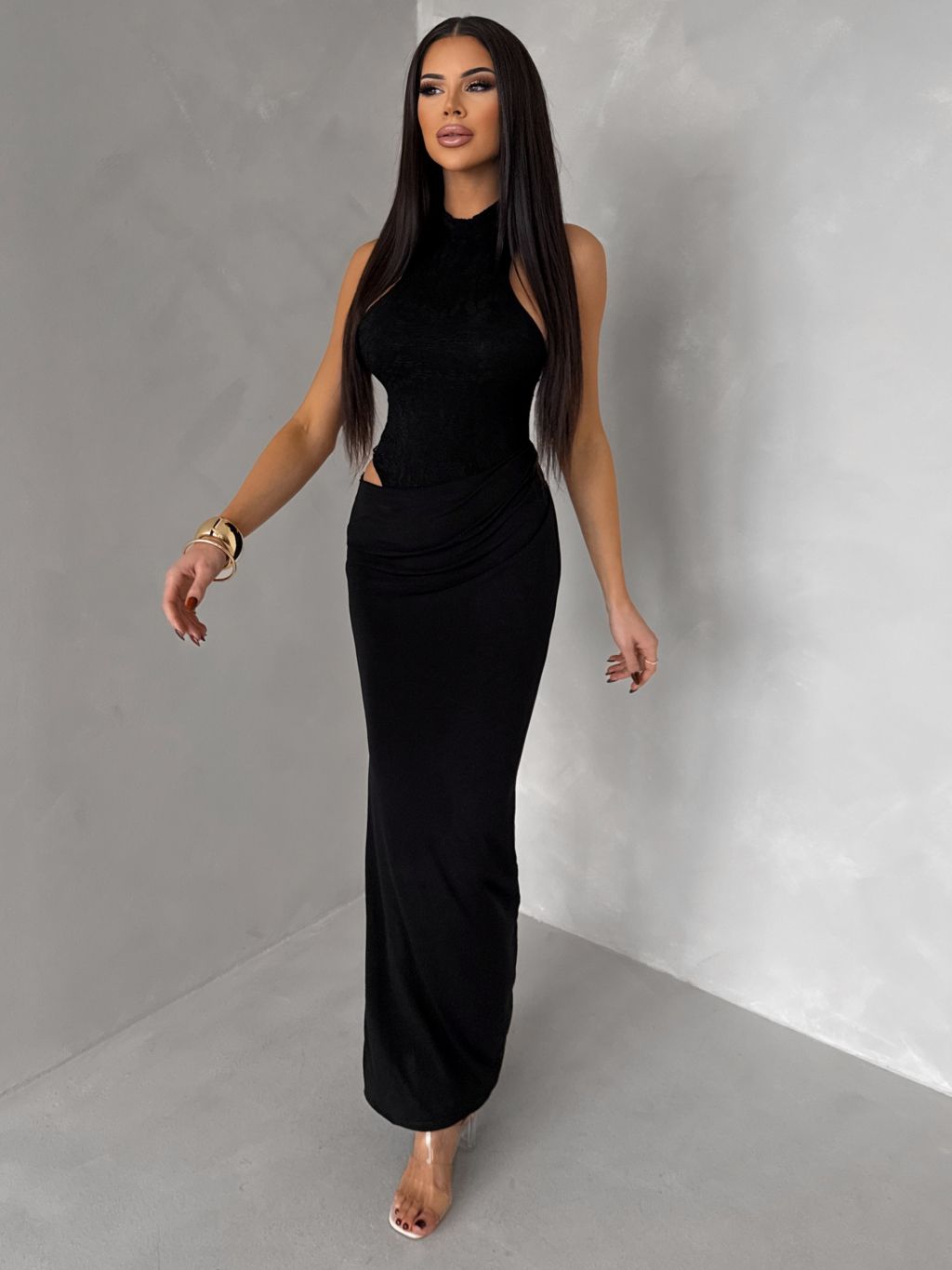 Čierne spoločenské dlhé šaty OLIVIEN s bodmi