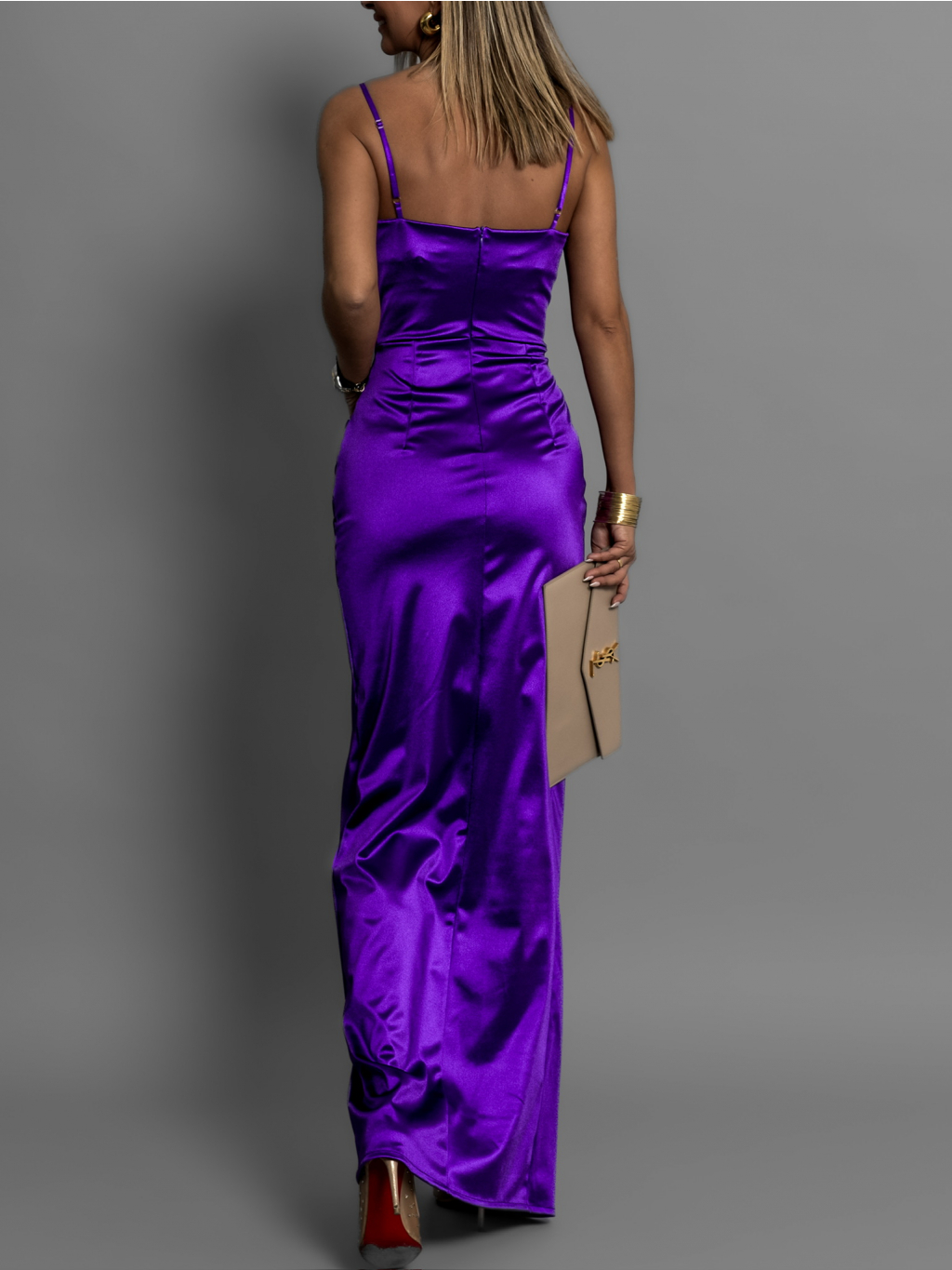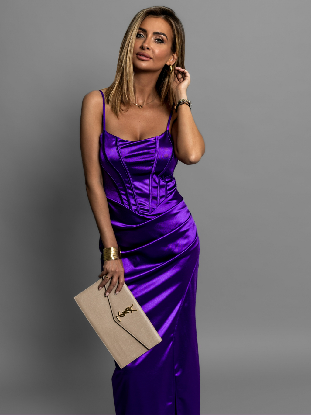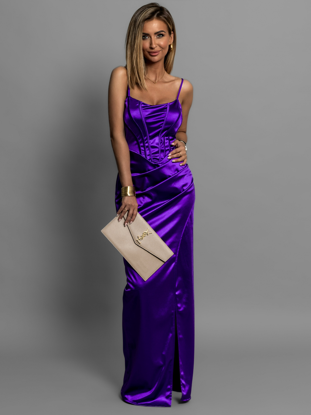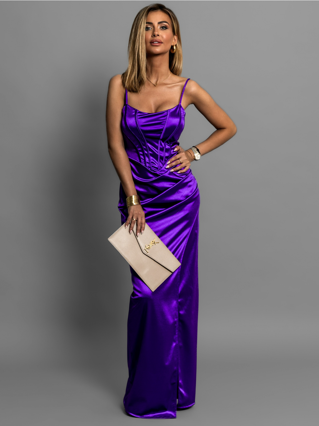 Fialové saténové dlhé šaty ADOLFINA s korzetom